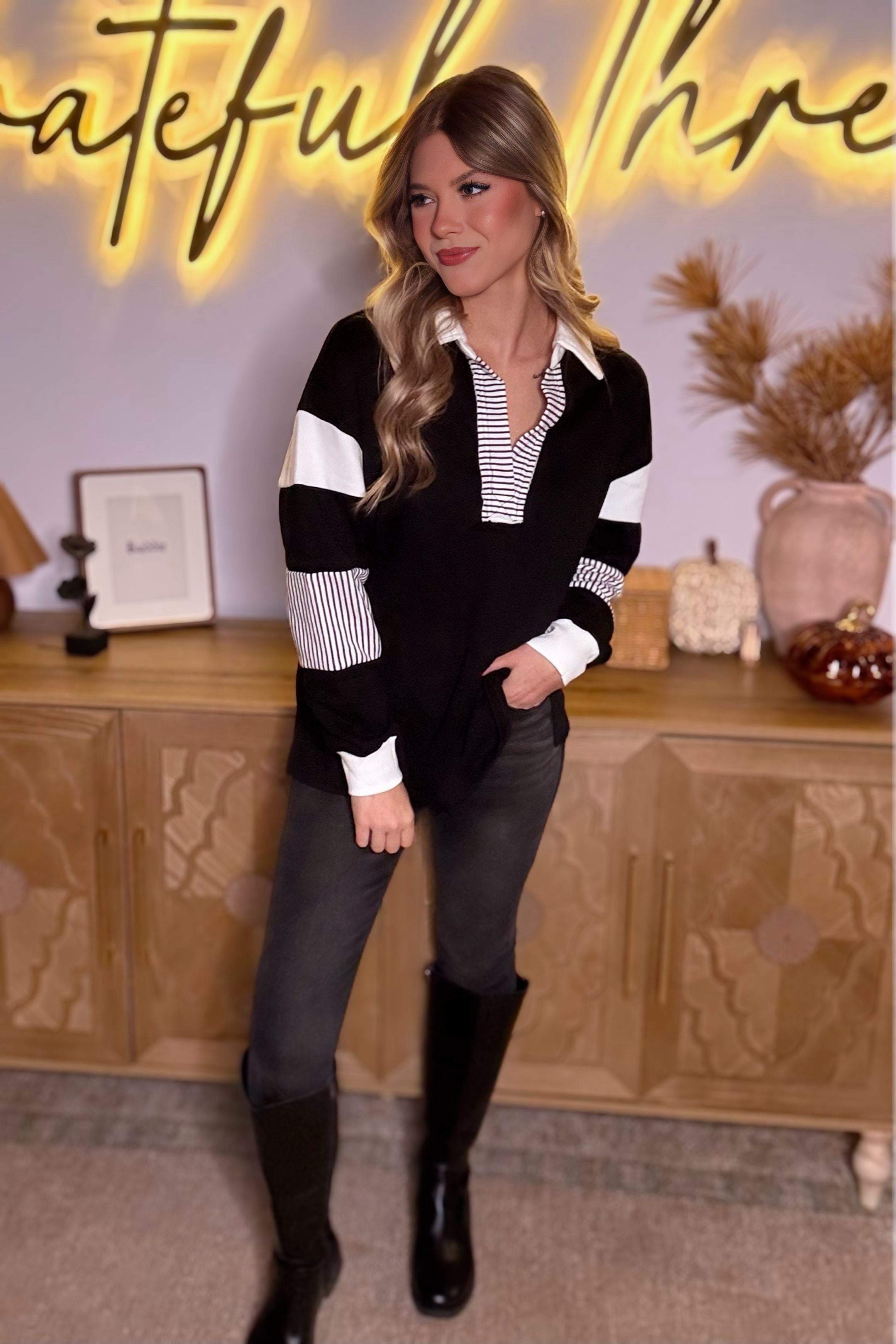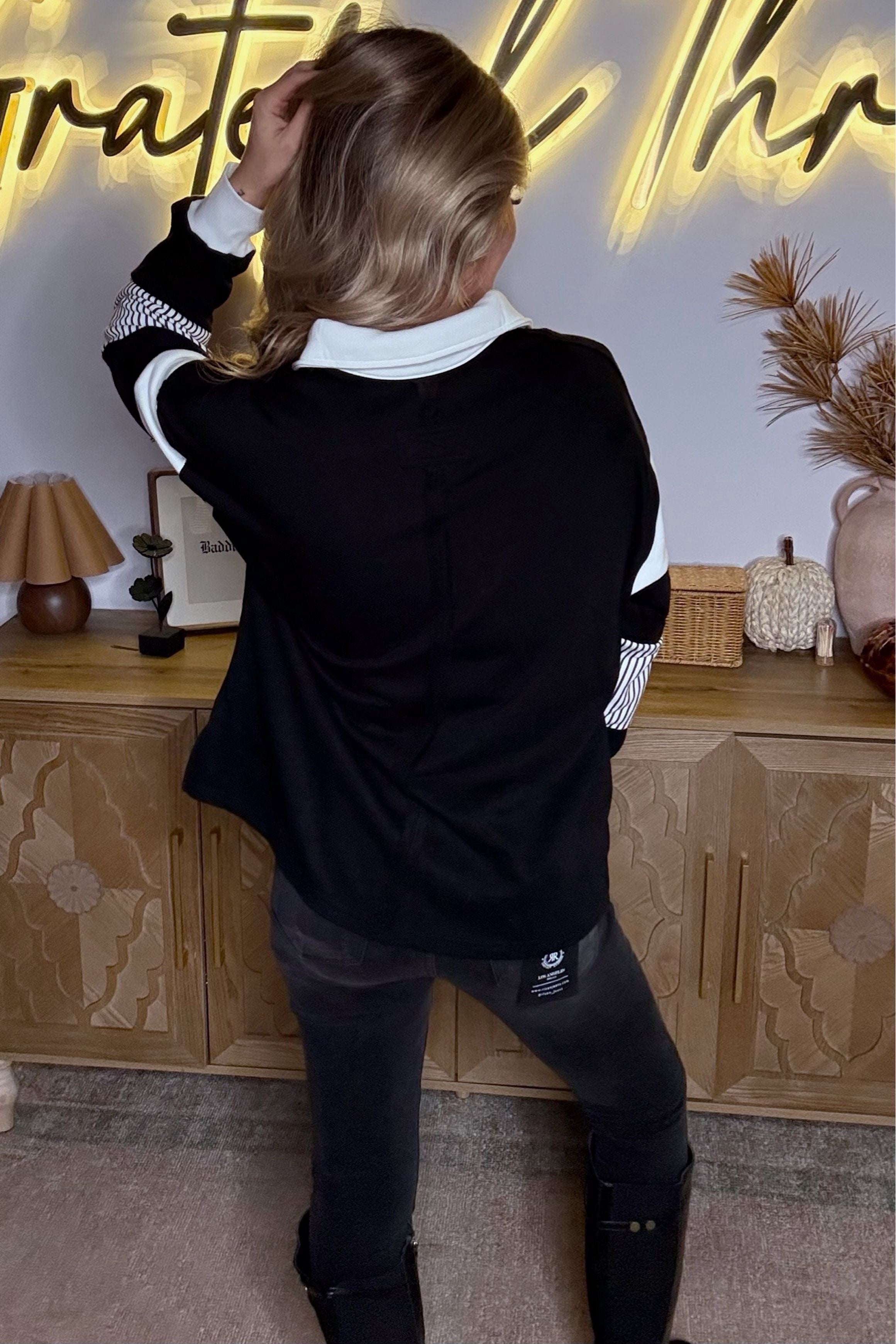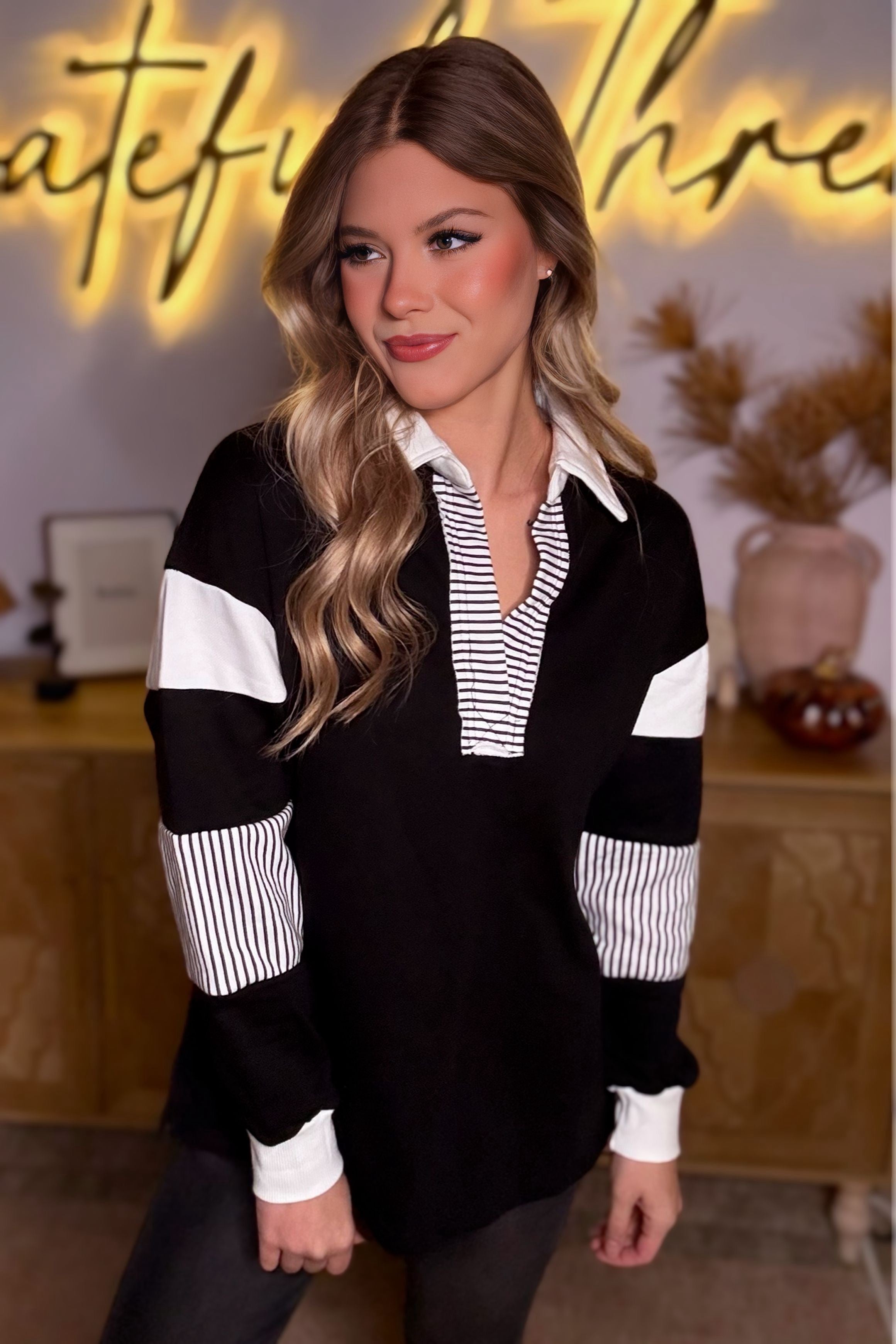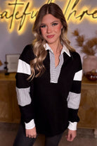 Black Striped Colorblock Patchwork Collar Sweatshirt