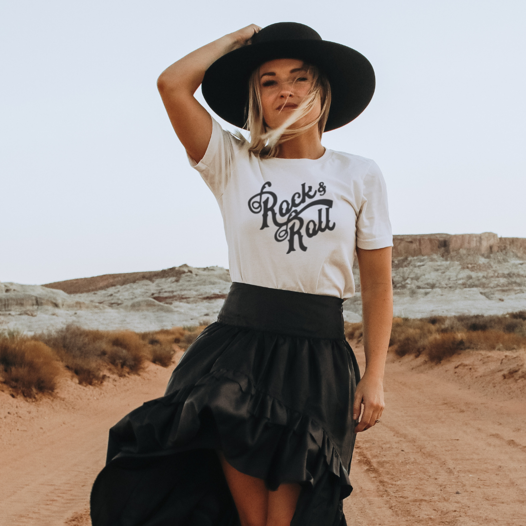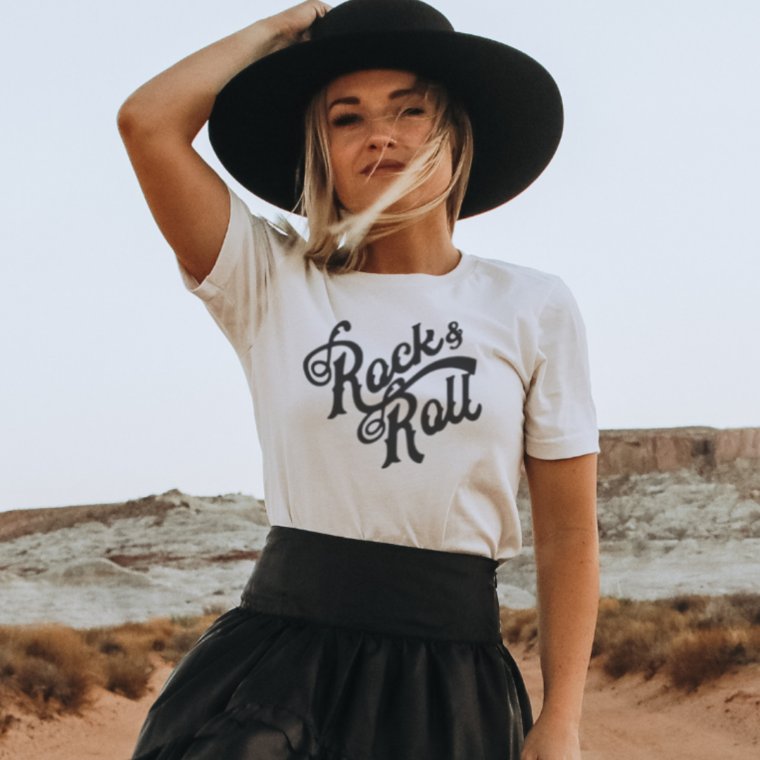 Rock and Roll Graphic Tee Looking for a comfortable and stylish graphic tee that stands out from the rest? Look no further! Our Rock and Roll Graphic Tee comes in white with a short sleeve and soft style. The fit is true to size with unisex sizing, making it the perfect addition to any wardrobe. Each tee is unique and the faded vintage look of the graphic print adds to its individuality. Care is easy with machine wash and dry. Get ready to rock out in style!