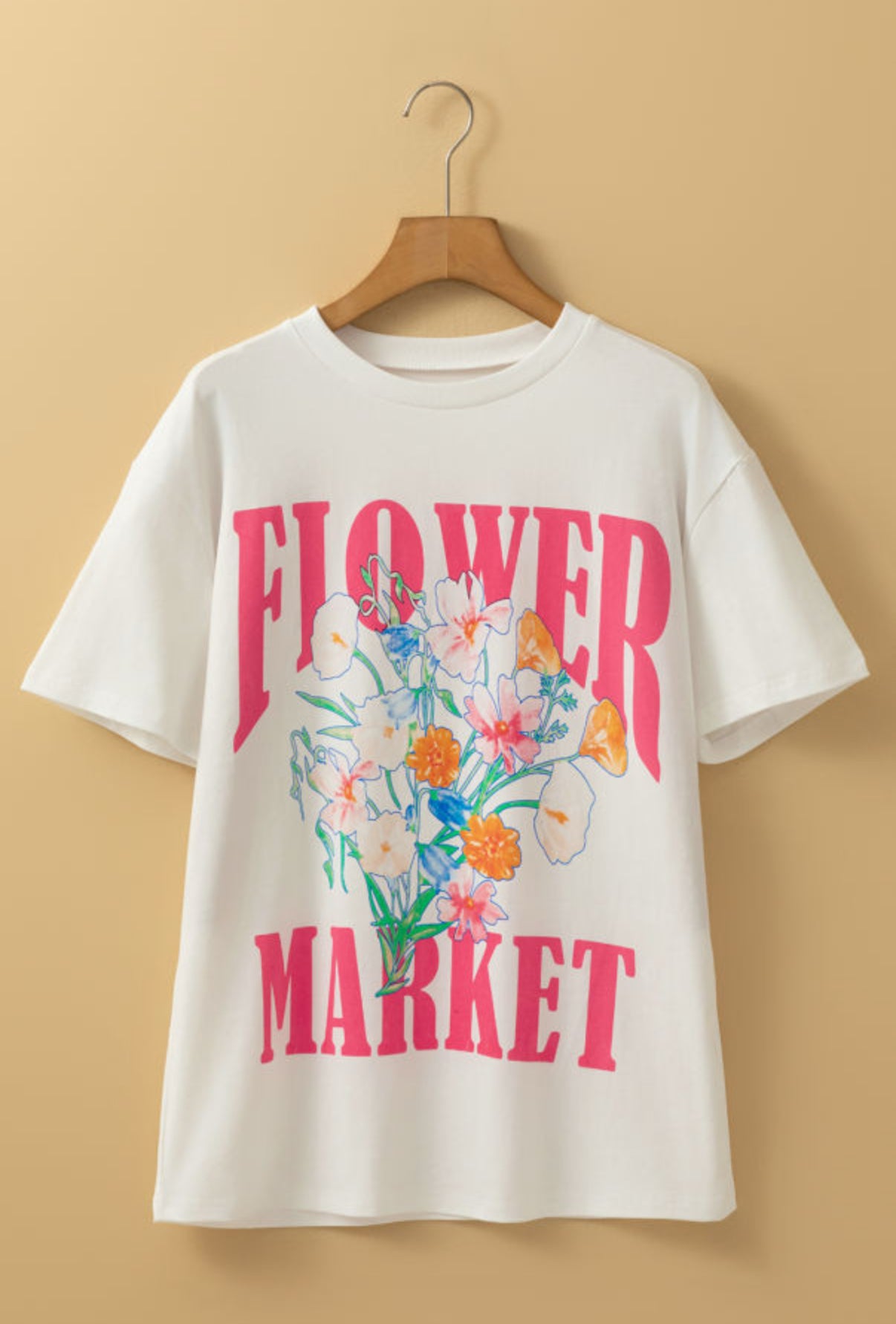 Step into summer with effortless charm in our Fresh Picked Florals Tee by Grateful Threads! This soft and breathable white tee features a vibrant floral bouquet and bold pink “Flower Market” lettering that instantly brightens your look. Made from a comfy blend of 95% cotton and 5% elastane, it offers the perfect amount of stretch for everyday wear. With its relaxed shift fit, round neckline, and short sleeves, it’s a casual go-to for market strolls, iced coffee runs, or laid-back weekends.
