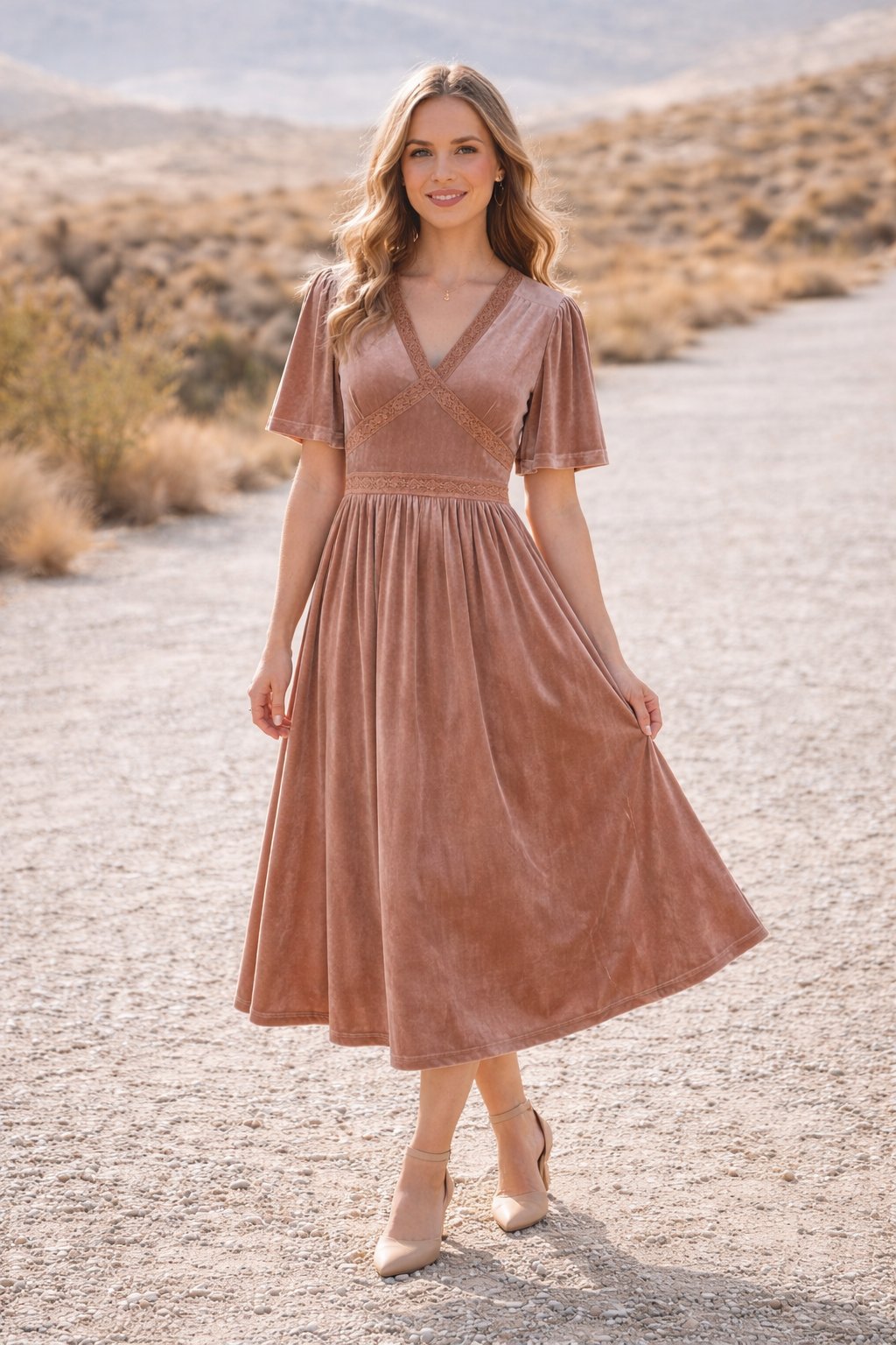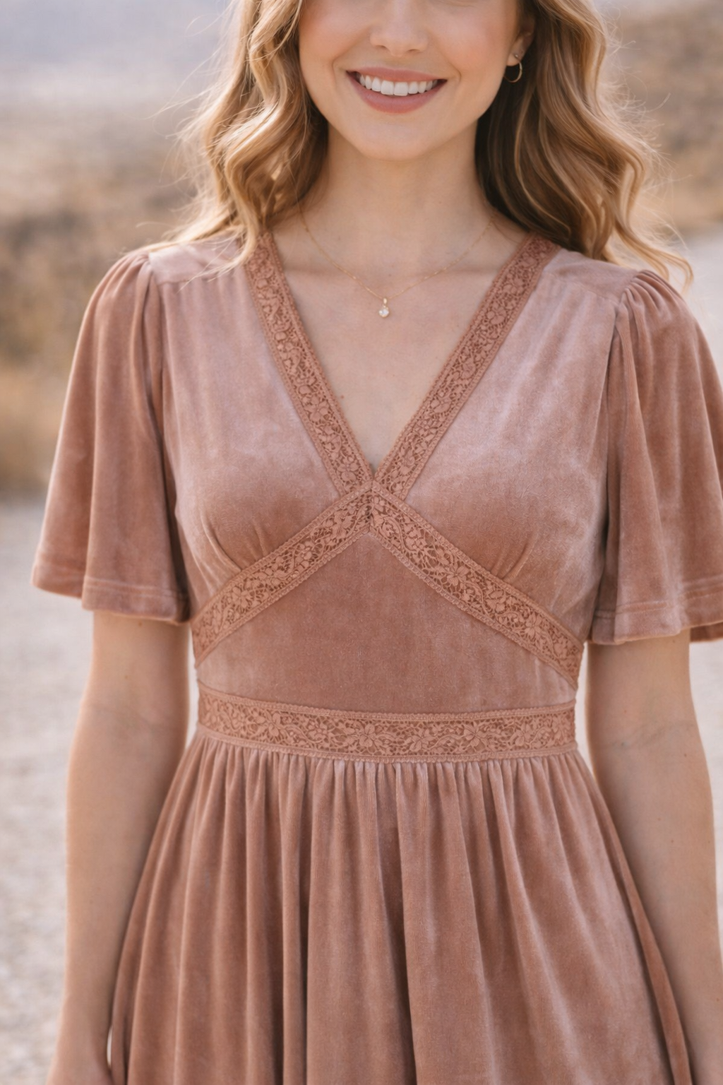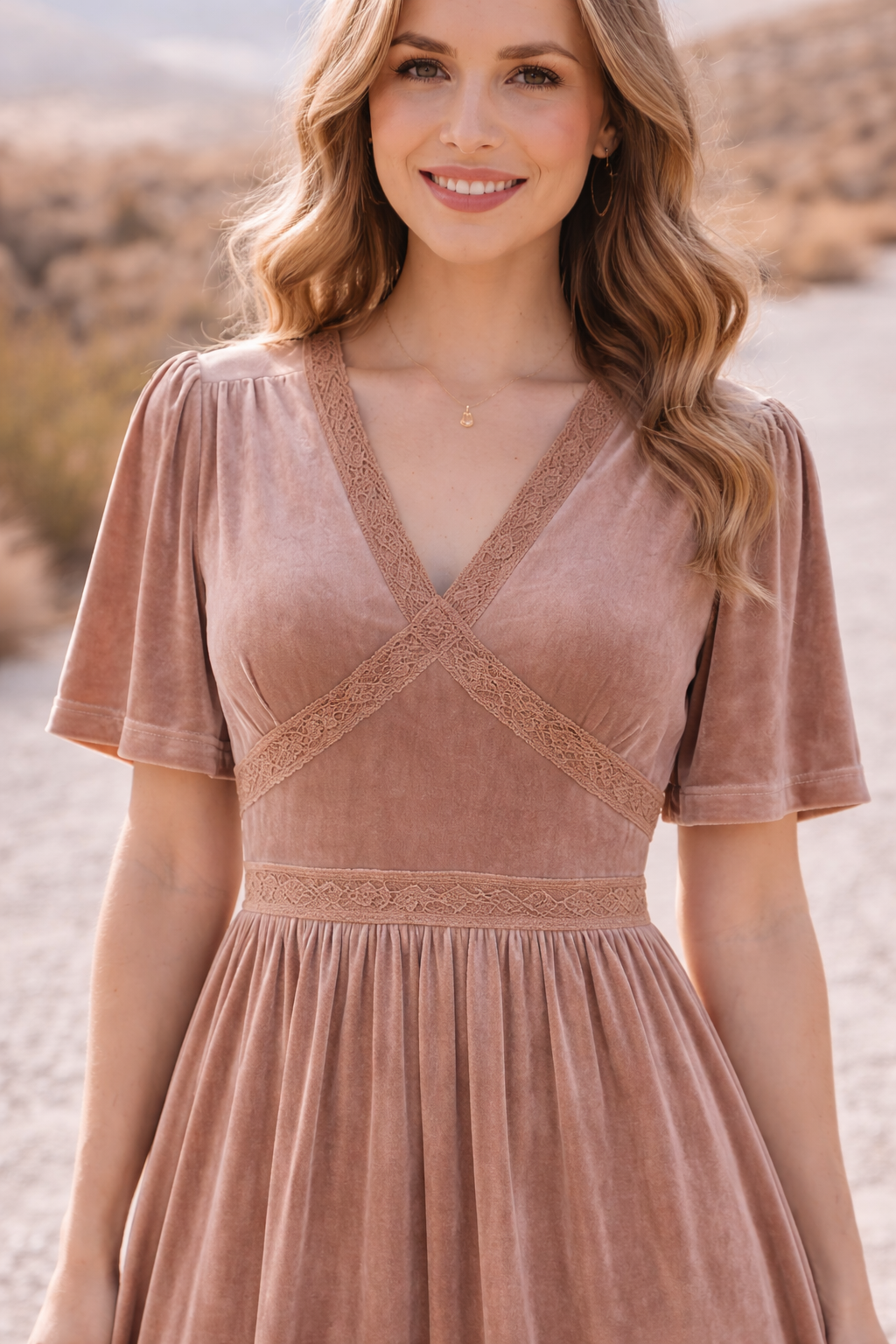 Dusty Taupe Rose Velvet Lacy Empire Waist Midi Dress