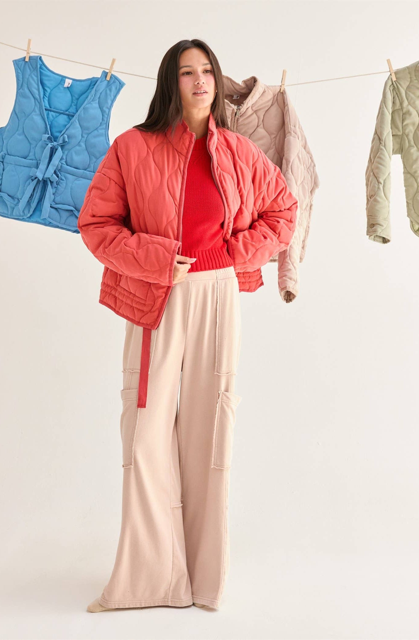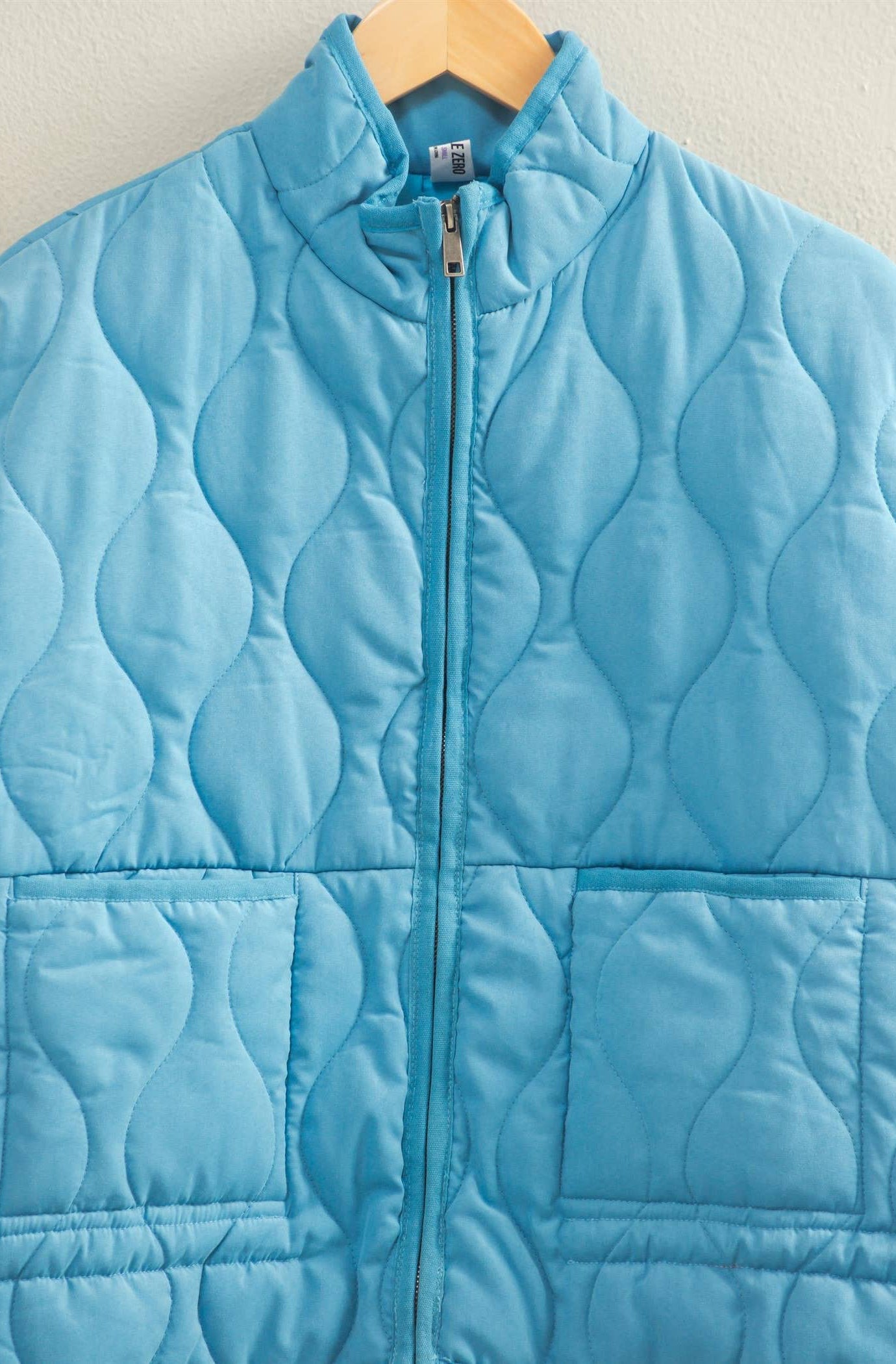 Stay effortlessly chic through the cooler seasons with the Ocean Blue Quilted Jacket With Drawstring Hem. Designed with a relaxed yet flattering silhouette, this ocean-blue quilted jacket features structured stitching that adds texture and visual interest while maintaining a lightweight, wearable feel. The adjustable drawstring hem allows you to customize the fit—cinch it in for a defined shape or wear it loose for laid-back layering.