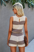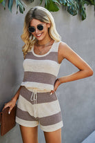 Crafted from a breathable, lightweight fabric, this romper boasts a sleeveless design with a scoop neck and color block pattern. Complete with a drawstring for added detail, it's the perfect versatile piece for any casual occasion.