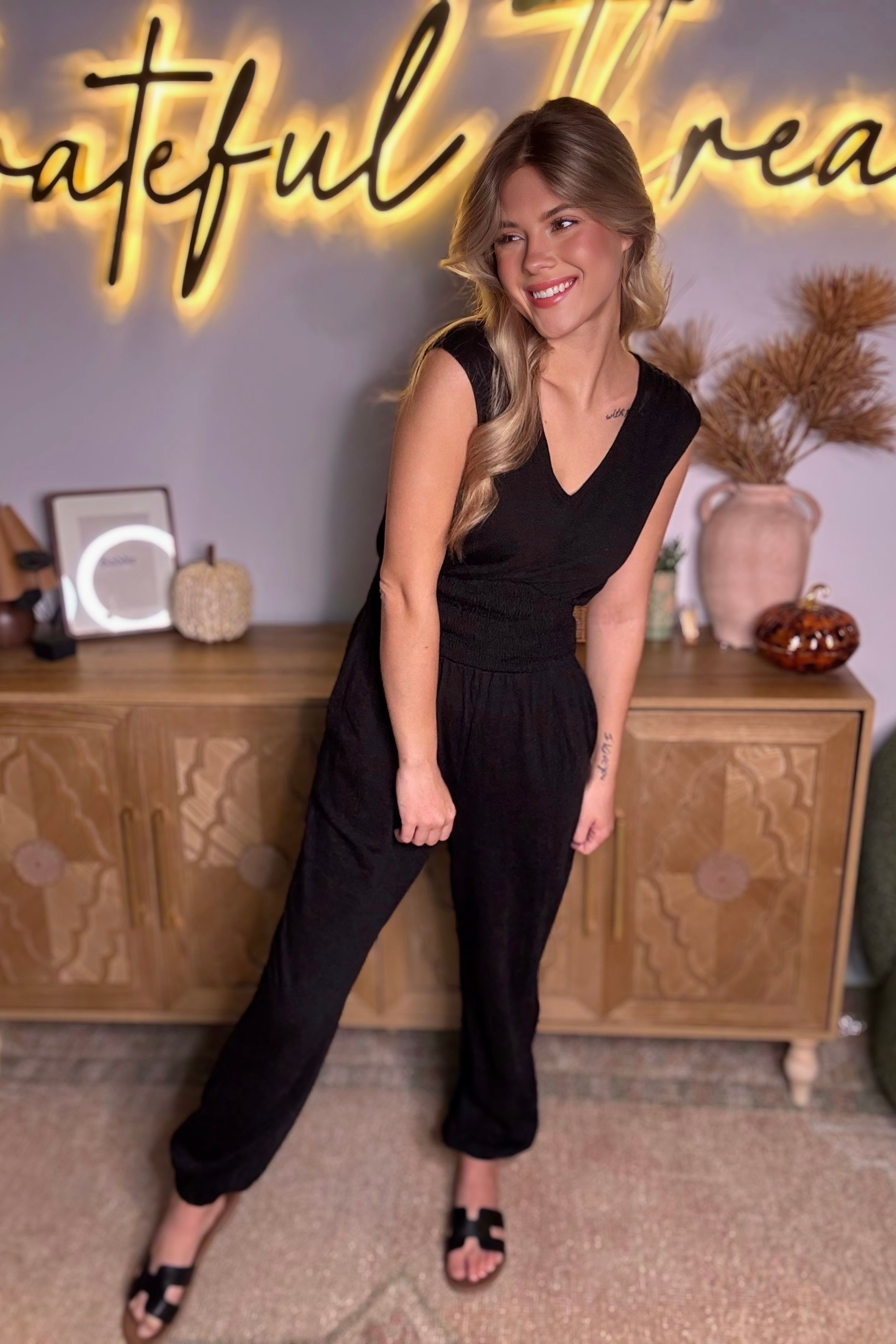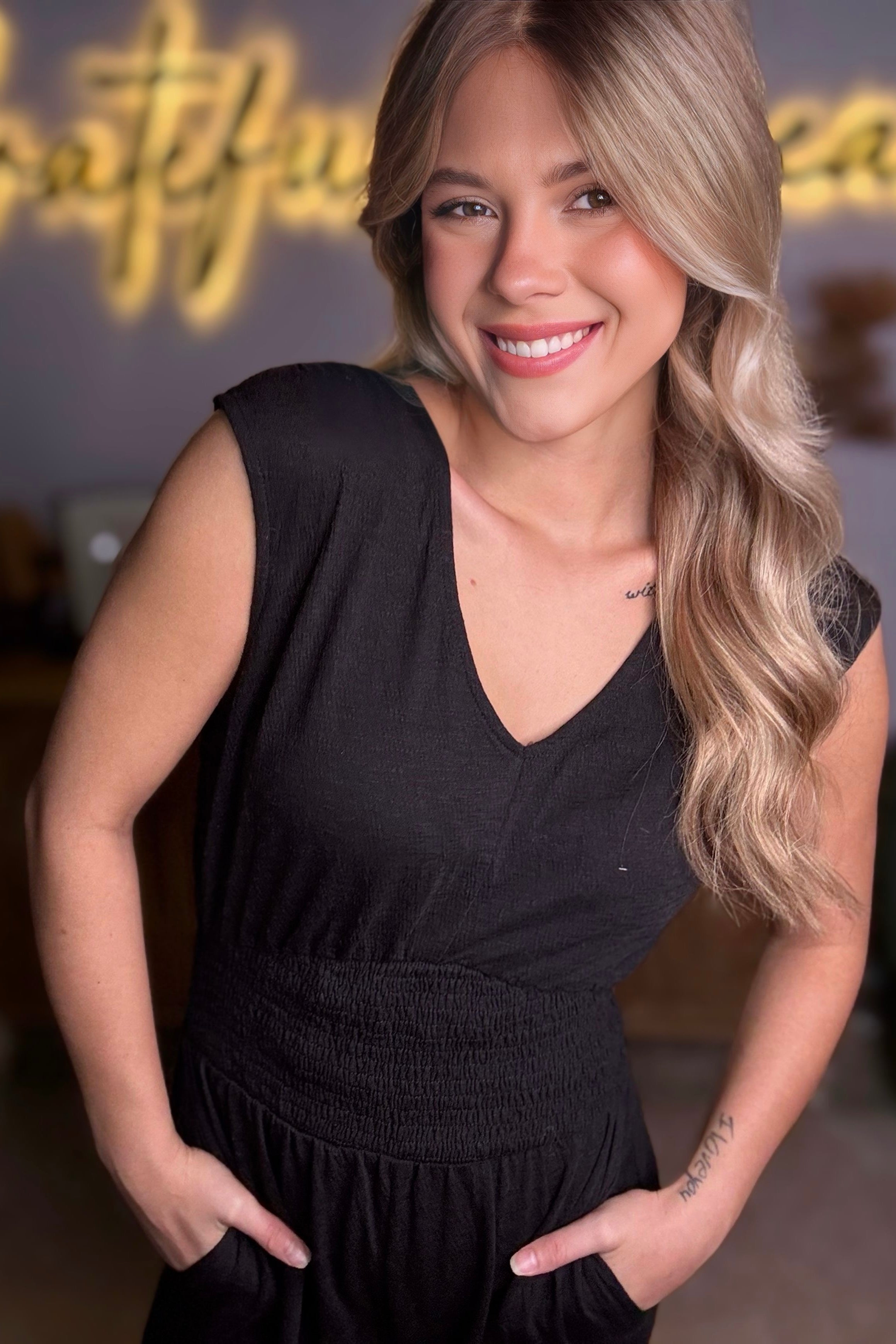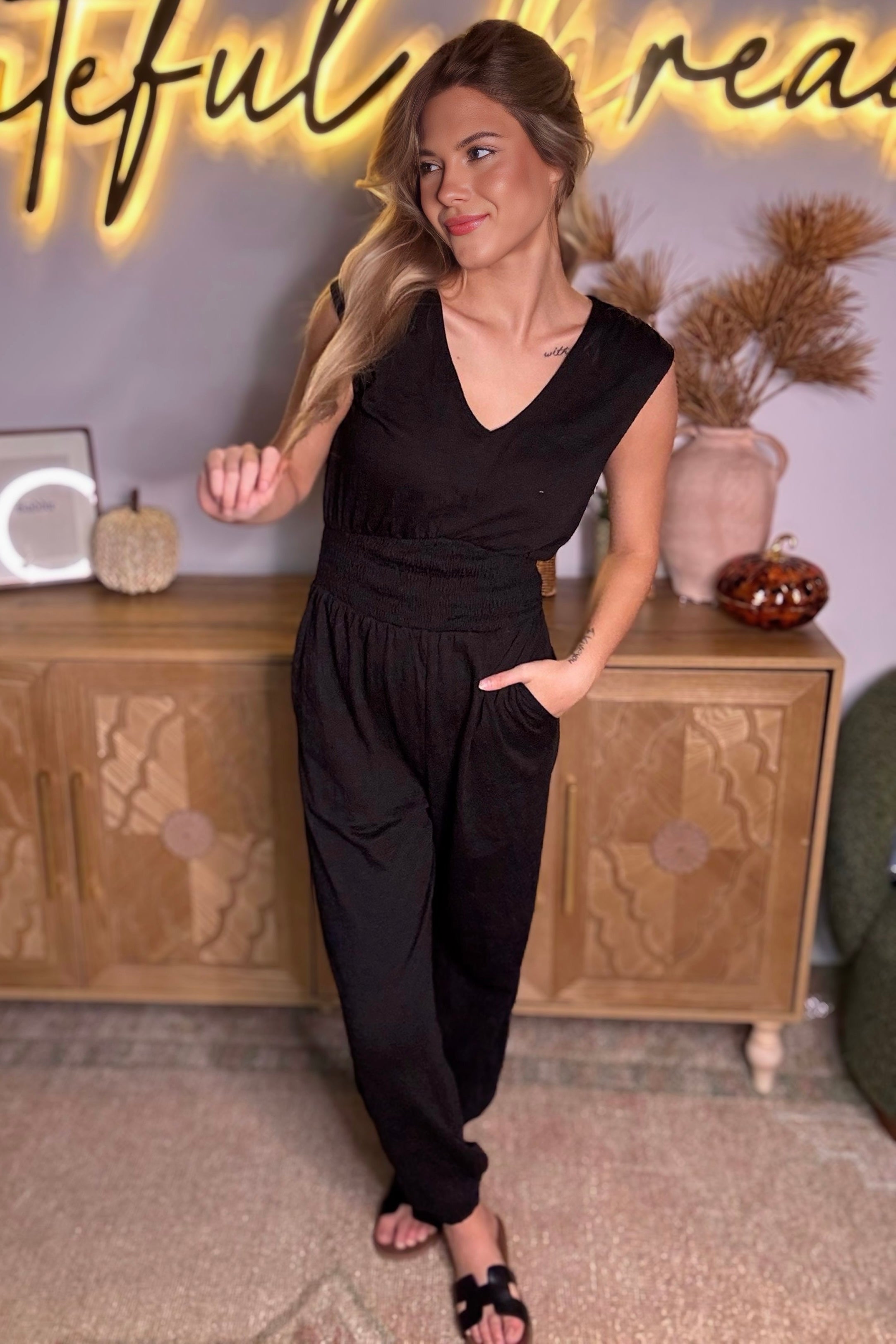 Black Shirred High Waist Sleeveless V-Neck Jumpsuit