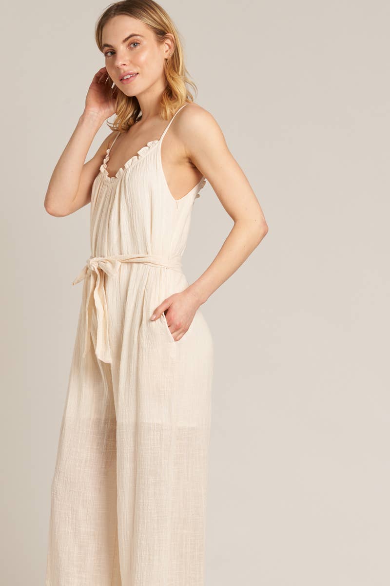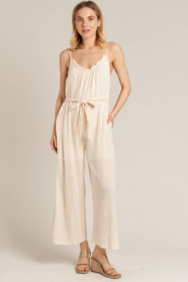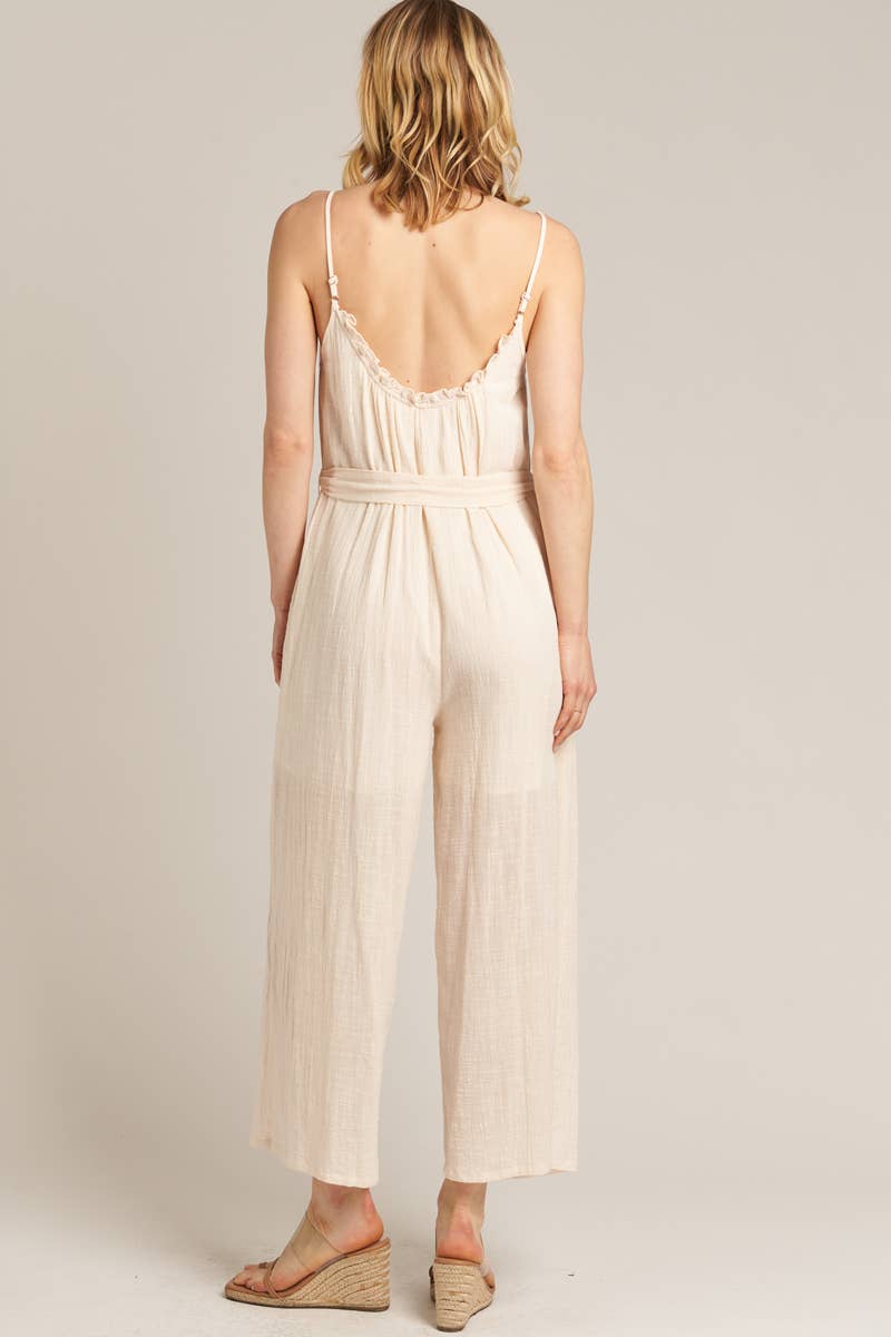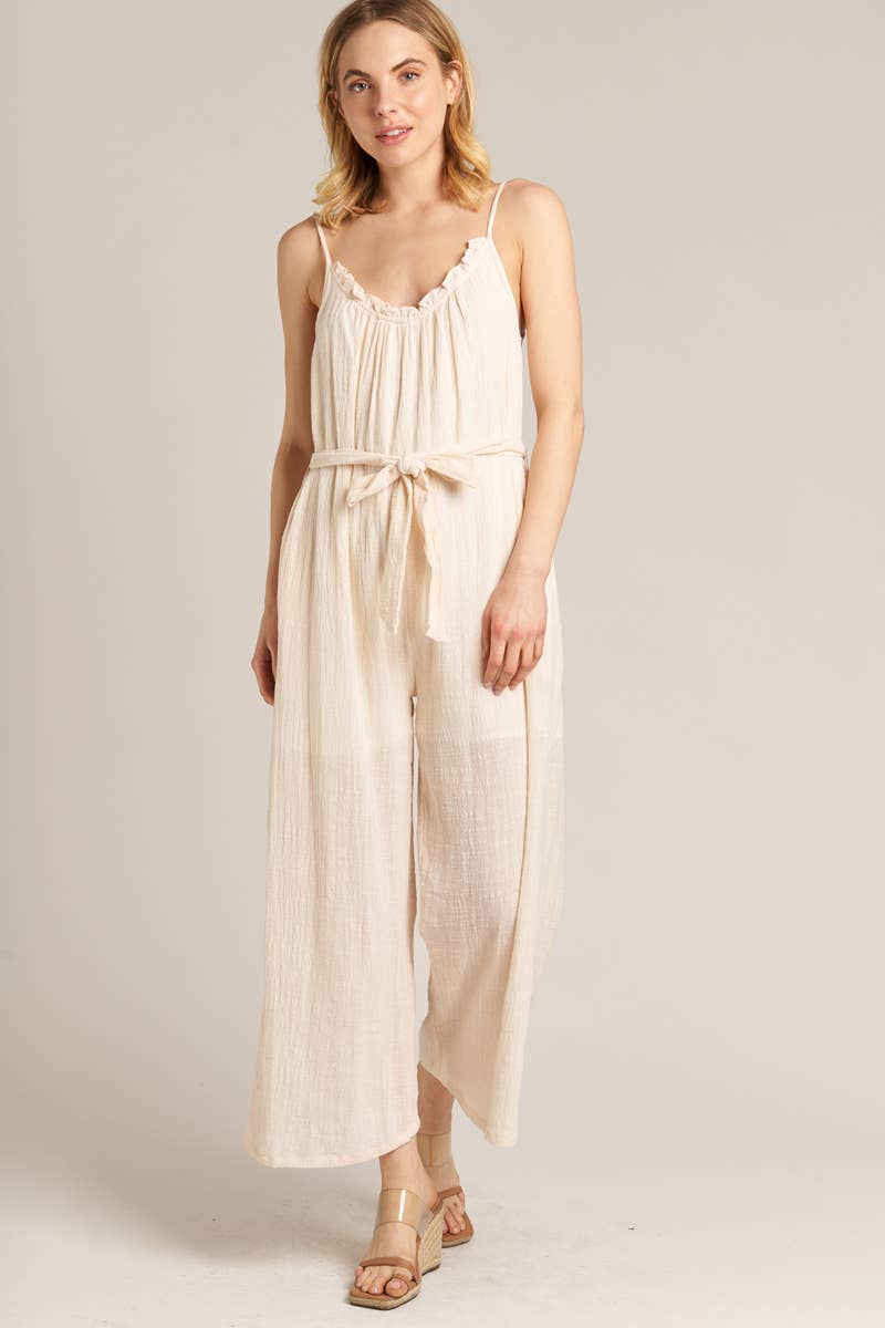 Effortlessly elegant, the En Crème Cream Sleeveless Belted Jumpsuit is a versatile addition to any wardrobe. Designed with a timeless sleeveless silhouette and a flattering V-neckline, it offers an understated yet chic look. The belted waist enhances your figure, while the relaxed, wide-leg fit adds a touch of sophistication.
