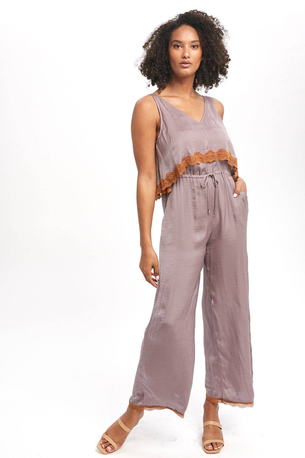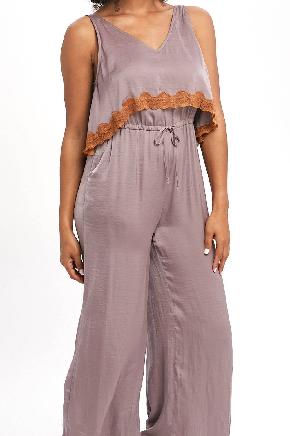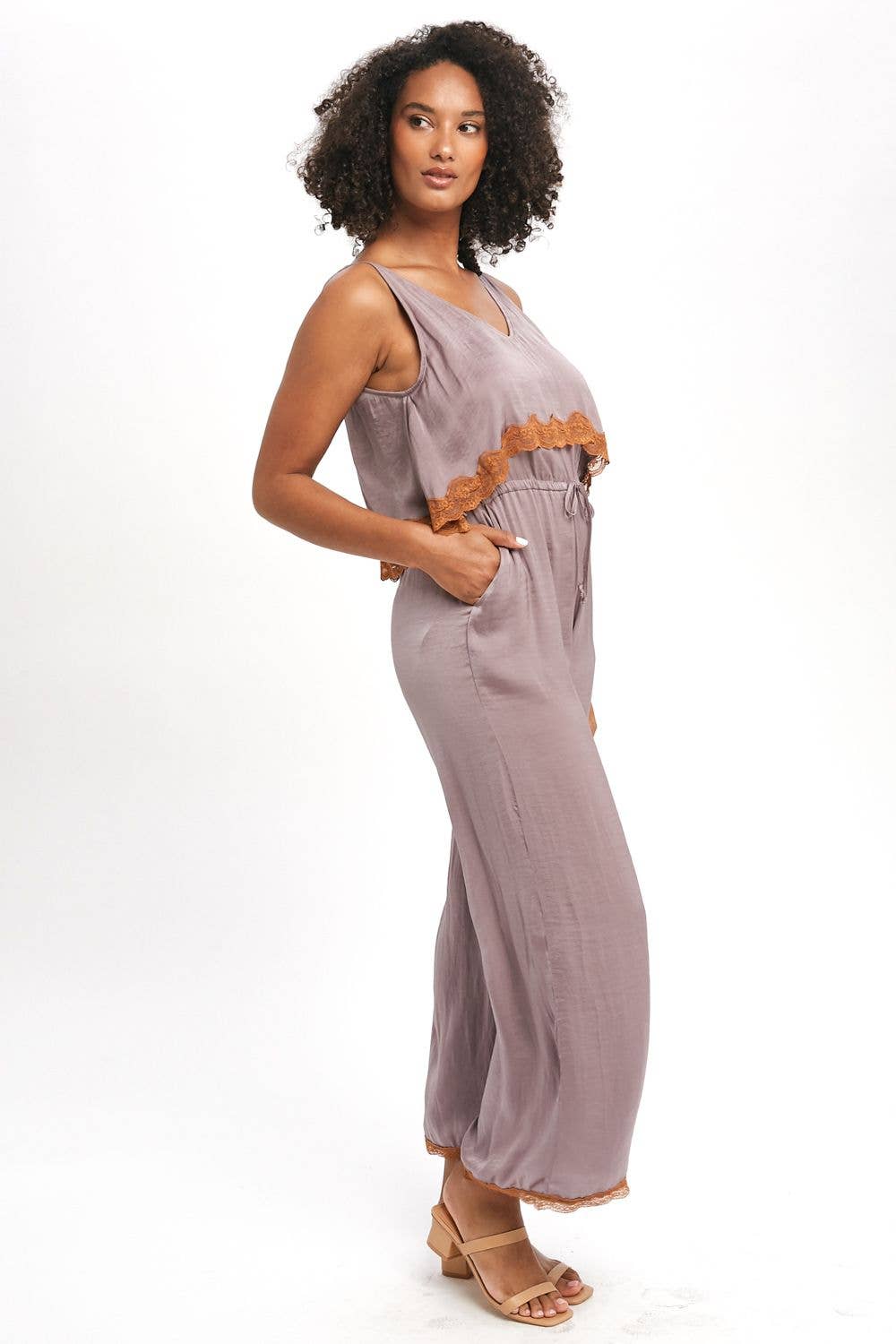 Float through your day in effortless boho elegance with our Moonlit Mocha Lace-Trim Wide Leg Jumpsuit. Designed in a soft, lightweight woven fabric, this Mystree jumpsuit features delicate lace edging along the layered bodice and wide leg hems, adding a romantic, vintage-inspired touch. The relaxed wide leg silhouette and adjustable drawstring waist flatter your shape while keeping comfort front and center.