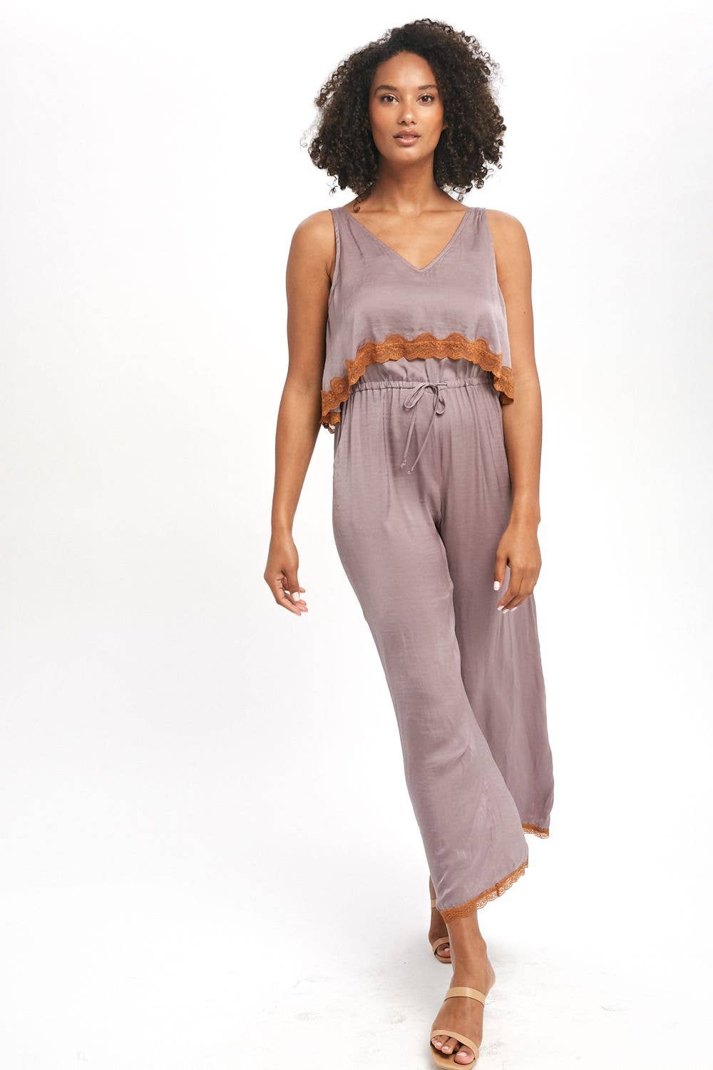 A sleeveless cut and airy drape make this jumpsuit perfect for warm-weather days, weekend brunches, vacations, festivals, or casual date nights. The soft mocha hue pairs beautifully with neutral sandals, wedges, or booties for an easy dressed-up-or-down look. Whether you’re chasing sunsets or sipping sweet tea, this lace-trim jumpsuit delivers laid-back sophistication with a boho soul.