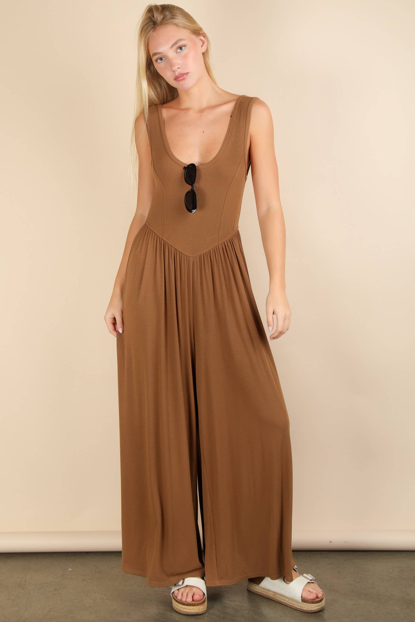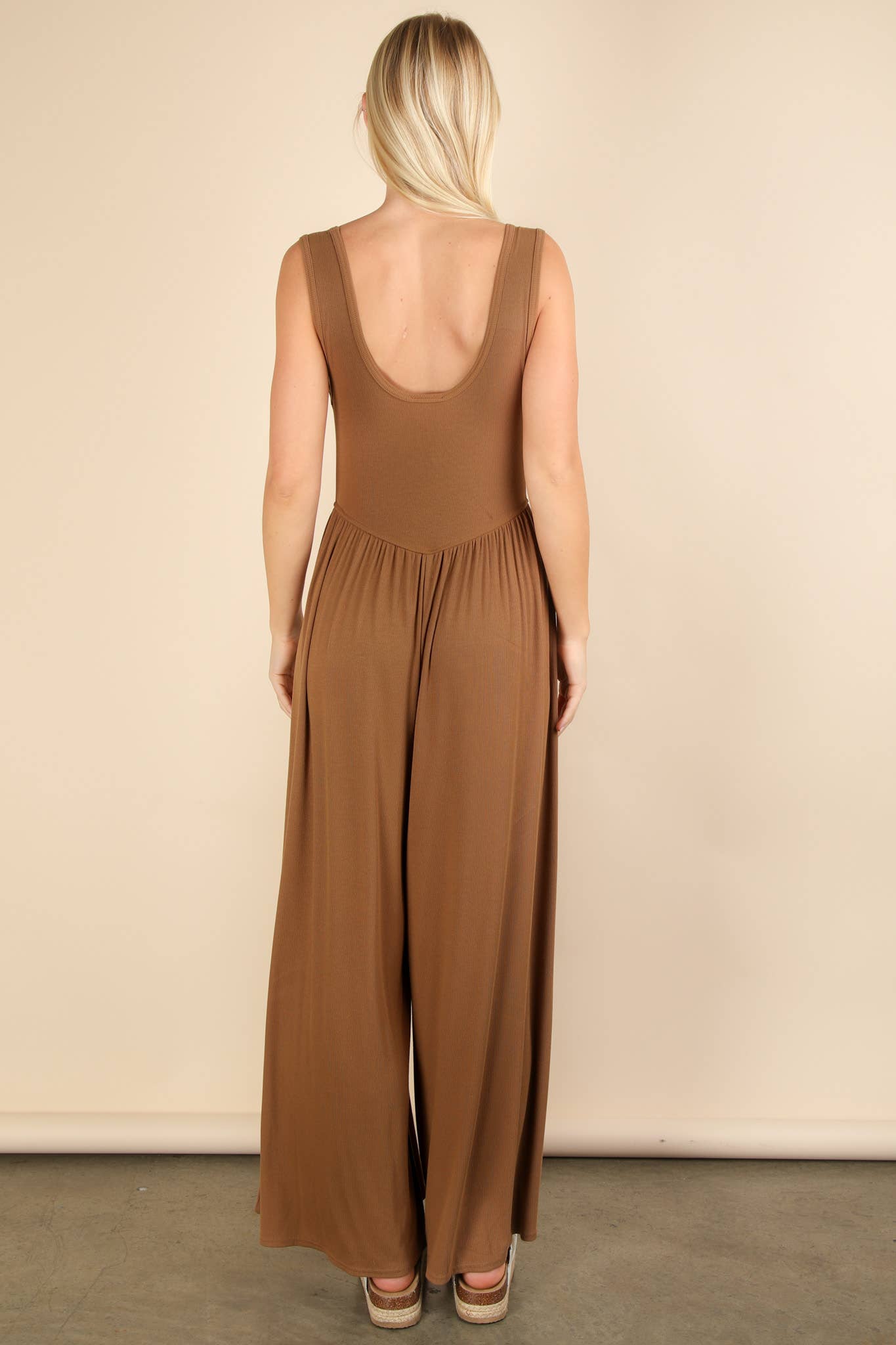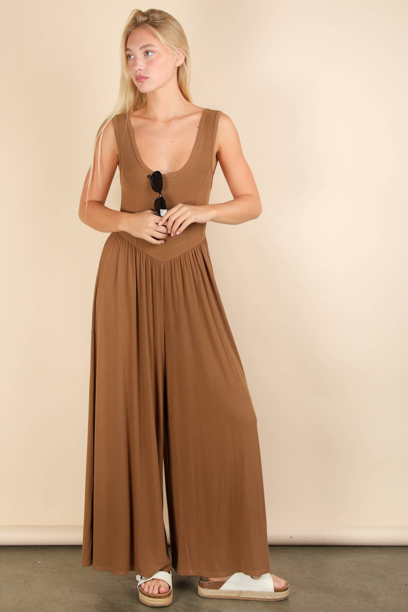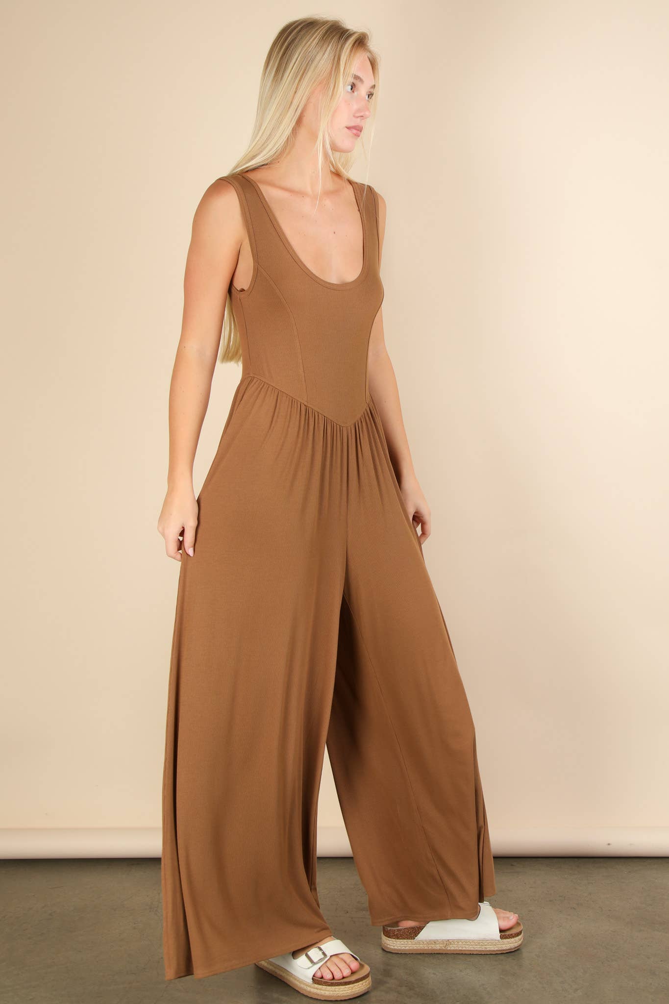 New In Camel Brown Casual Ribbed Knit Sleeveless Jumpsuit