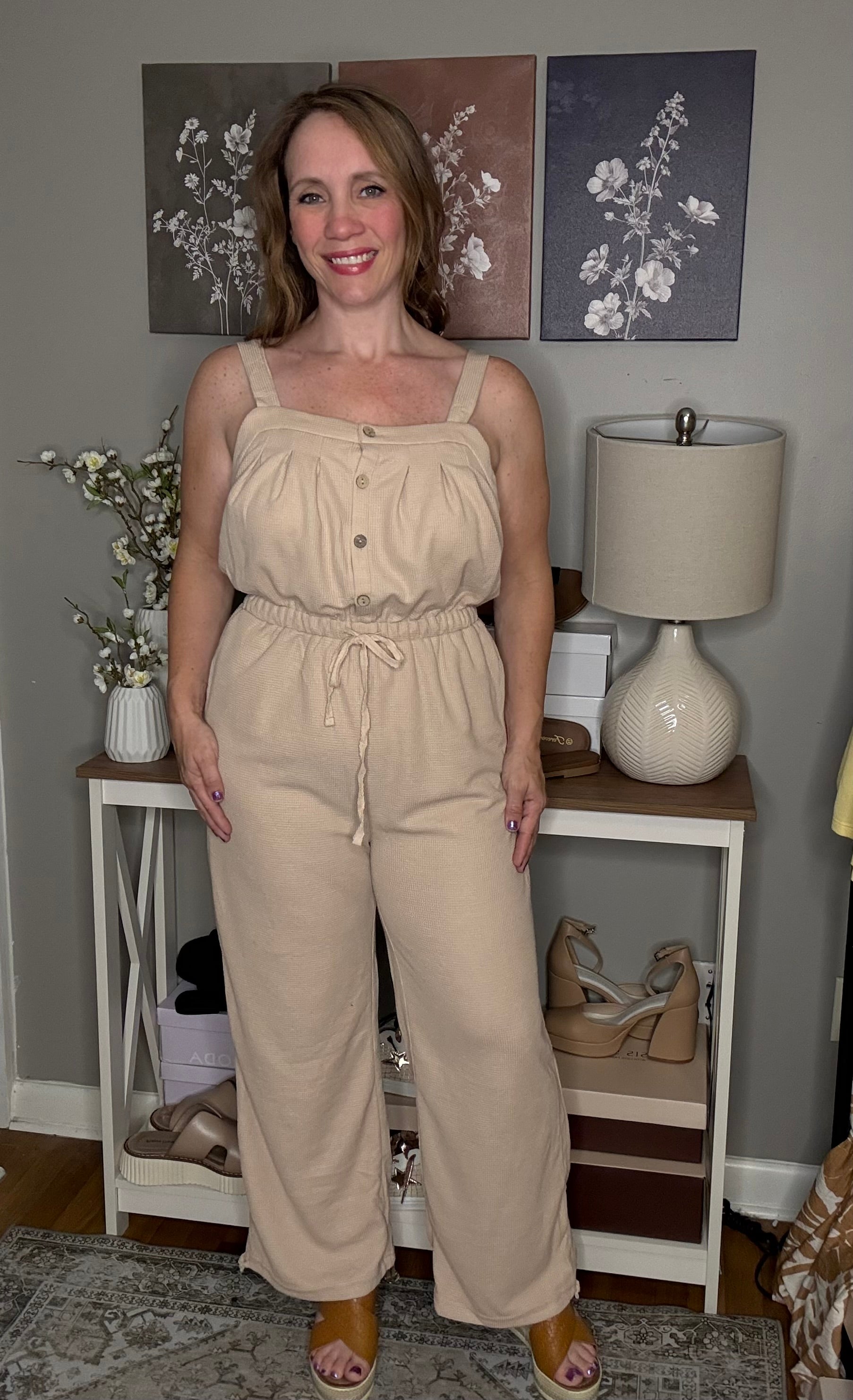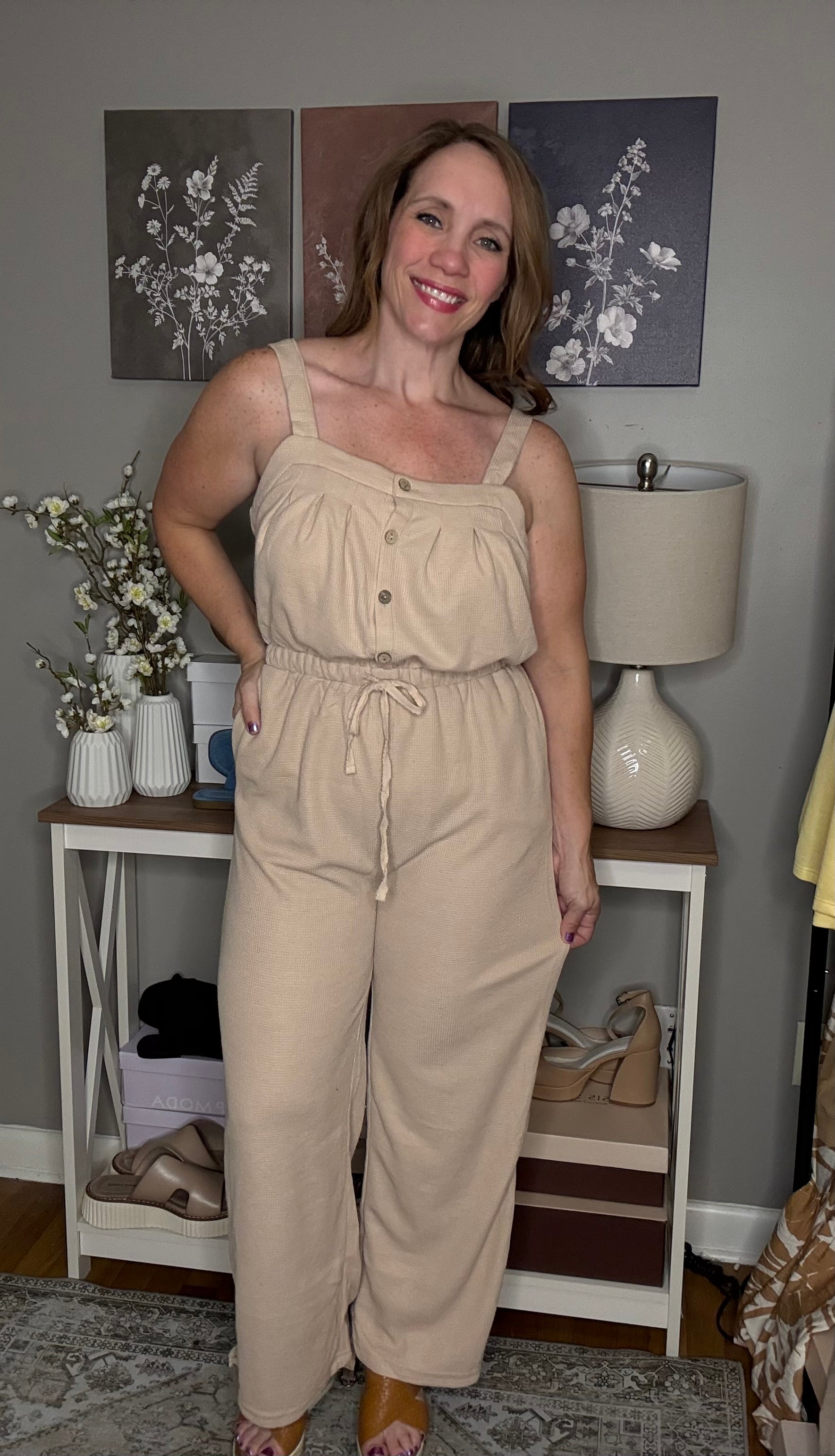 Pale Khaki Knotted Strap Button Drawstring Jumpsuit – Casual Chic