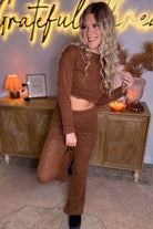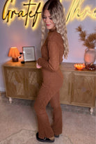 Wrap yourself in cozy confidence with our Cocoa Comfort Knit Set by Le Lis — where effortless chic meets soft, all-day comfort. This matching top and pant set features a rich mocha-brown hue with a textured diamond knit pattern that adds subtle dimension and a flattering fit. The cropped long-sleeve top pairs perfectly with the high-waisted flare pants for a look that’s equal parts lounge and luxe. Whether you’re sipping coffee at home or stepping out in boots and gold hoops, this set delivers that laid-back elegance you’ll want to live in all season long.