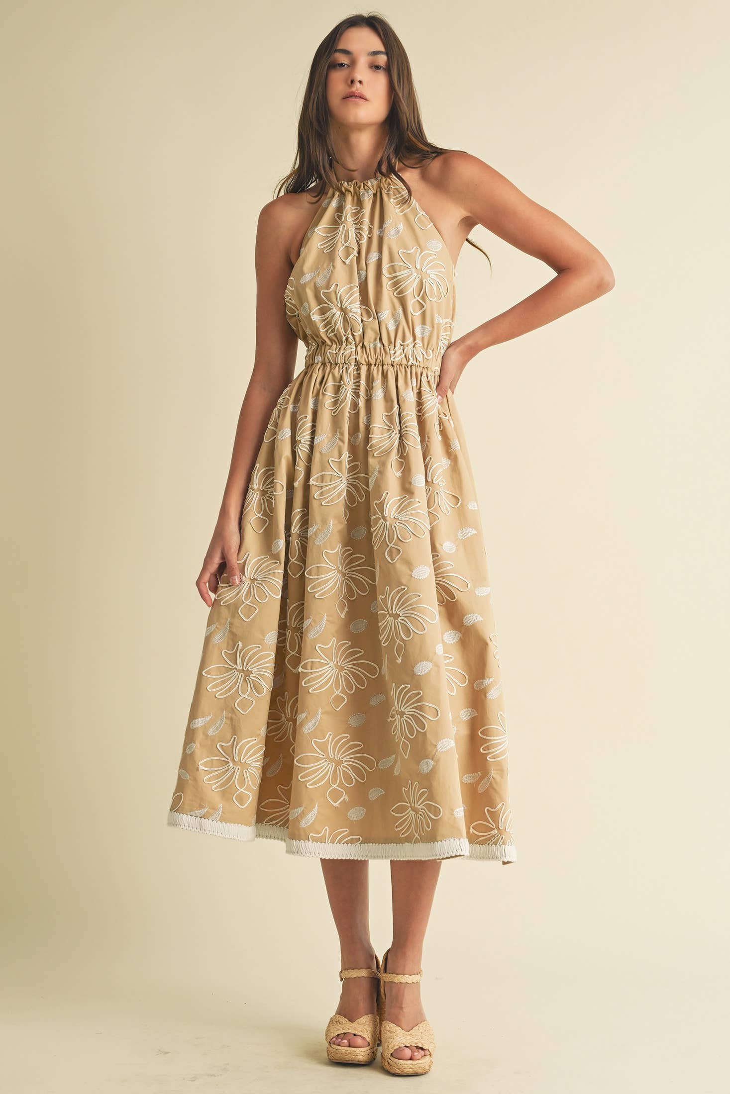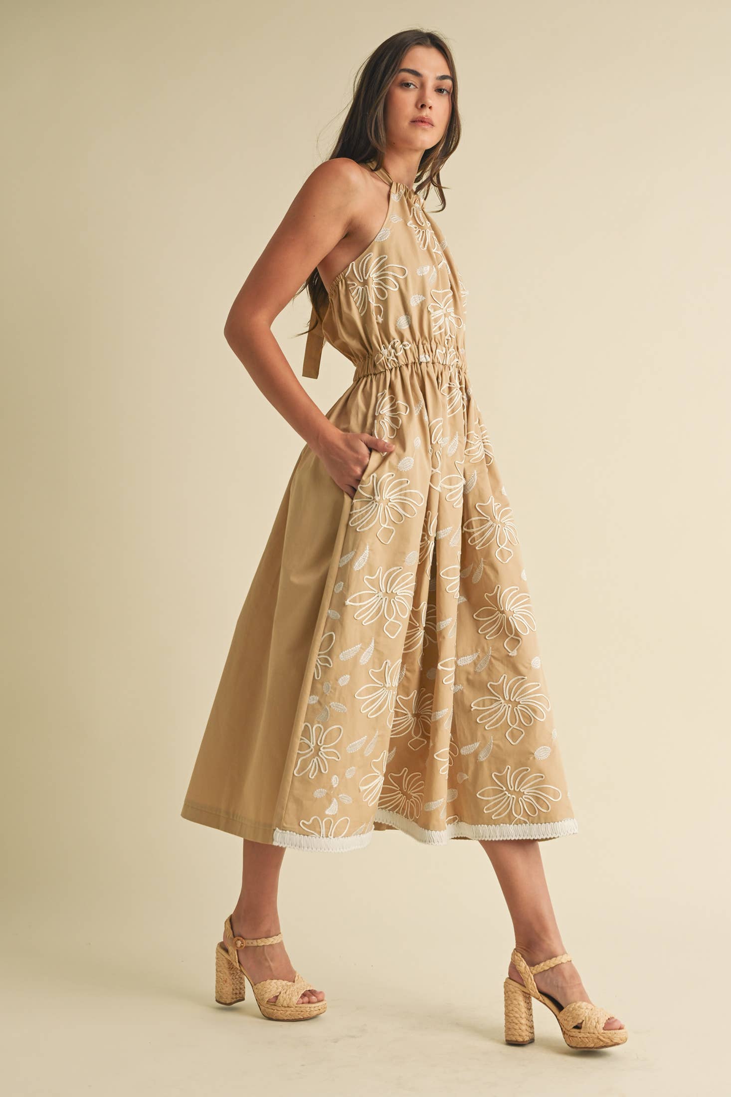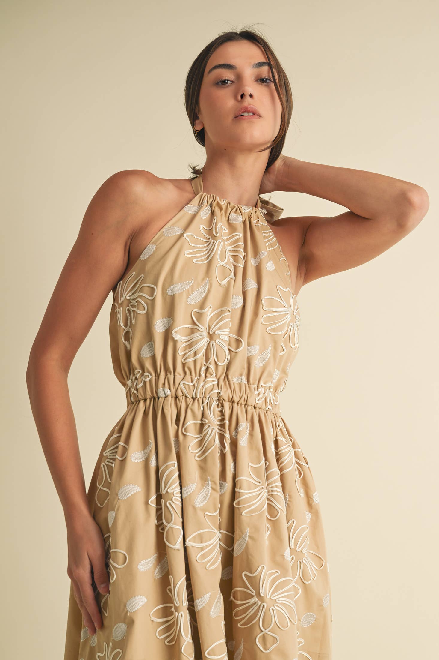 This beautiful dress features halter neckline with tie back and 3d floral embroidery throughout. Such a Elegant, feminine piece. This dress will be one of your best out fit for special occasions.