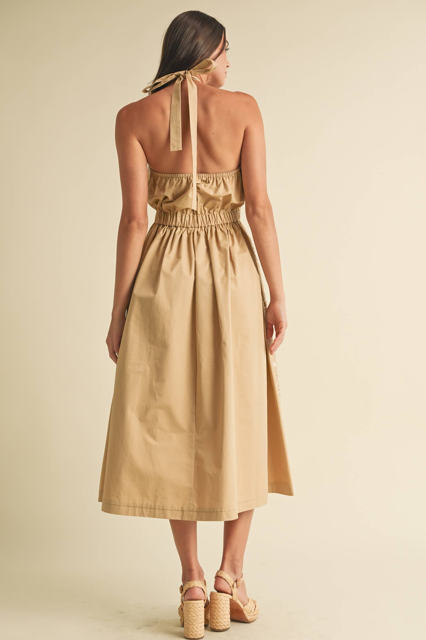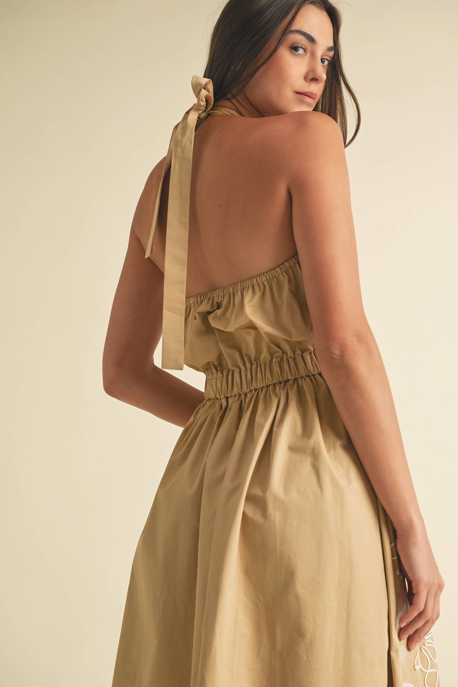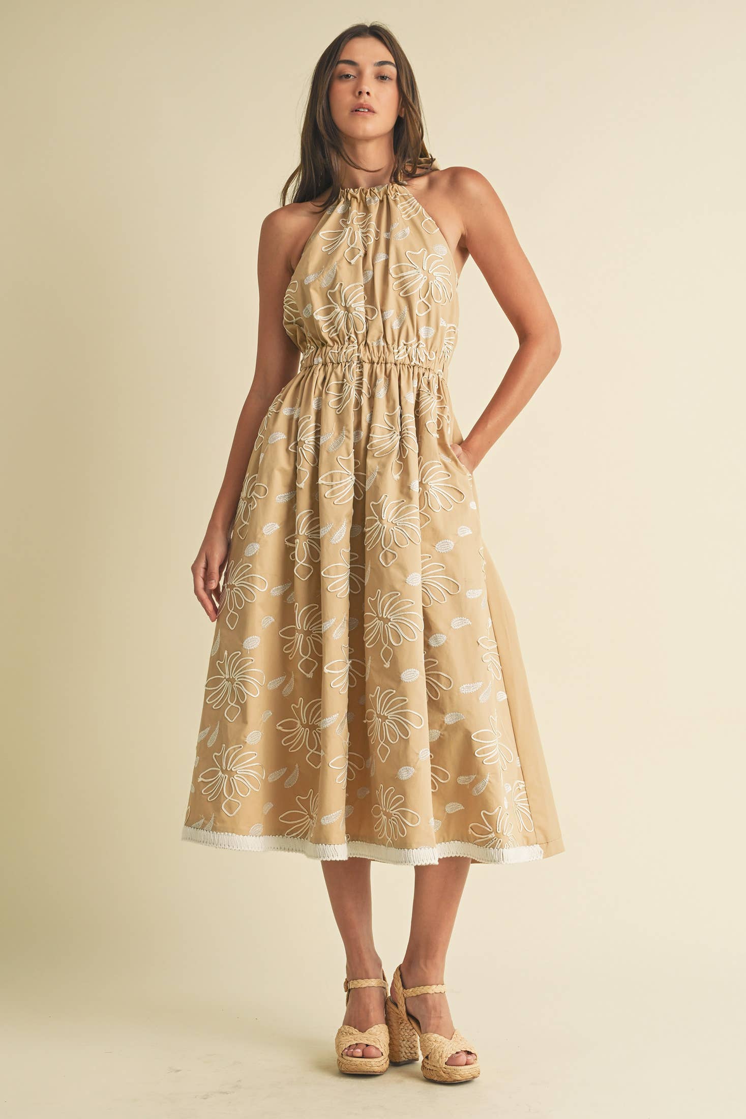 This beautiful dress features halter neckline with tie back and 3d floral embroidery throughout. Such a Elegant, feminine piece. This dress will be one of your best out fit for special occasions.