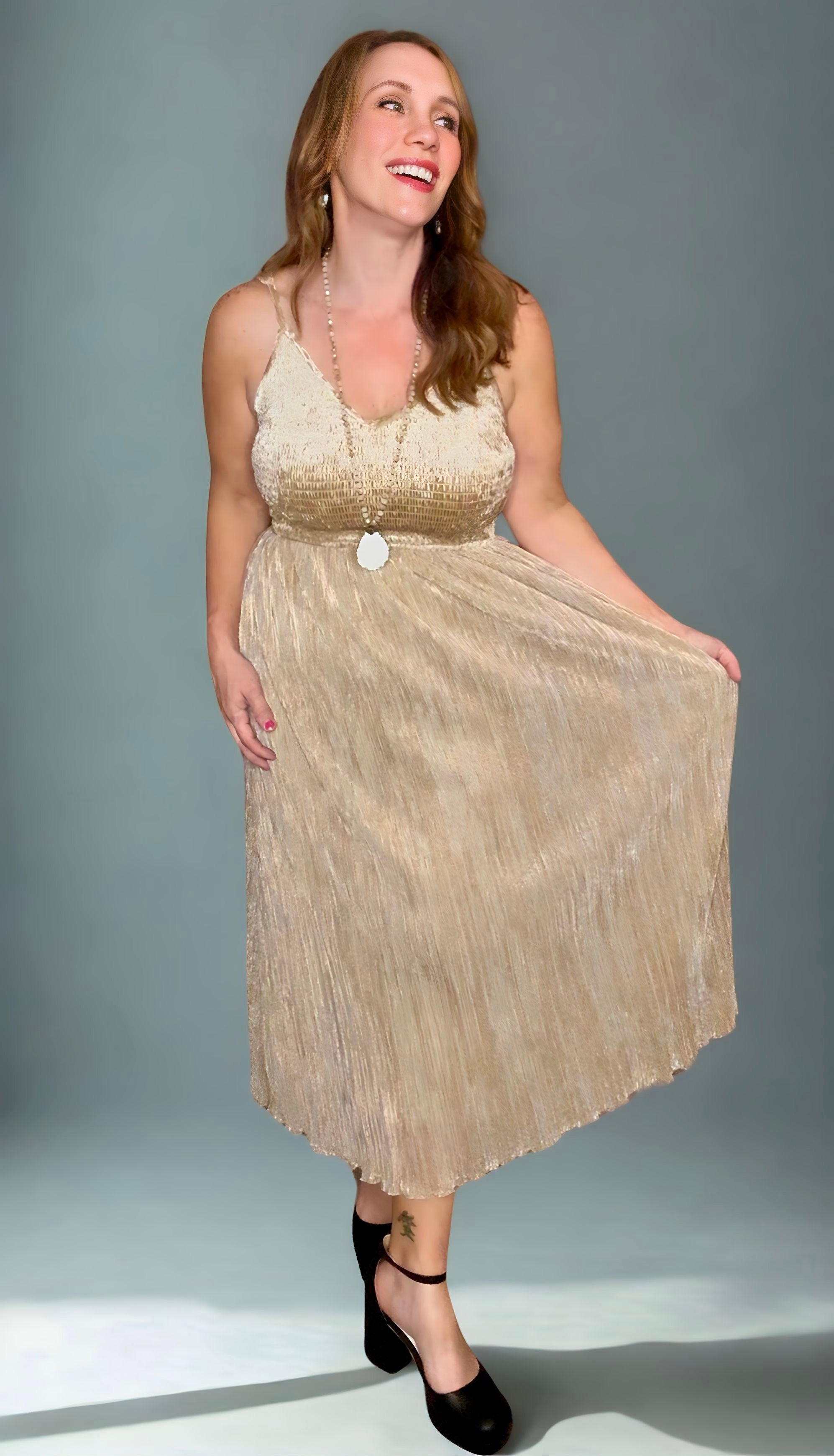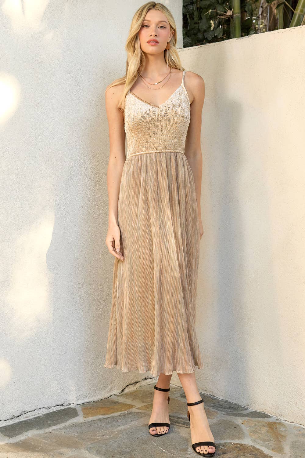Mystree Shiny Mixed Cami Midi Dress in Champagne