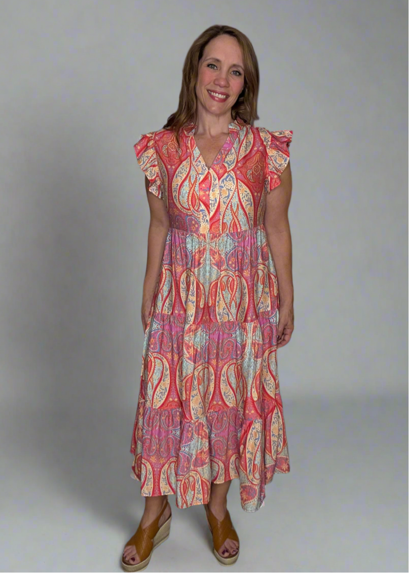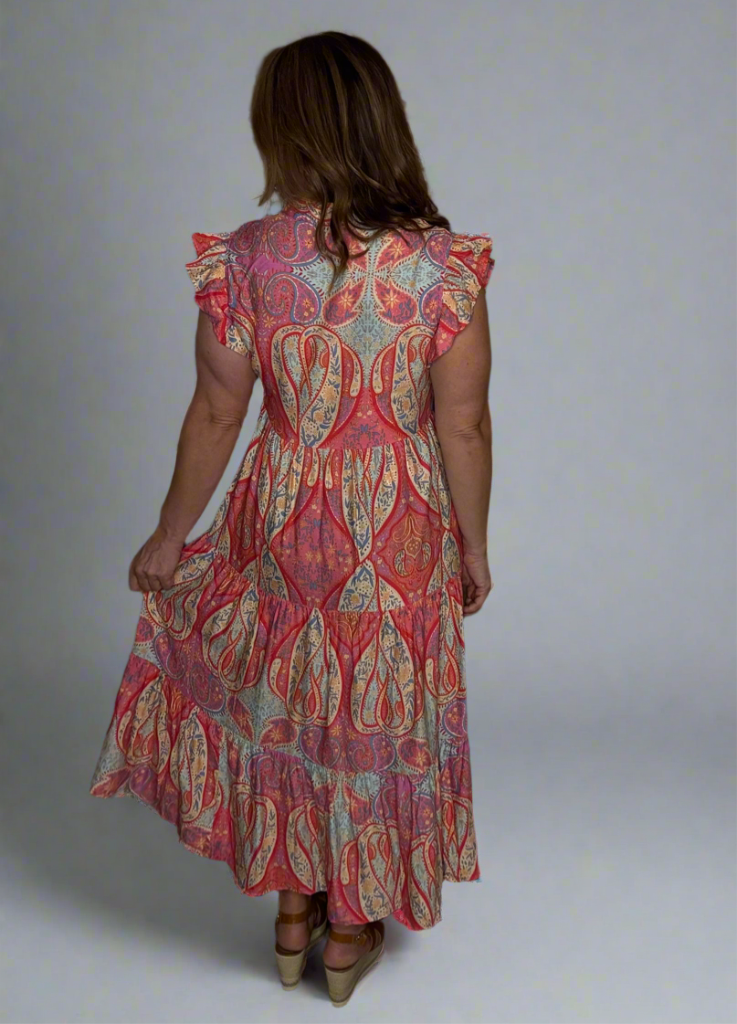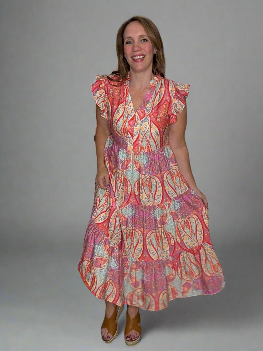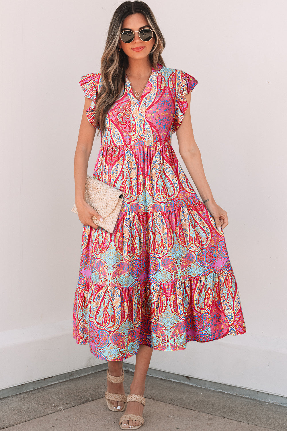 Rose Tribal Paisley Print Ruffled Sleeve Notch Neck Midi Dress