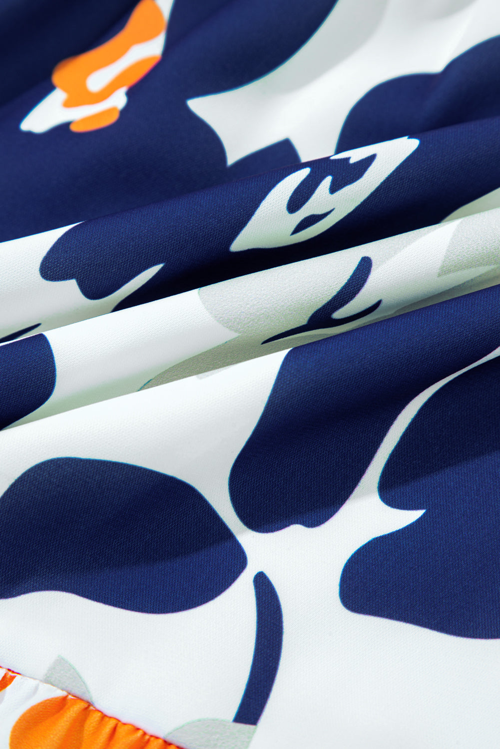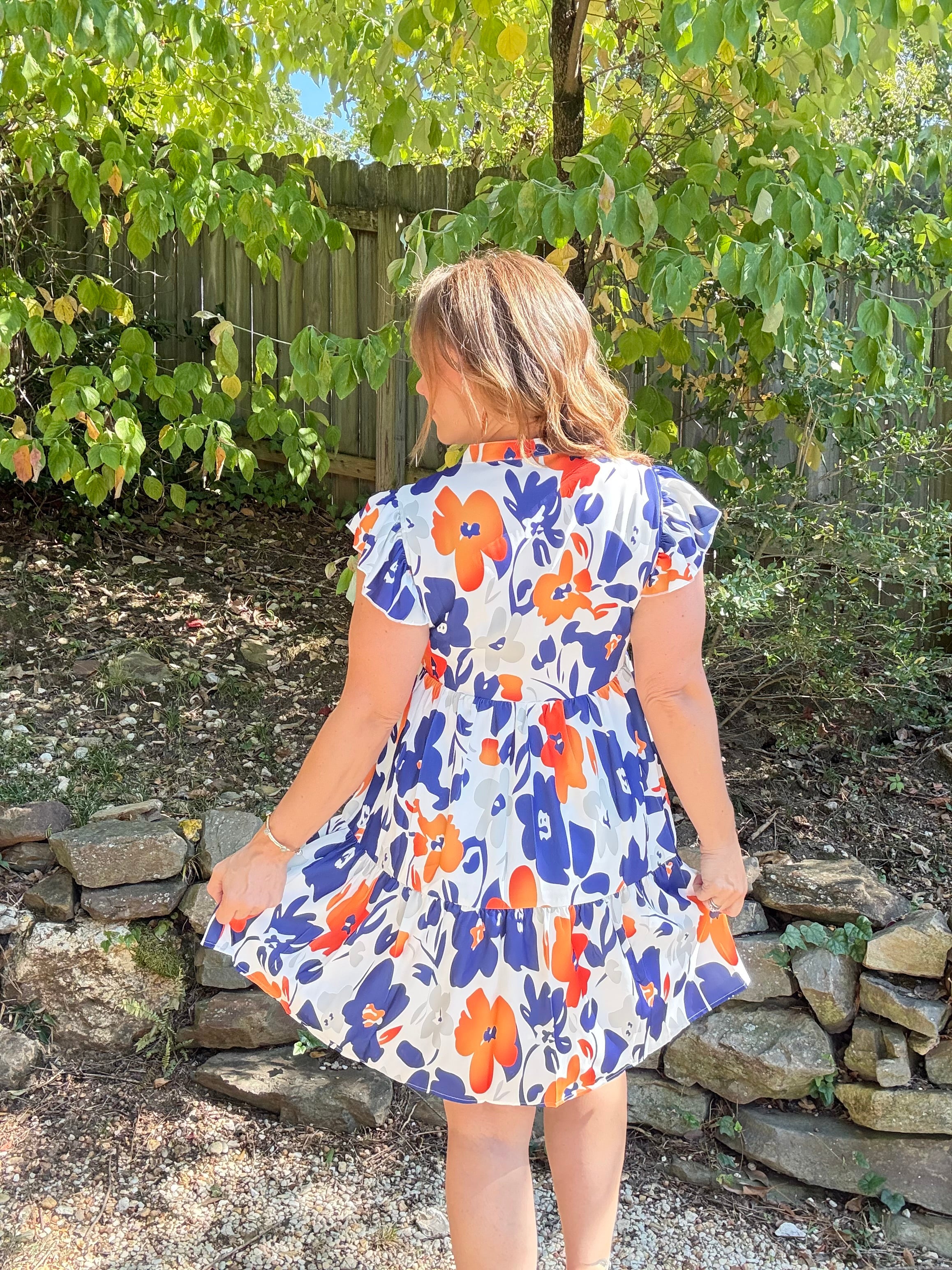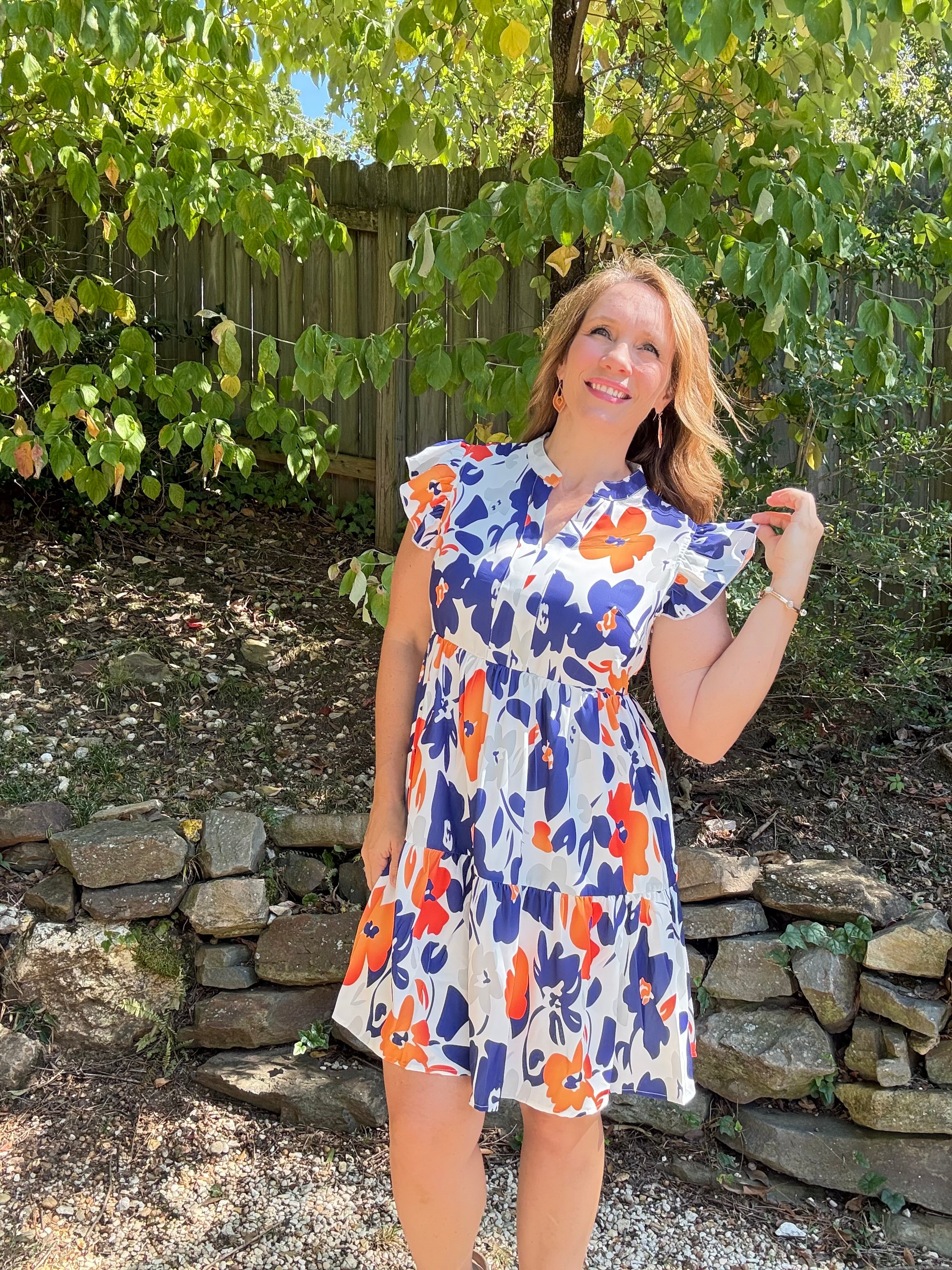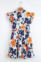 Orange Floral Print Notched Neck Flutter Sleeve Mini Dress