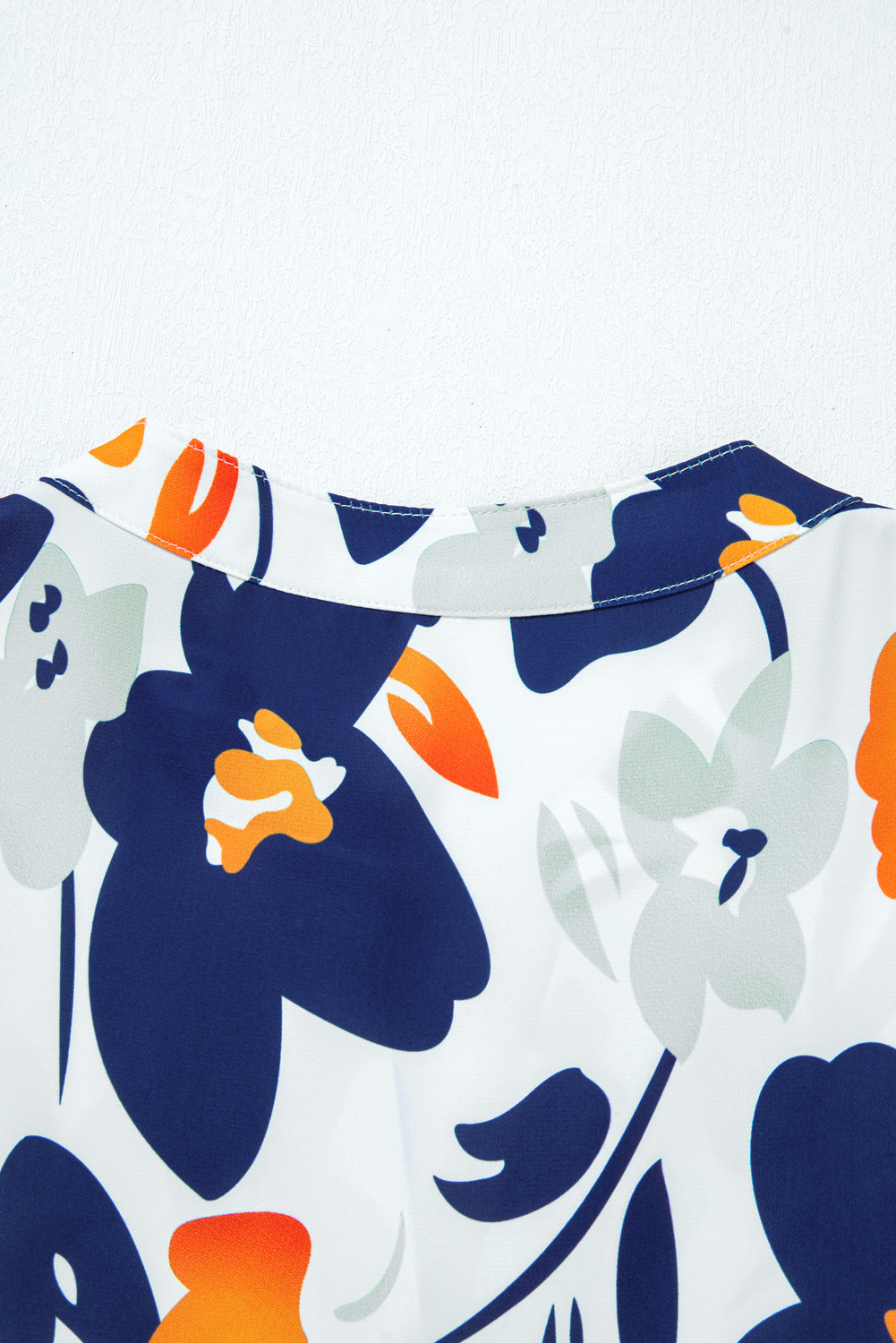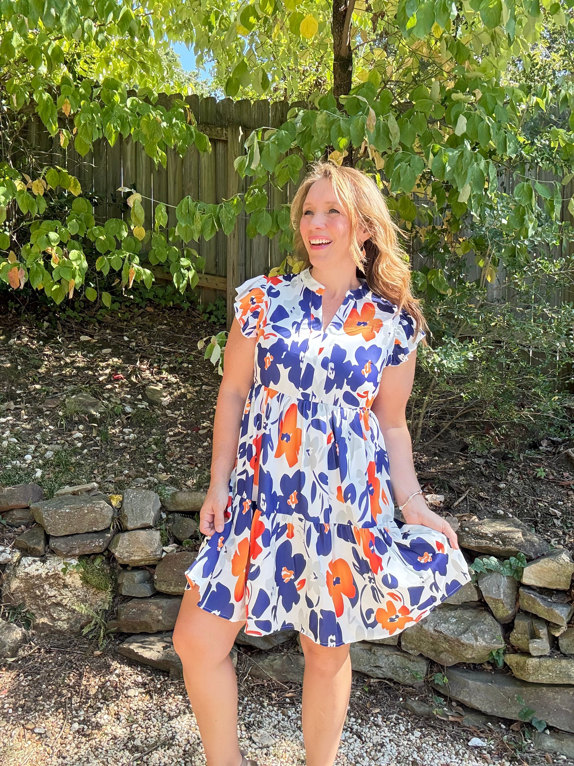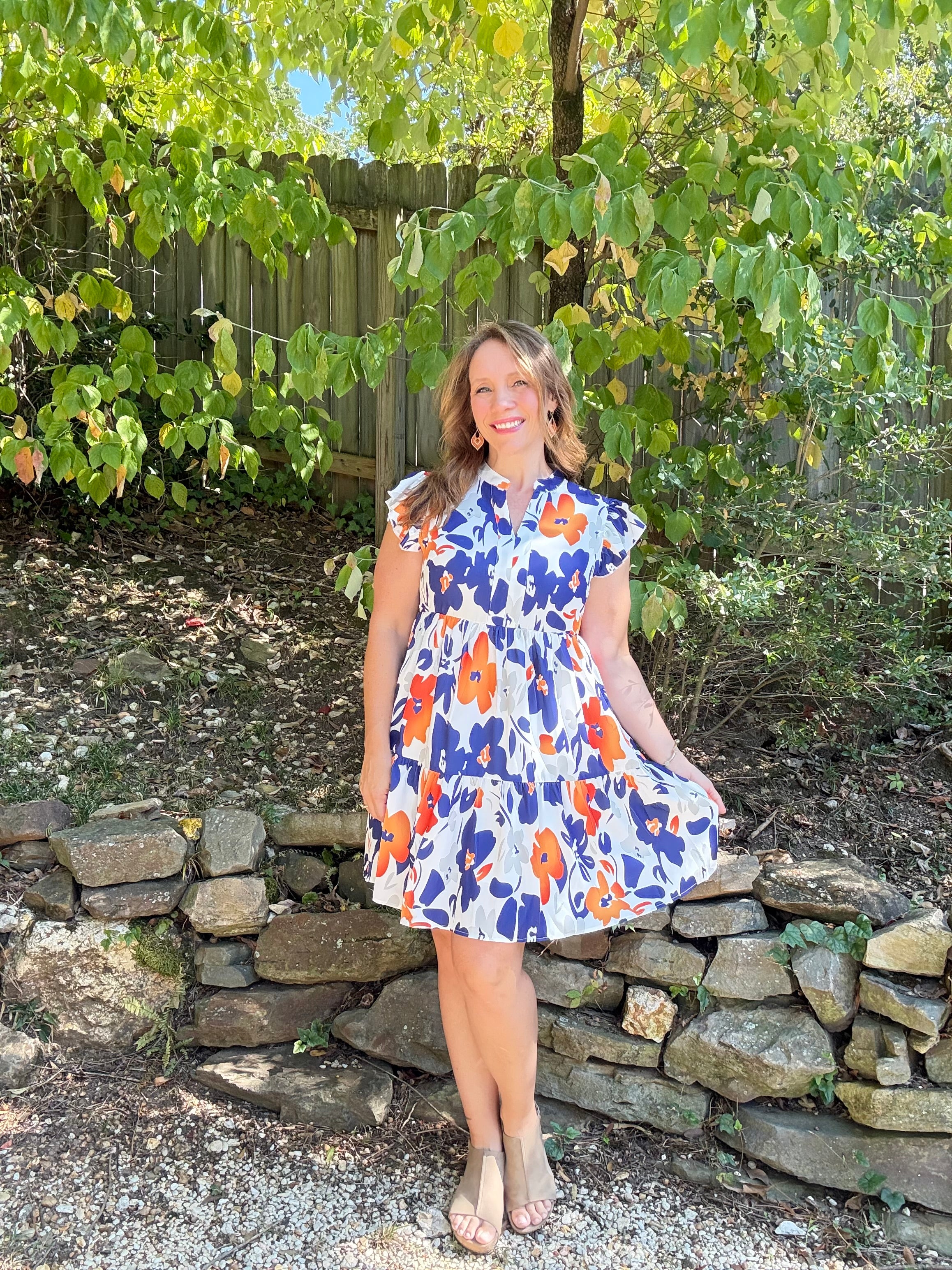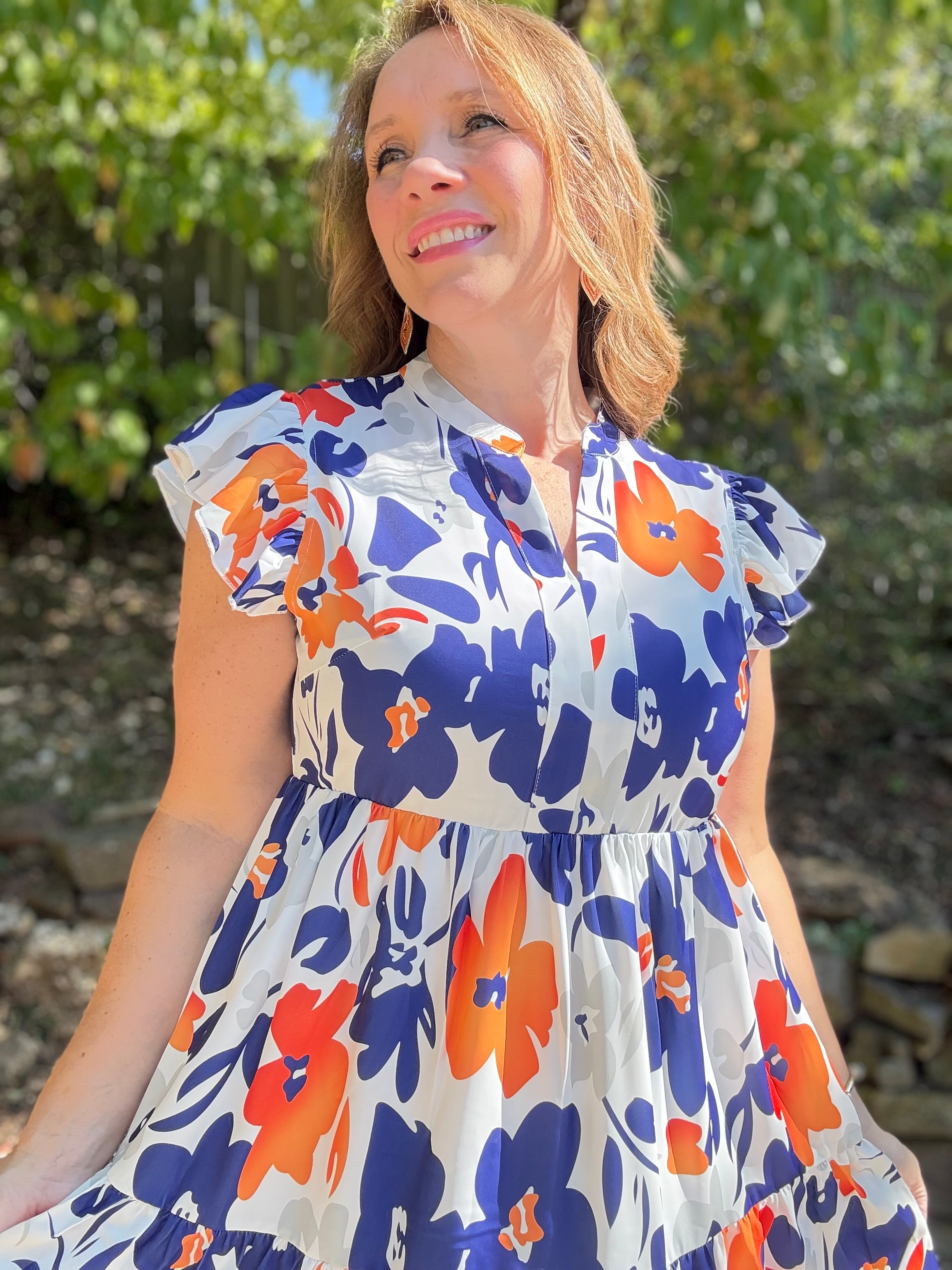 Orange Floral Print Notched Neck Flutter Sleeve Mini Dress