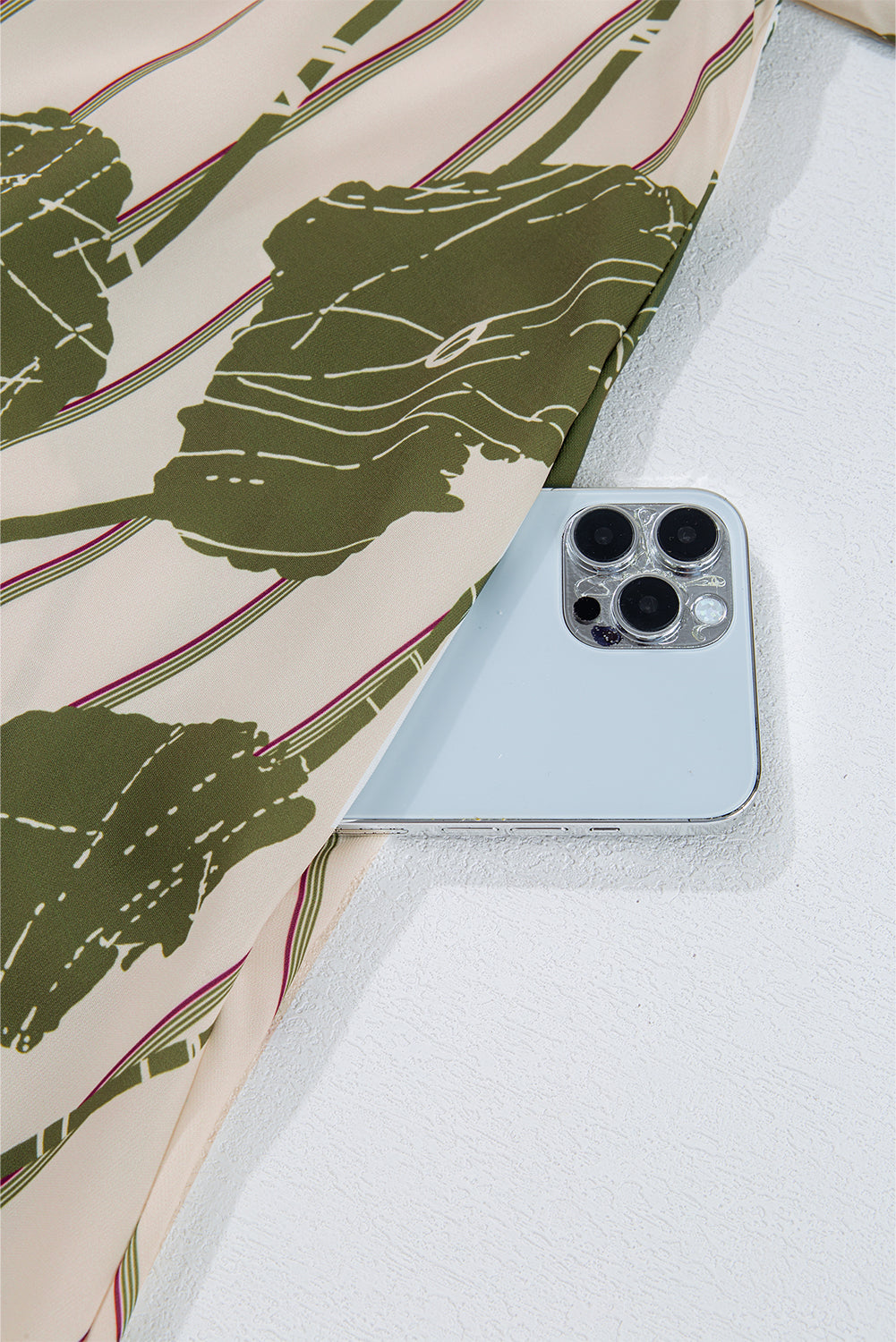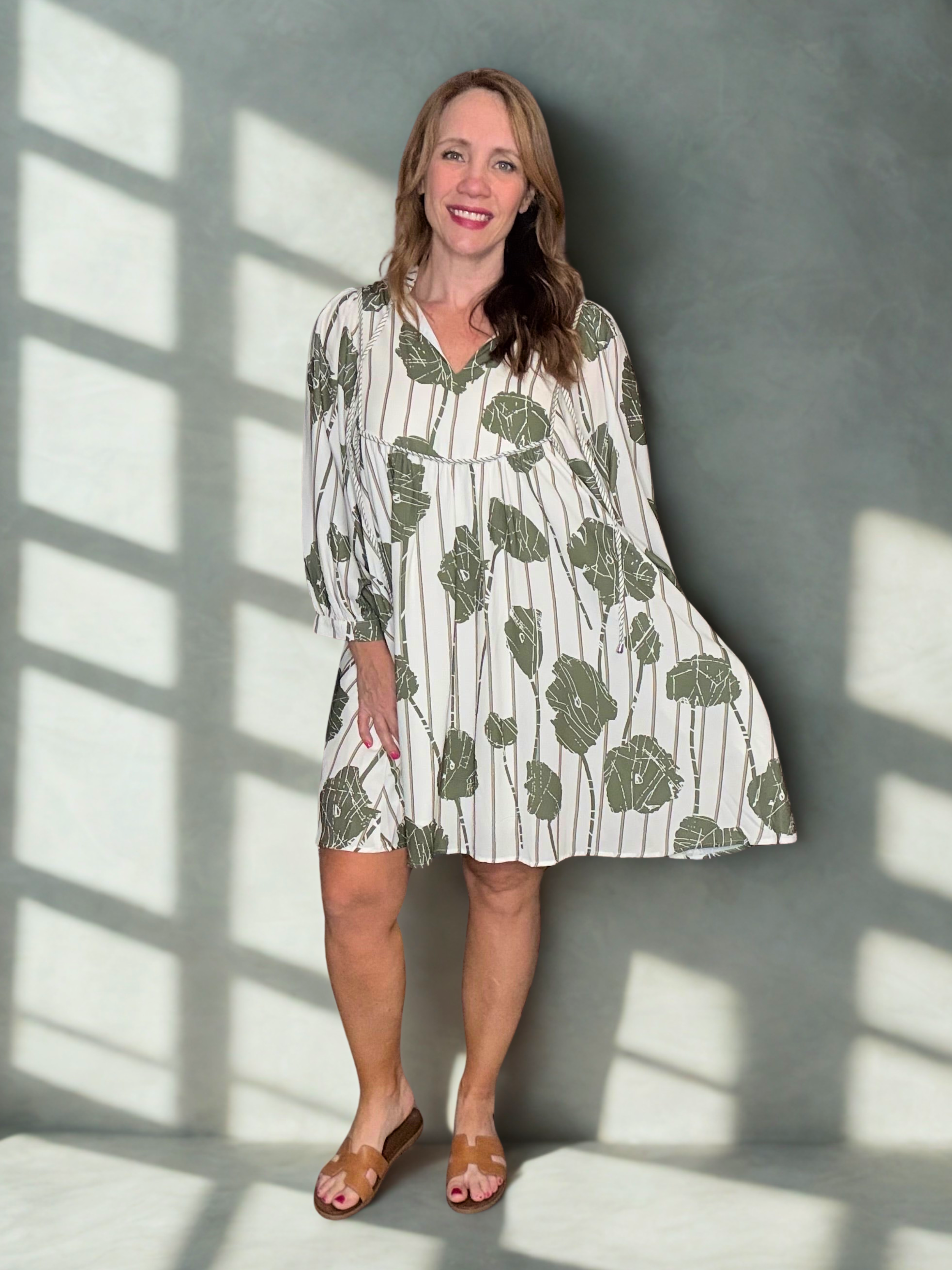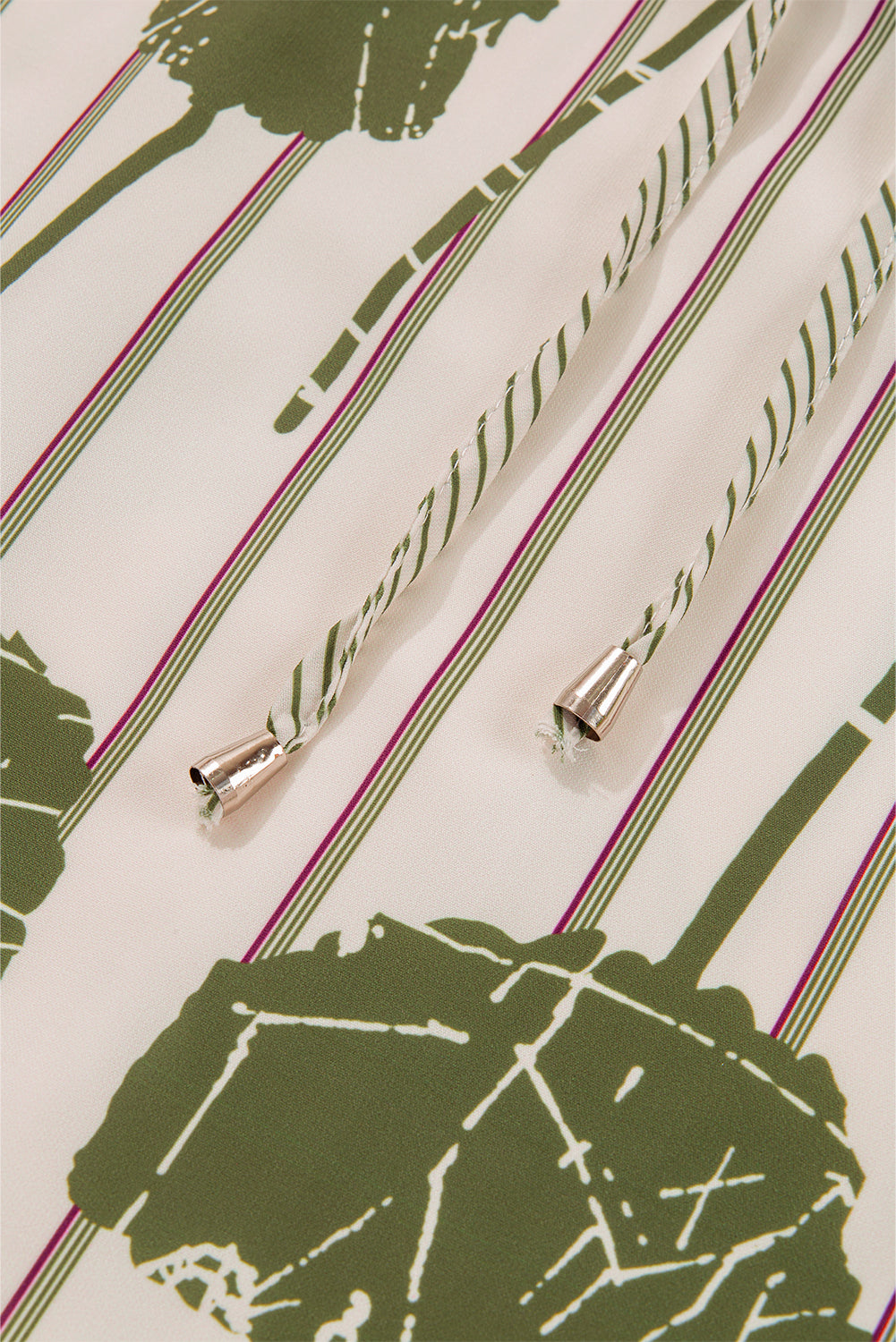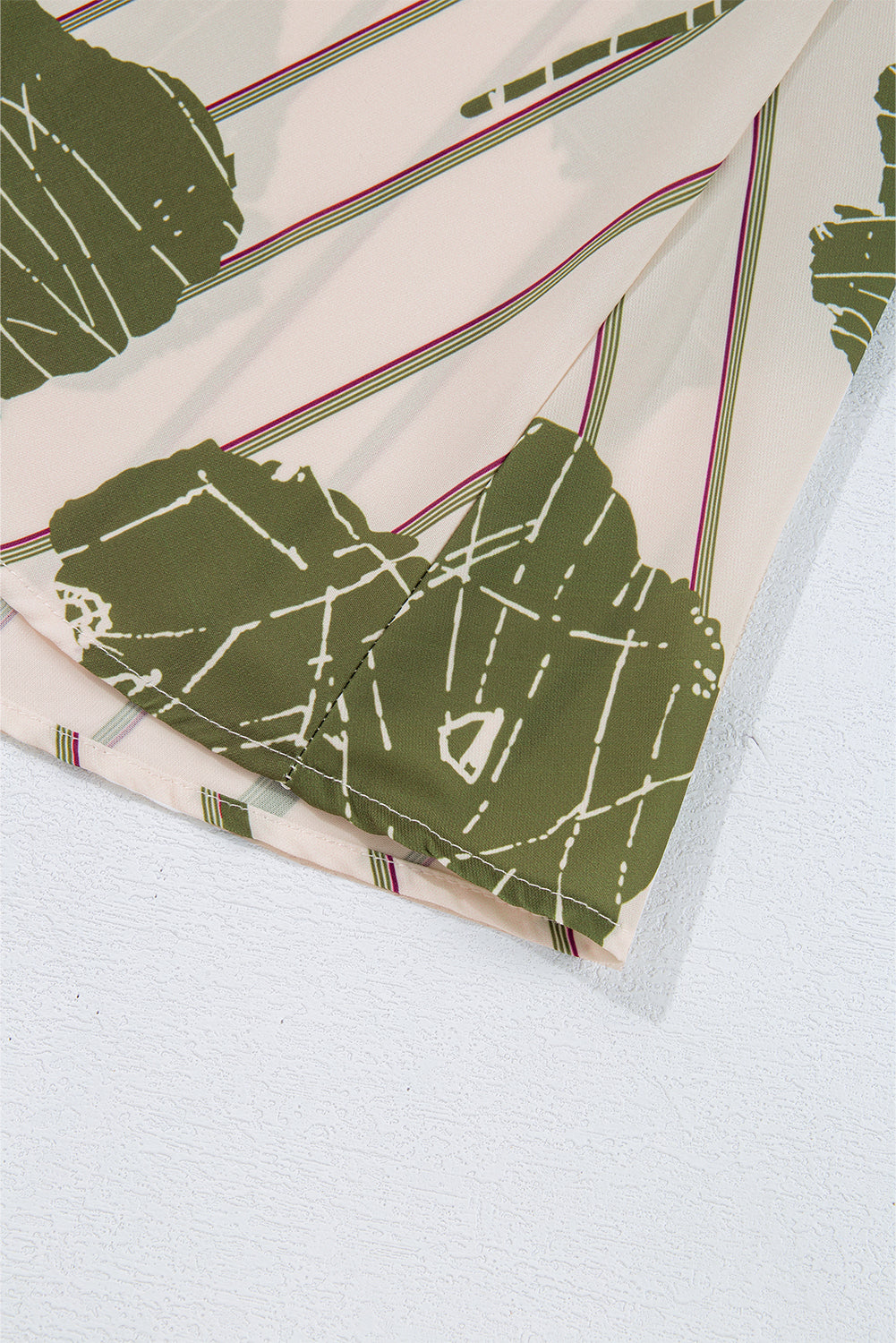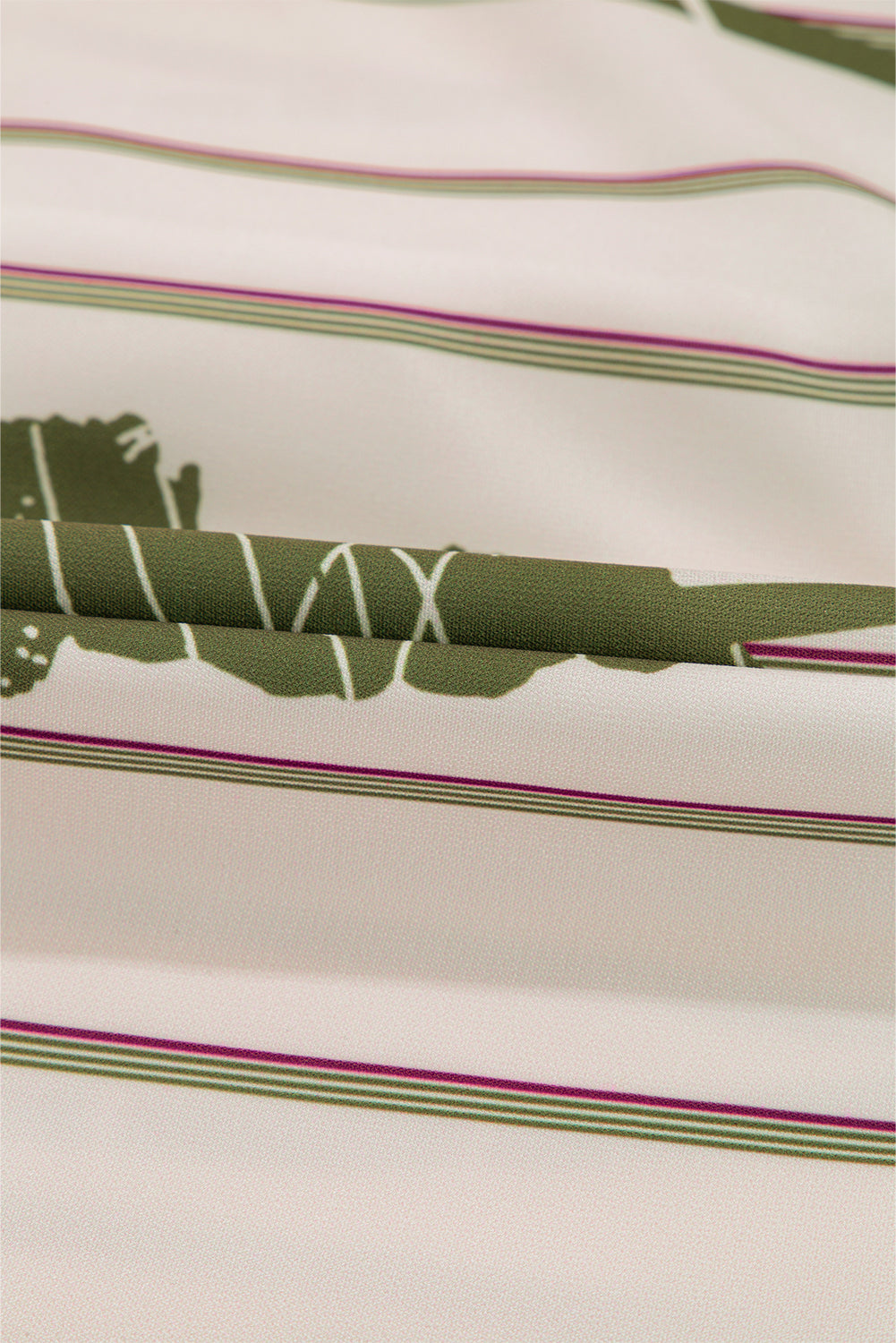 Green Floral Striped Print Contrast Piping Puff Sleeve Dress