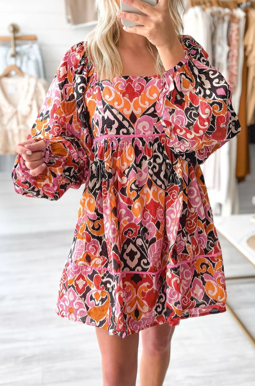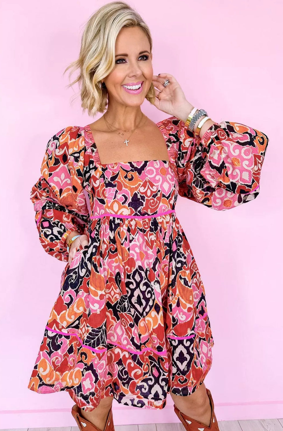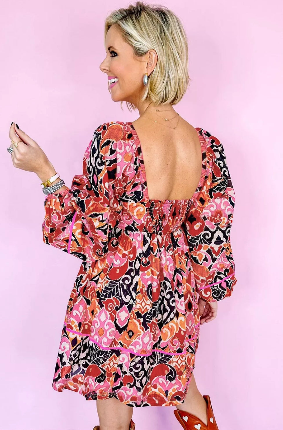 Pink Bohemian Square Neck Mini Dress