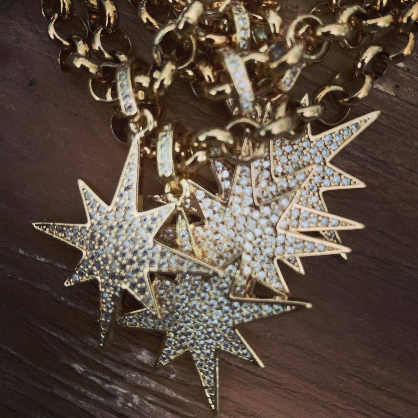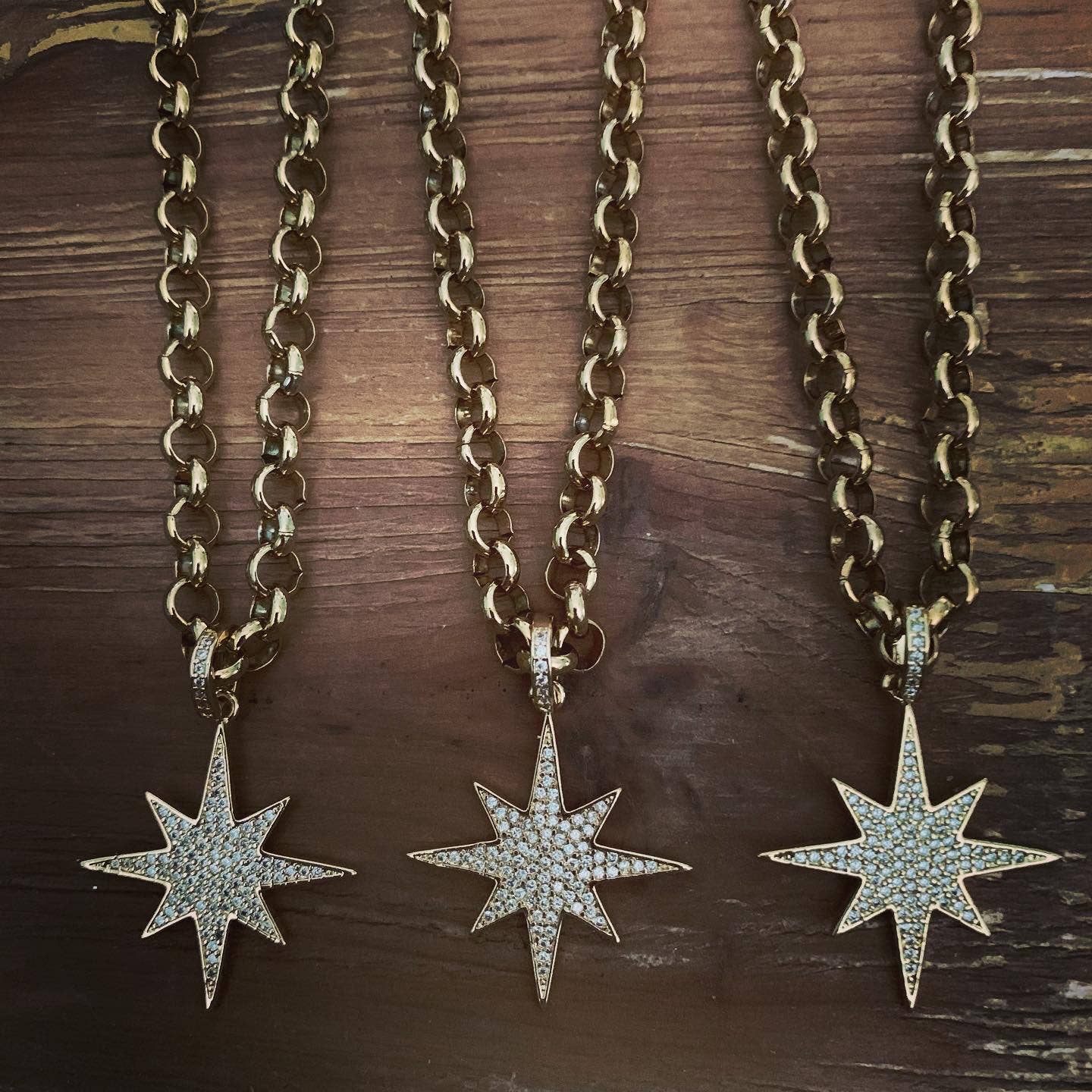 North Star Necklace by Chasing Cherubs is a large 32mm pave encrusted gold plated brass star on a 19 inch gold plated stainless steel 6mm rolo chain.