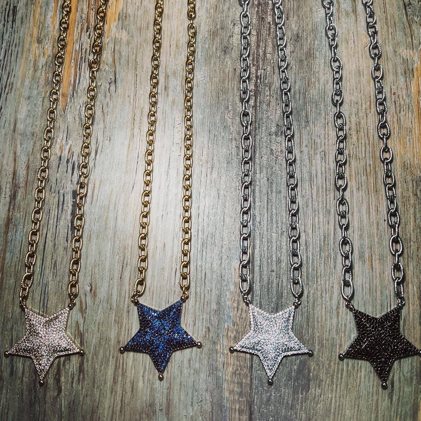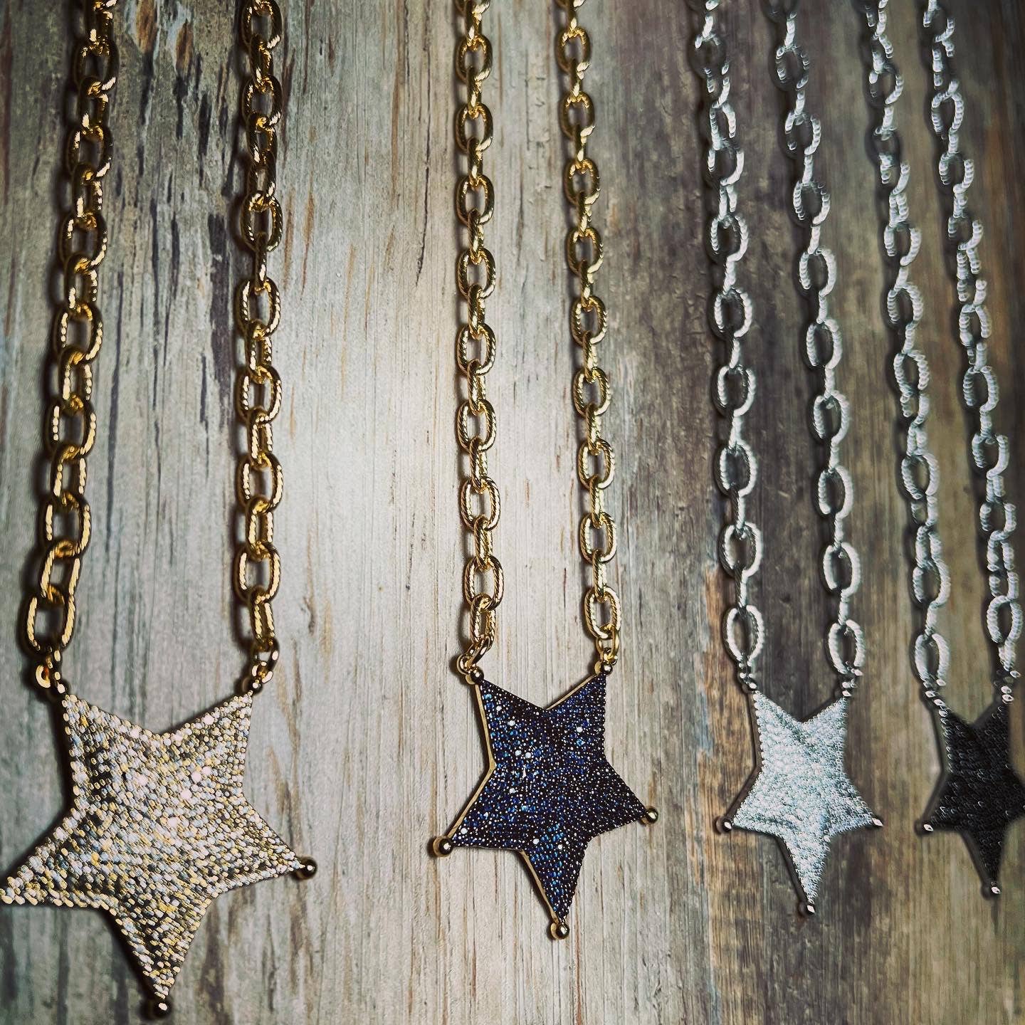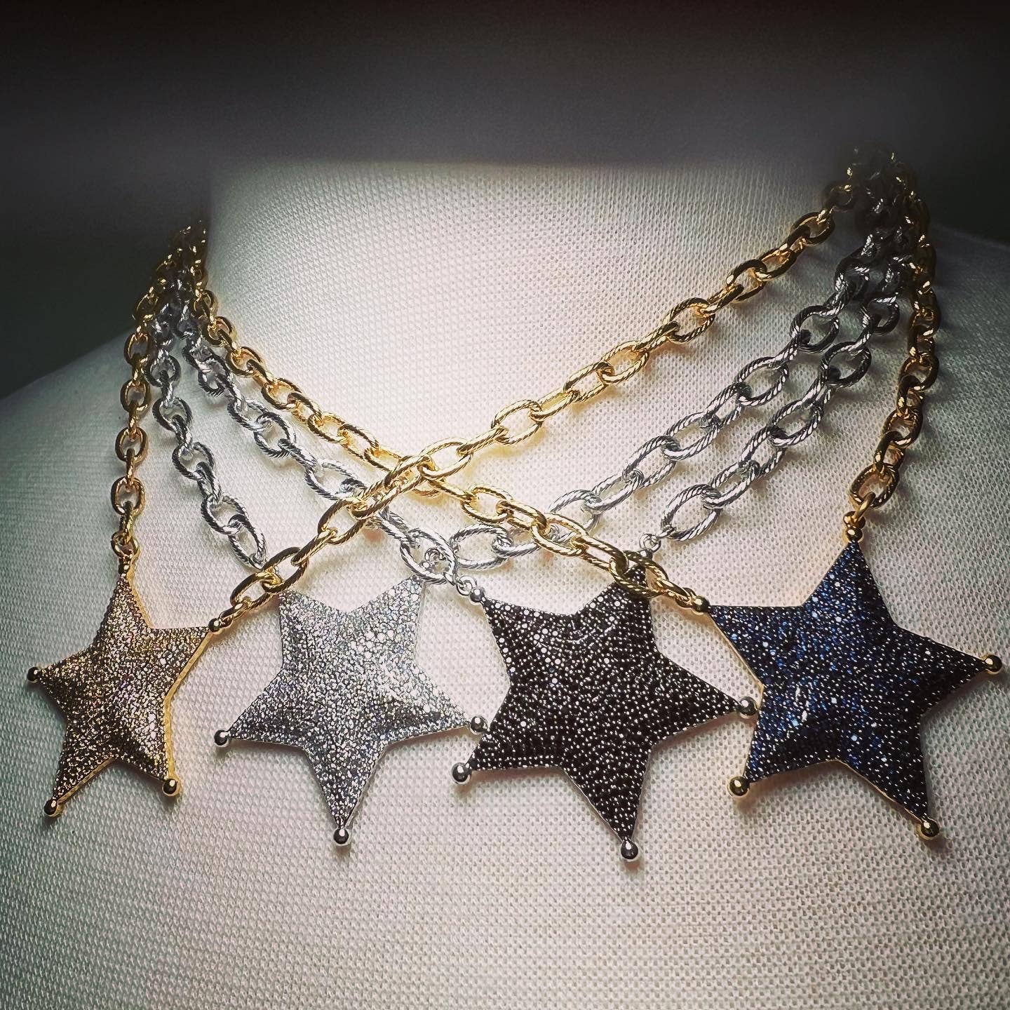 Gorgeous studded end black pave star on a textured 9mmx6mm oval link stainless-steel chain. The chain is 18 inches long and the star is 1.5 inches