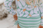 Make a splash this spring and summer in our Emily Mod Flower rash guard swimsuit! This two-piece set features a sage and white color palette with a playful vibe. The long-sleeve top showcases a modern daisy print, while the matching bottoms sport charming stripes with side tie ruching for a flattering fit. Perfect for beach days, pool parties, or water adventures—style meets sun protection in one adorable package. SPF 50. Perfect for spring & summer swims! Wash on gentle cycle cold wash, hang dry.