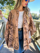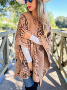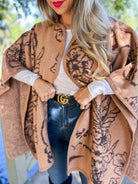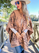 AMOLI - Camel Elegant Floral Print Cape Shawl Ruana Cardigan