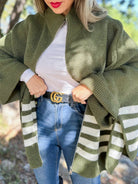 AMOLI - Olive Stripe Border Printed Zip-Up Cardigan