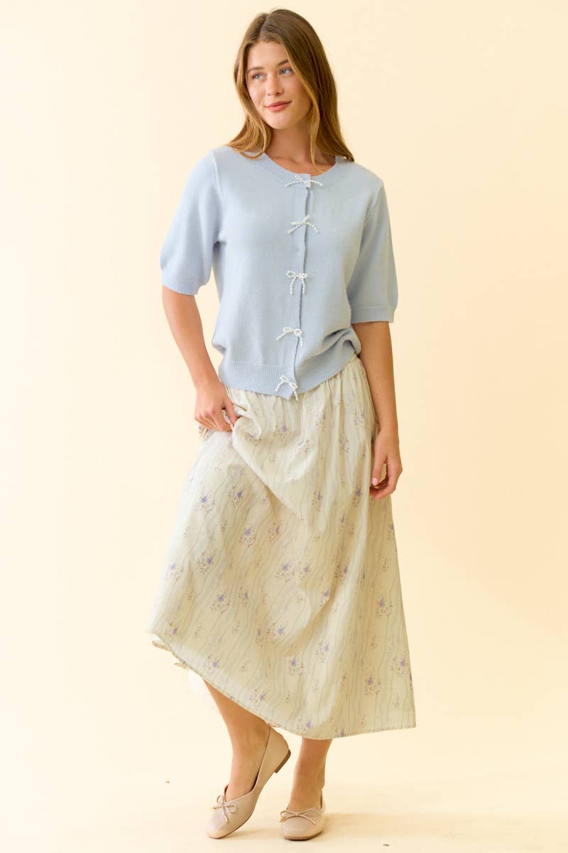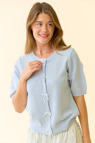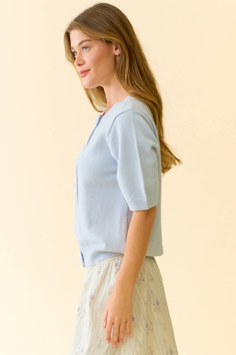 BABY BLUE PEARL BOW BUTTON SHORT SLEEVE CARDIGAN