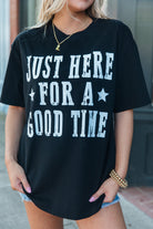 Black Just Here For A Good Time Graphic Round Neck T Shirt