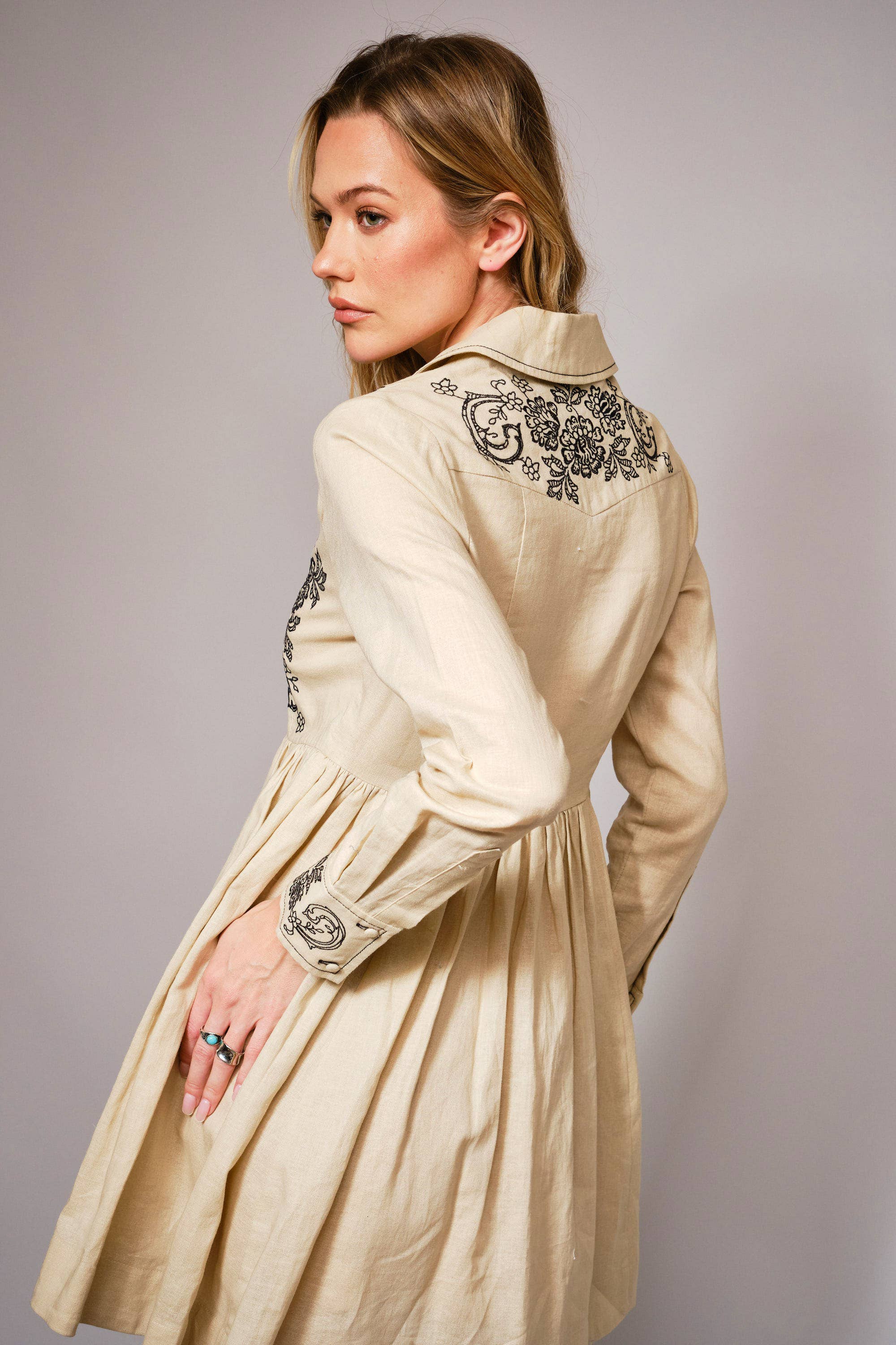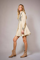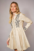 Soft structure meets vintage charm in The Heirloom Bloom Linen Embroidered Flare Dress by Blue B. Crafted from a breathable linen-cotton blend, this taupe mini dress features delicate floral embroidery across the bodice and embroidered cuffs for that timeless, artisan-inspired finish that feels both polished and easygoing.