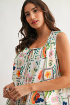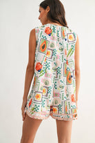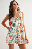 Elevate your summer wardrobe with this exquisitely crafted sleeveless romper, designed for discerning individuals who appreciate quality and unique aesthetics. The dynamic multicolor print, featuring art-inspired motifs of botanicals and geometric forms, communicates a sense of refined creativity in every detail. This piece is ideal for both relaxed leisure and sophisticated resort settings.