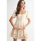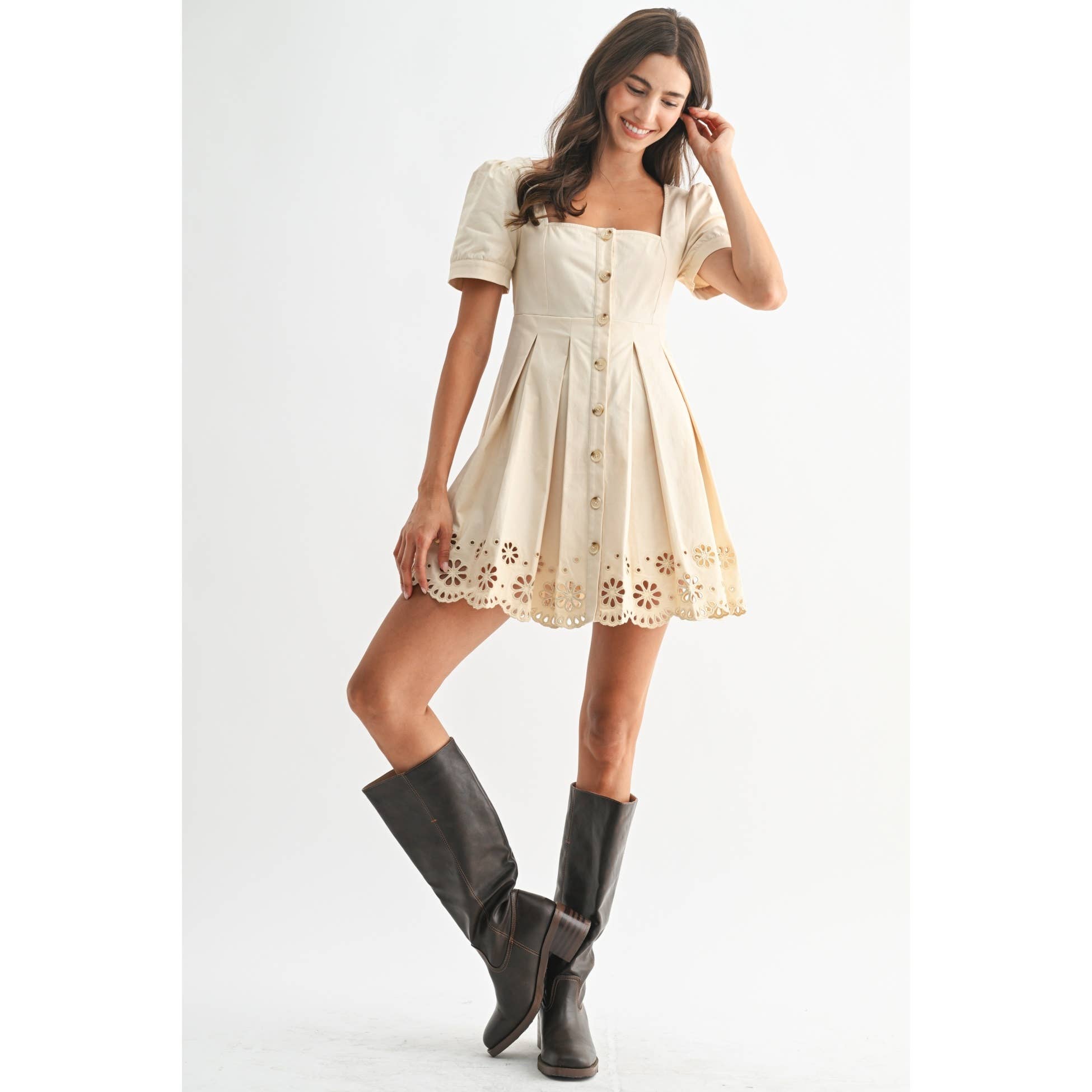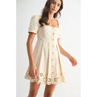 Meet the dress you’ll reach for when you want to feel effortlessly beautiful. The Camellia Cream Eyelet A-Line Dress is a dreamy blend of classic femininity and modern boutique style. Designed in a soft cream hue, this short sleeve A-line dress features a flattering square neckline, delicate puff sleeves, and a fully functional button-front for timeless appeal.