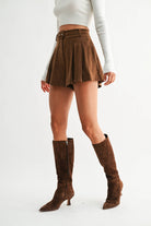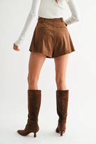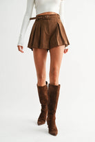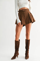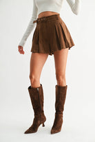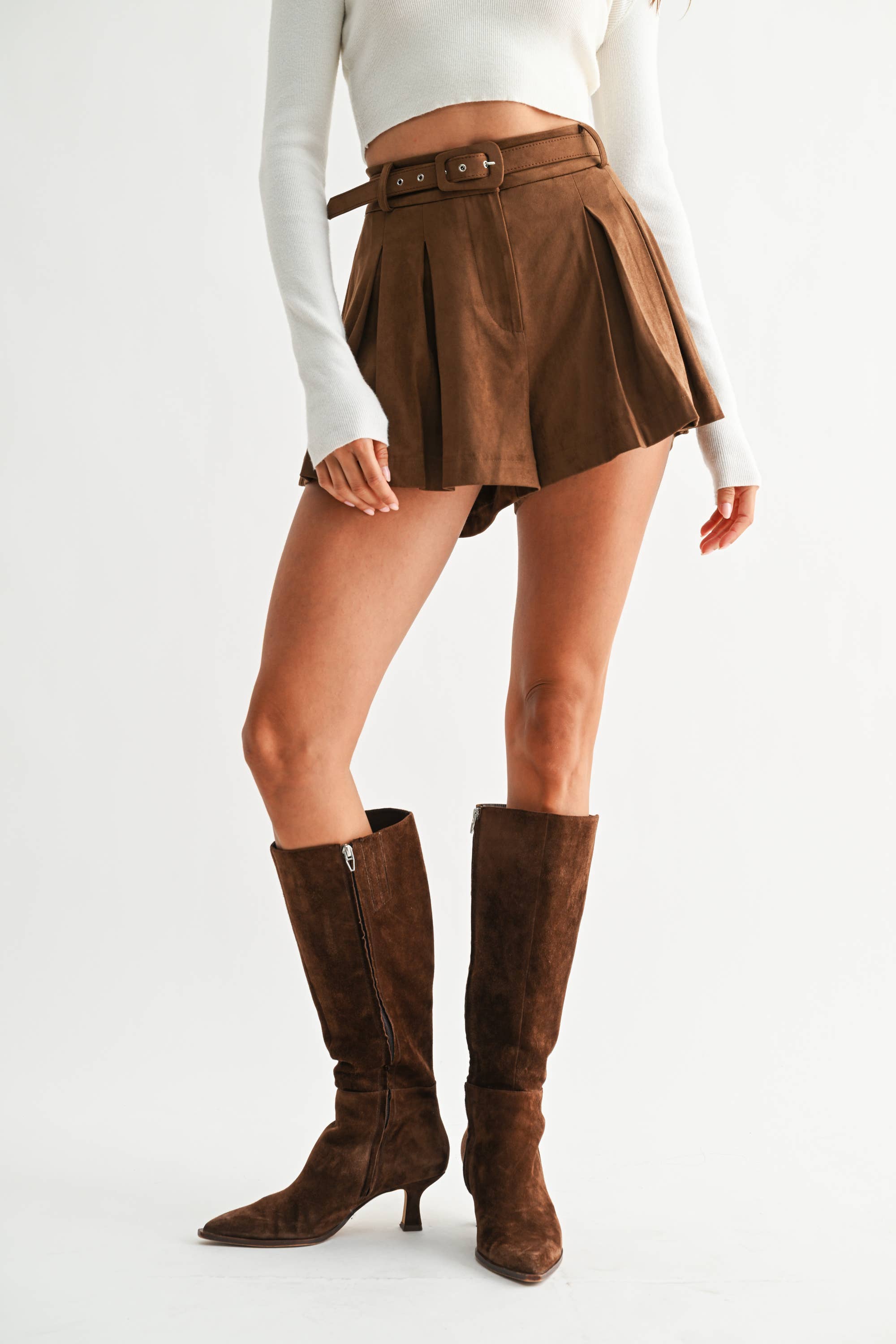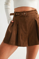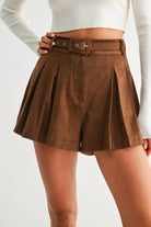 Camellia - High-Waisted Brown Pleated Suede Shorts with Belt