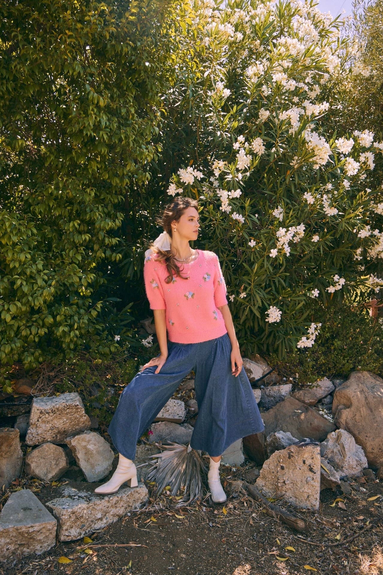 Style it casually with wide-leg denim or relaxed trousers for weekend wear, or lean into a romantic vibe by pairing it with a faux leather skirt, as styled in our lookbook. For the office, layer it with tailored trousers to create a chic contrast of texture, softness, and shine. Whether you’re dressing it up or down, this sweater delivers cozy comfort with a playful, feminine edge.
