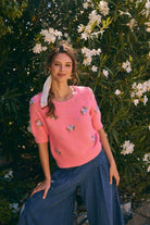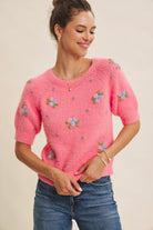 Candy Pink Bloom Embroidered Fuzzy Sweater
