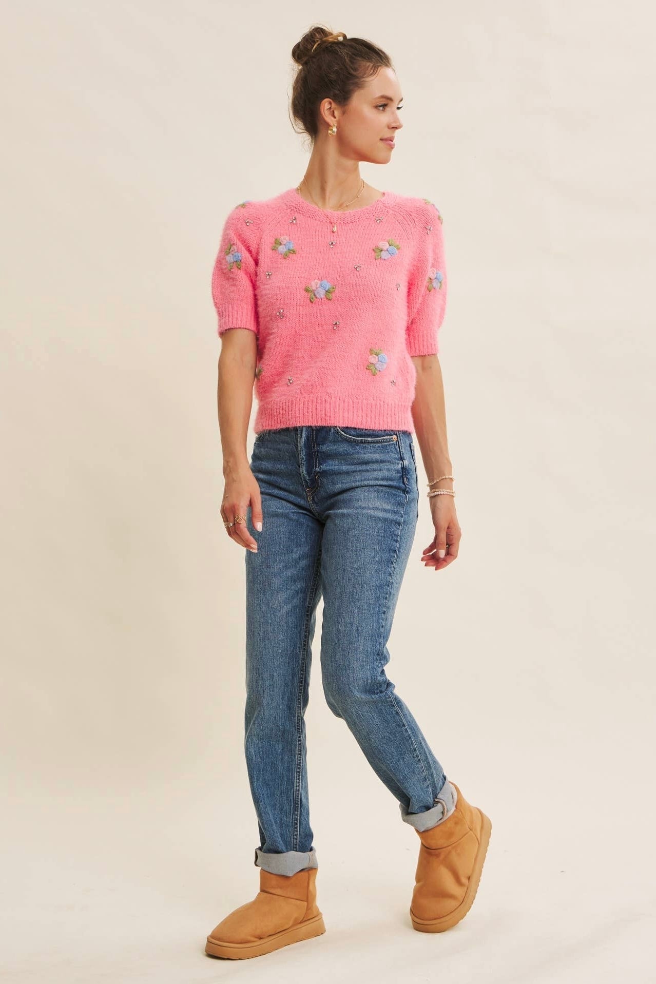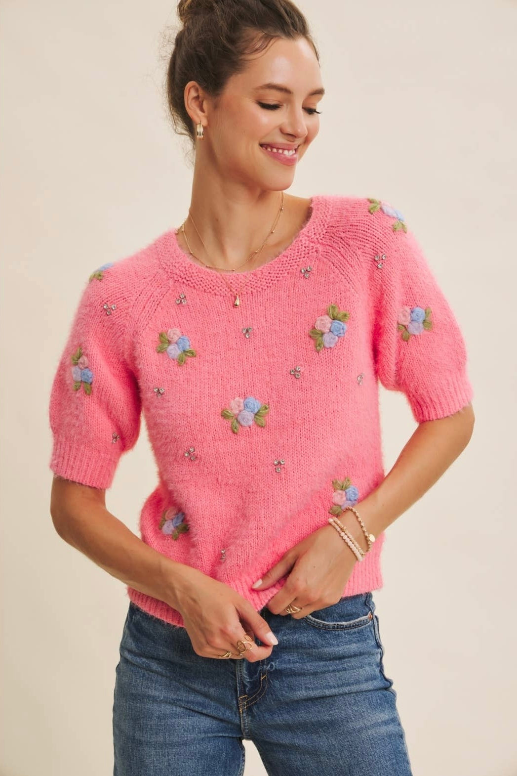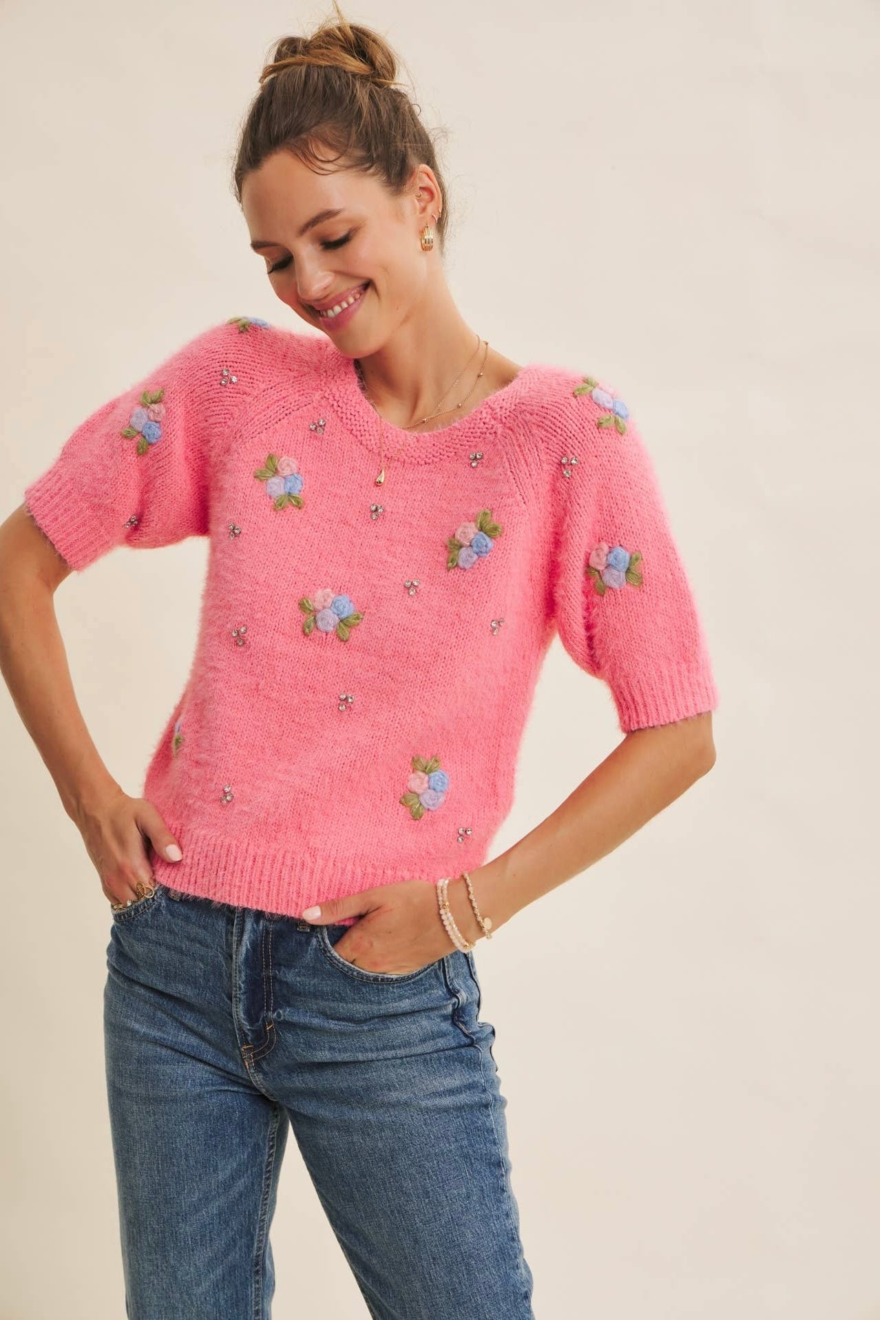 This soft, fuzzy sweater features elegant floral embroidery accented with subtle scattered rhinestones, adding just the right amount of sparkle for daytime shine or evening glow. The cotton-blend knit provides warmth without feeling heavy, making it ideal for layering through fluctuating seasonal temps. A classic round neckline and raglan sleeves create a relaxed, flattering fit that feels effortless yet elevated.