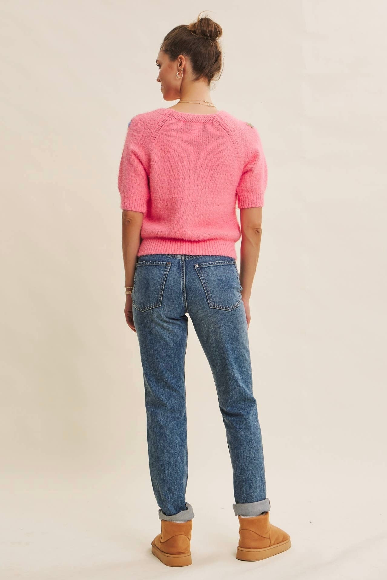 Who says cozy can’t be bright? Our Bloom Embroidered Fuzzy Sweater in Candy Pink by in february is the perfect blend of warmth, whimsy, and polished charm—designed to bring joy into fall and winter dressing while transitioning beautifully into early spring.