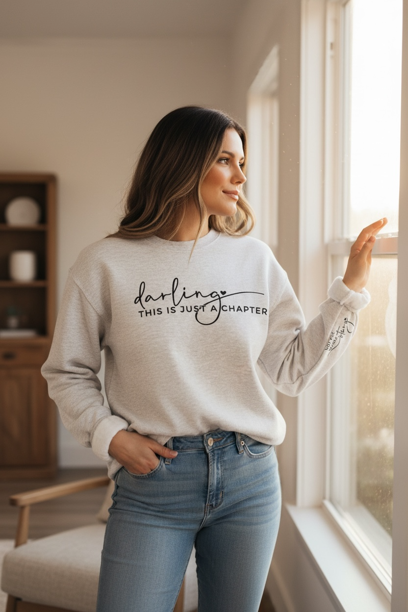 Wrap yourself in comfort, confidence, and a powerful reminder with our Darling, This Is Just a Chapter – Not The Whole Story Heather Grey Inspirational Sleeve Crew Sweatshirt. Designed for women who know their journey is still unfolding, this cozy crewneck blends meaningful style with everyday wearability.