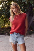 Soft, airy, and beautifully detailed. Designed in a breathable cotton-blend sweater knit, the silhouette stays light enough for warm spring days yet polished enough for transitional layering. The open-knit front yoke is the standout: a delicate, chevron-like pattern that adds texture, femininity, and subtle skin-peek detail without ever feeling too sheer. The sleeveless shape drapes softly at the body, creating a flattering look that pairs seamlessly with any bottom - denim shorts for weekend getaways, linen trousers for an elevated brunch look, or flowy skirts for a soft romantic mood. Its versatility makes it a spring–summer essential your customers will reach for again and again. Dress it up. Keep it casual. Take it from day to dinner. A timeless knit they’ll instantly fall in love with. Features - Round neck - Open knit at the front yoke - Ribbed band and sleeves - Cotton blend sweater knit top - Sleeveless Size + Fit Model is 5'9.5" and wearing a size Small. Please refer to our s