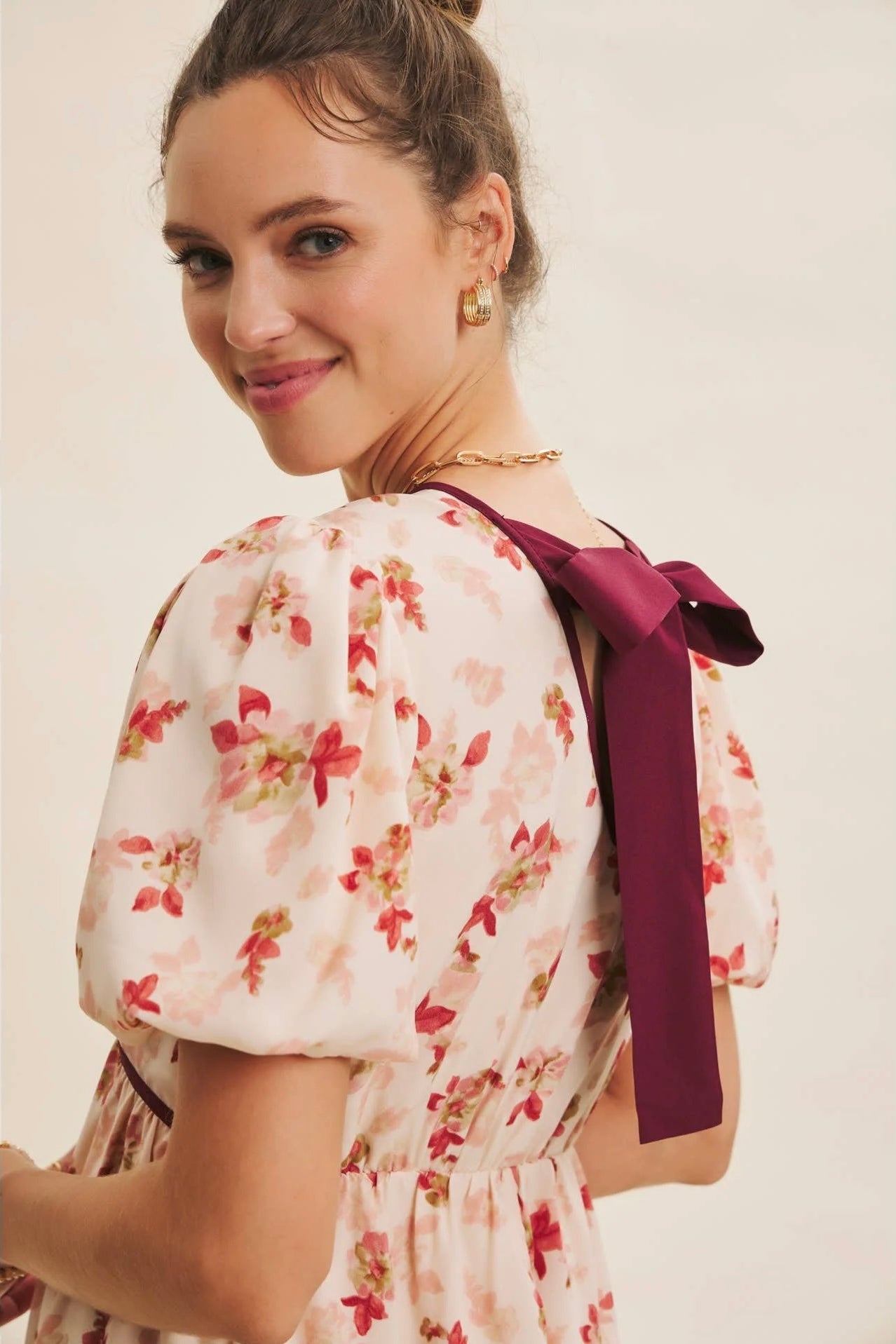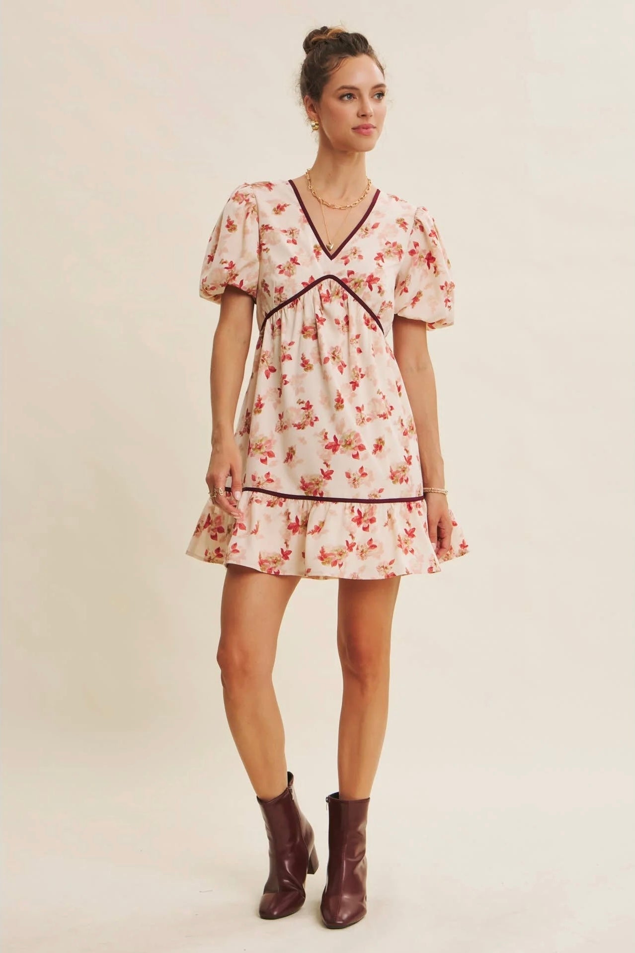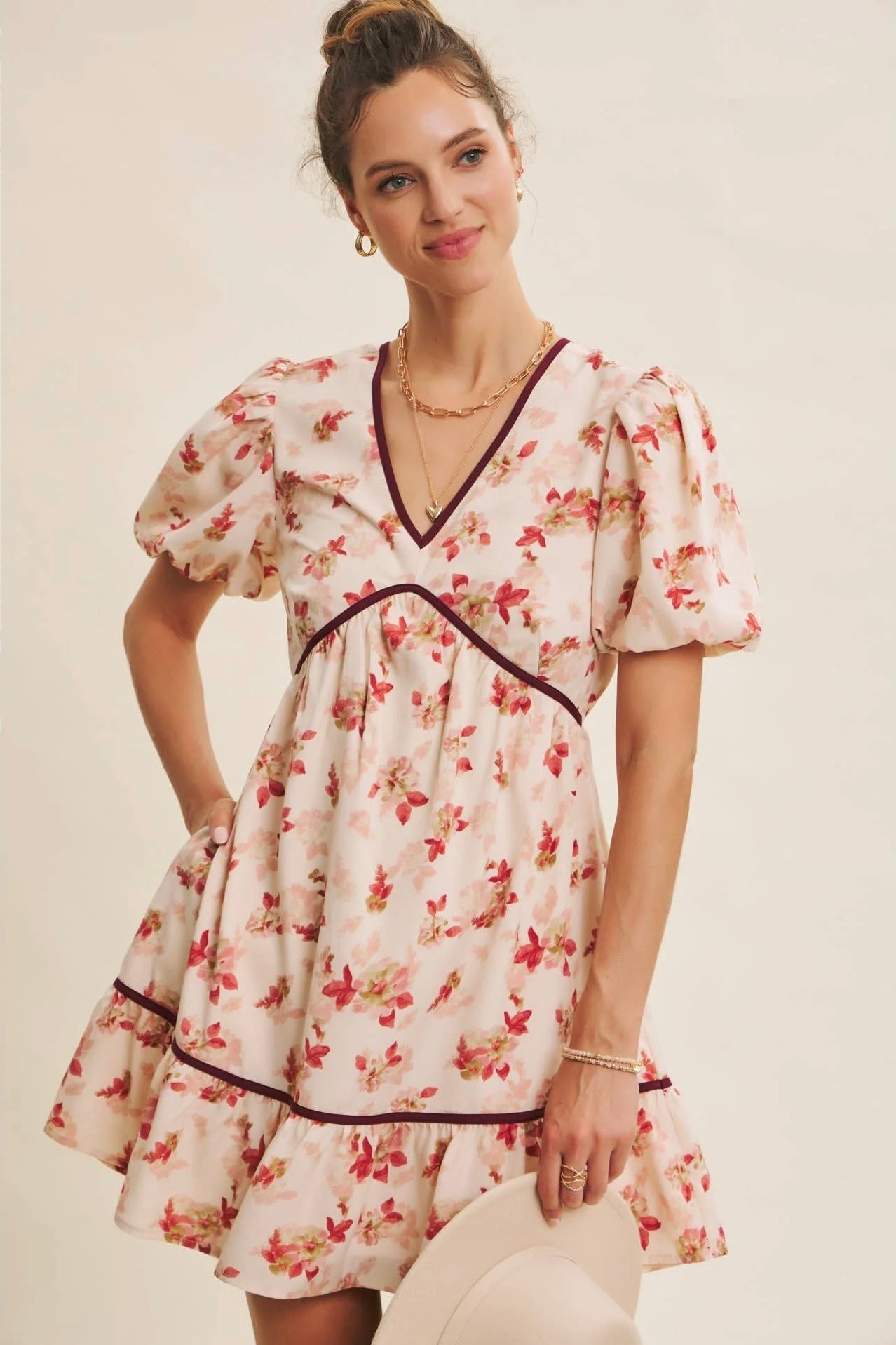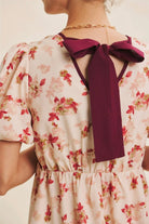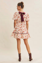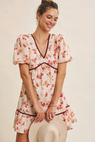This is the kind of dress that instantly lifts your mood. Sweet, romantic, and full of feminine charm, this mini features a delicate floral print and thoughtfully placed contrast trim to give it a slightly elevated, polished finish. The flared silhouette feels flirty yet wearable, while the puffed bubble sleeves add just the right touch of playful drama. A deep V neckline flatters the collarbone and draws attention to the face, while the back is finished with a statement bow tie—unexpected and utterly darling. Perfect for holiday house parties, festive girls' nights, or a dreamy date night look. You'll love how it balances cute and elegant in the most effortless way. Features - Romantic floral - V-neckline - Flare mini dress - Short bubble sleeves - Contrast binding detail - Back bow tie - Sid pockets - Lined Size + Fit Model is 5'9.5" and wearing a size Small Please refer to our size chart.