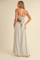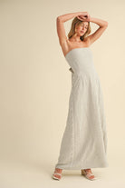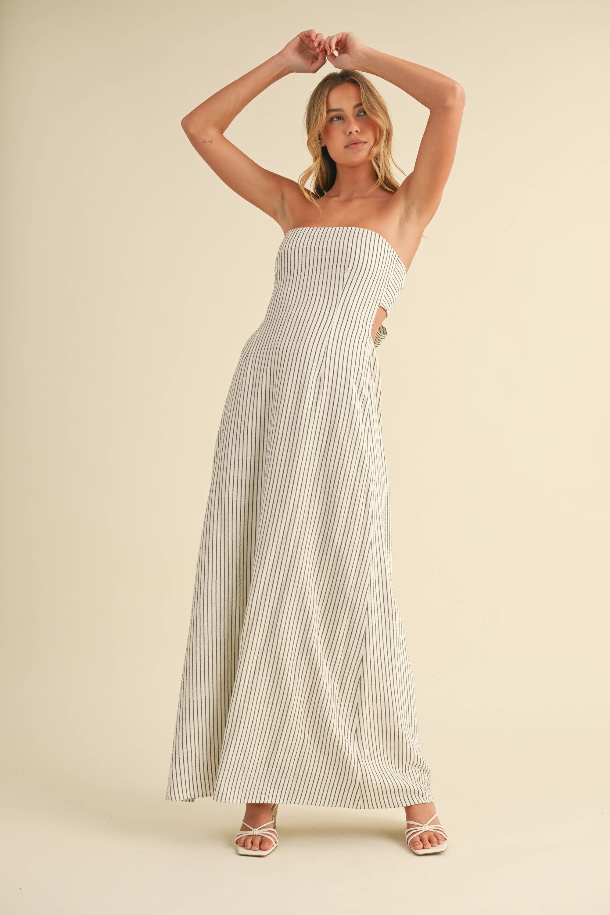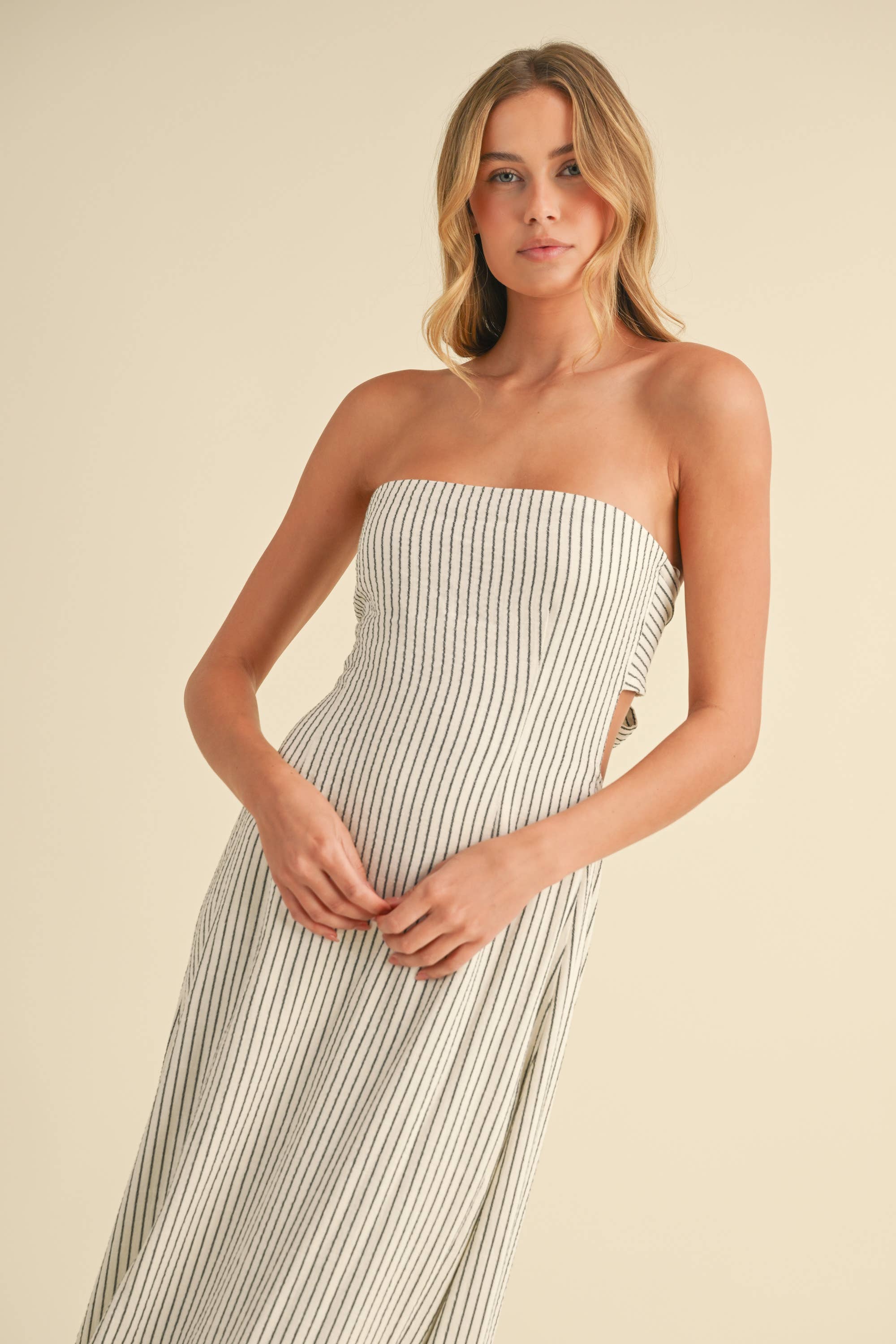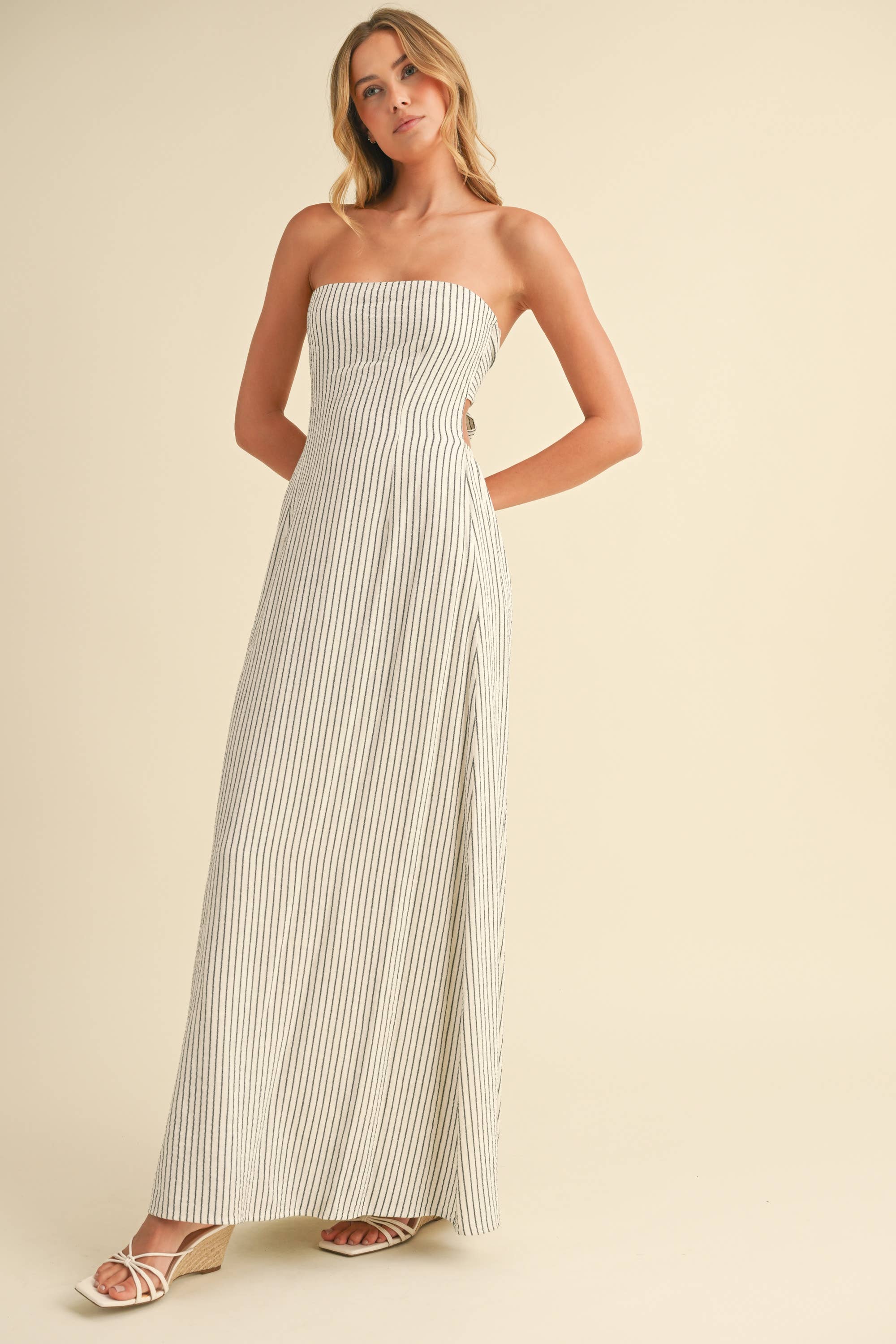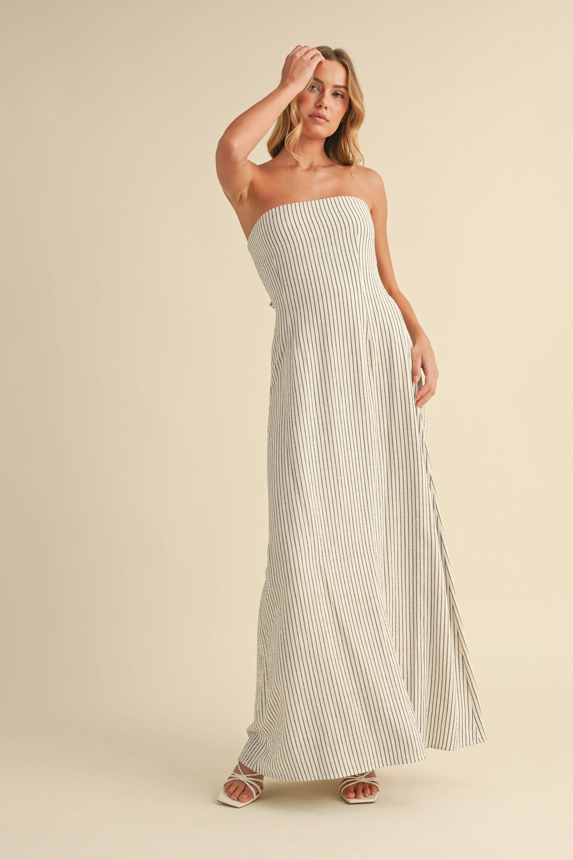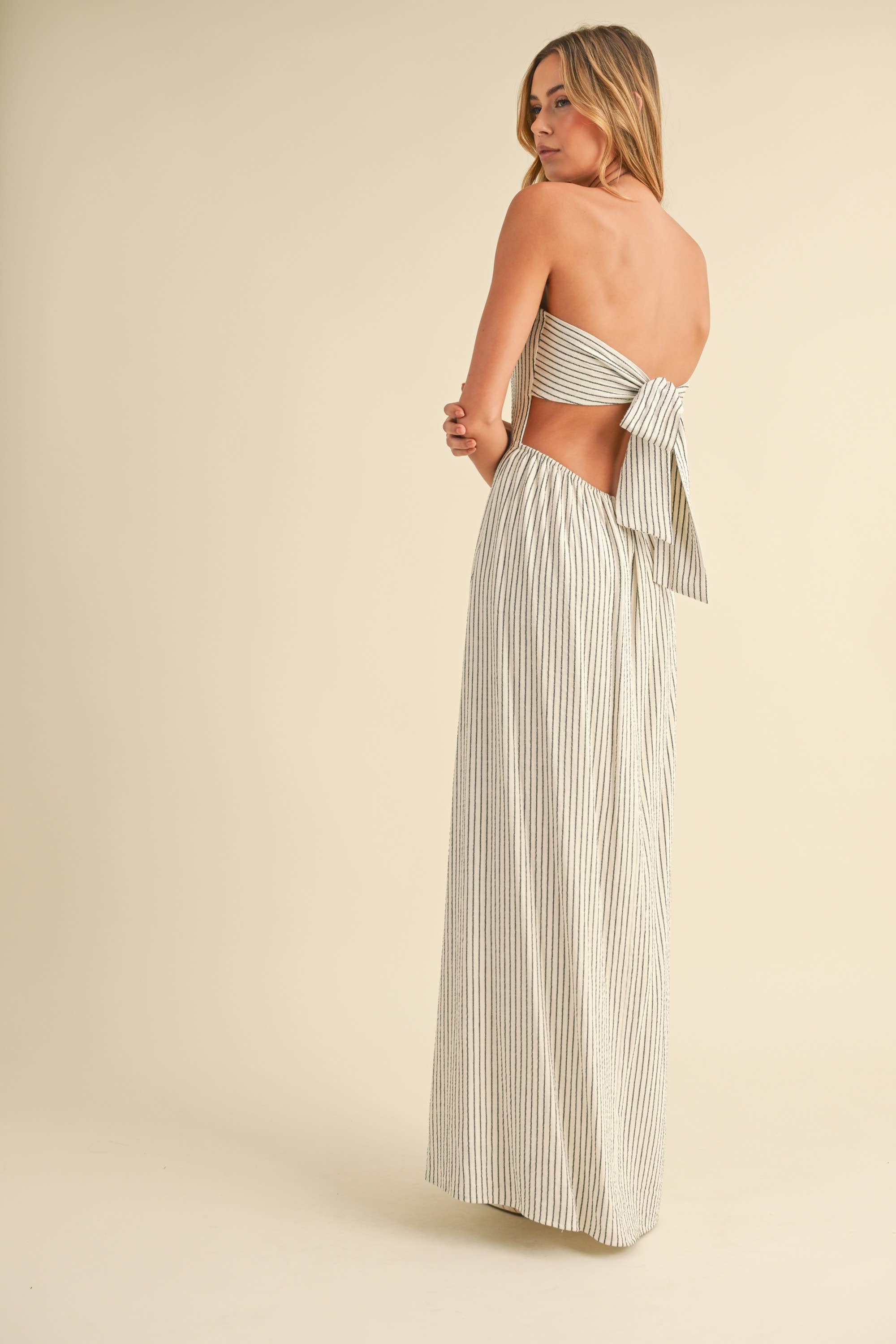 STRIPED LONG BACK TIE STRAPLESS MAXI DRESS: IVORY