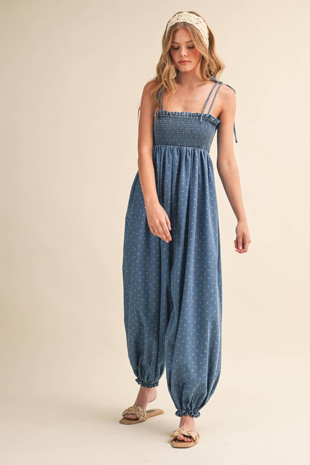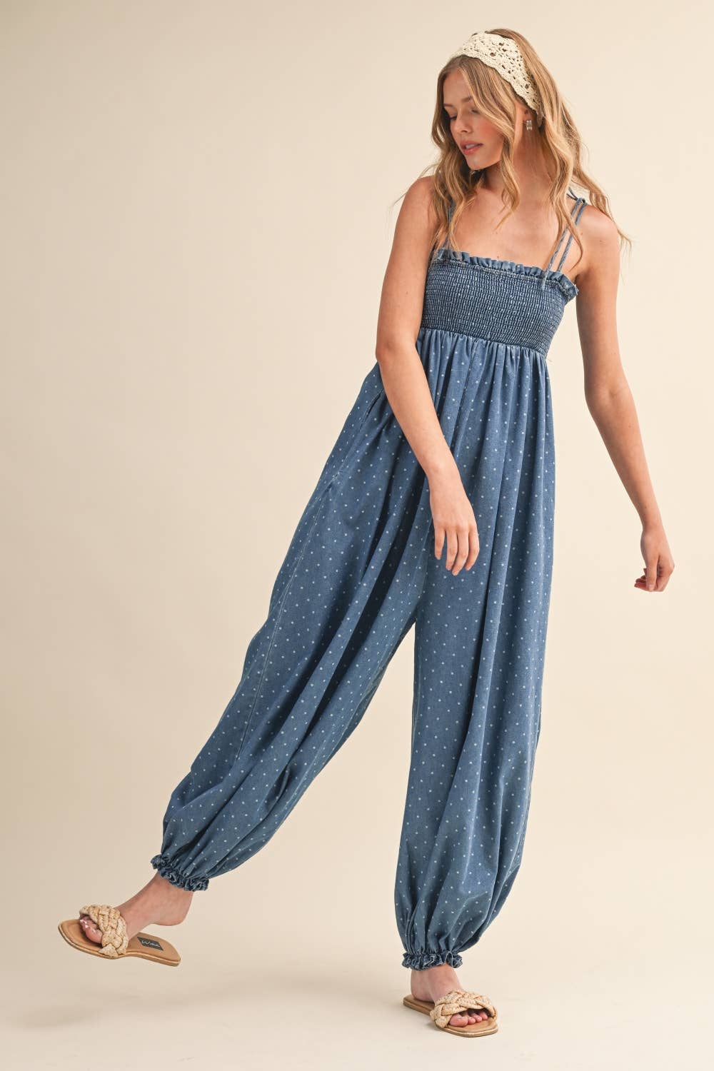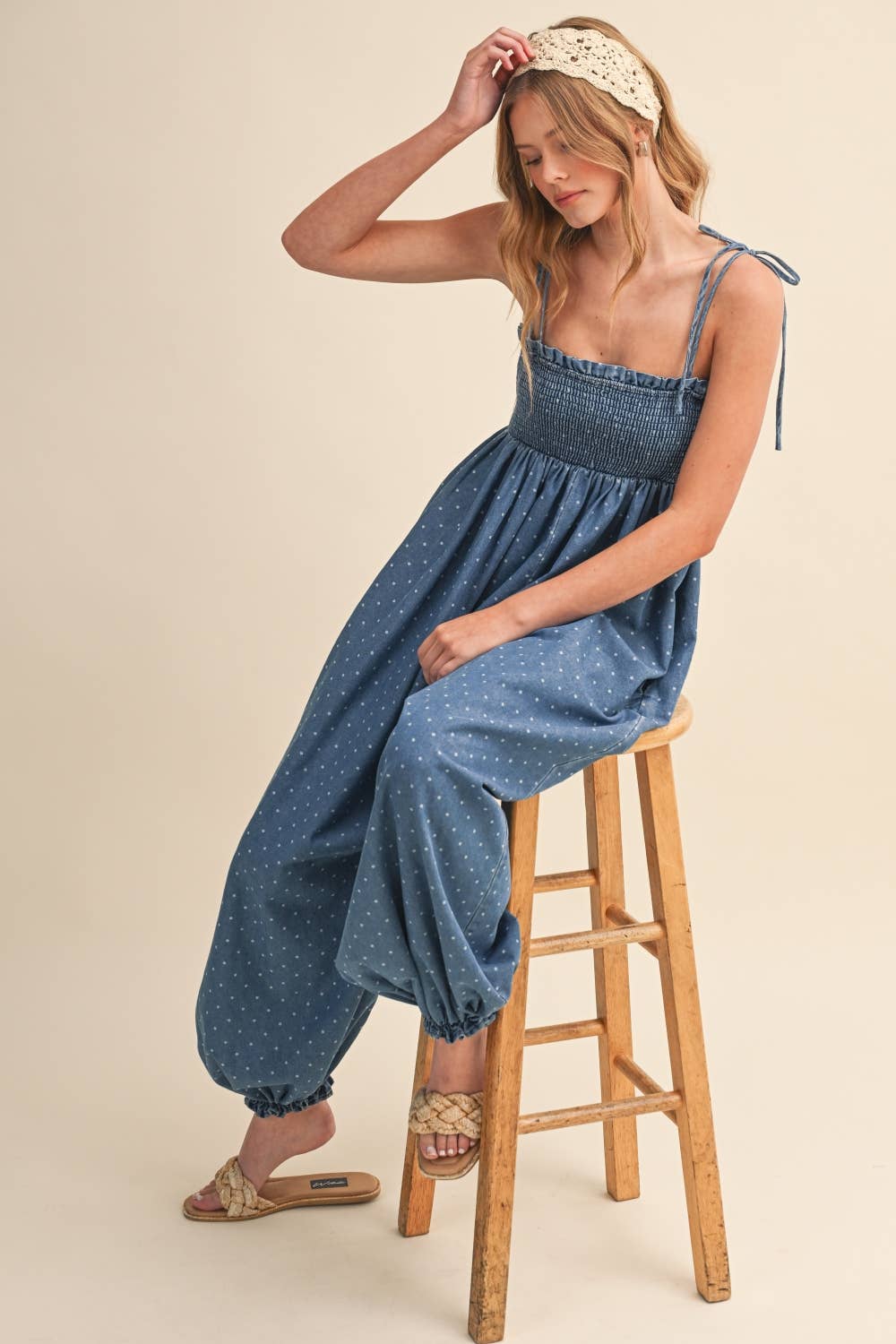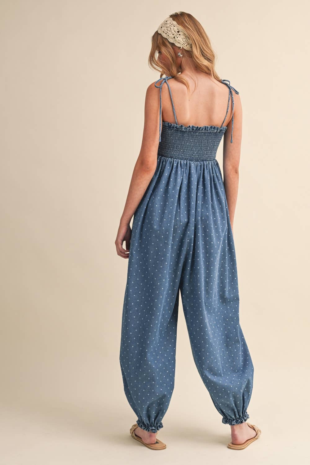 POLKA DOT PRINTED SHAPELESS SILHOUETTE JUMPSUIT: DENIM