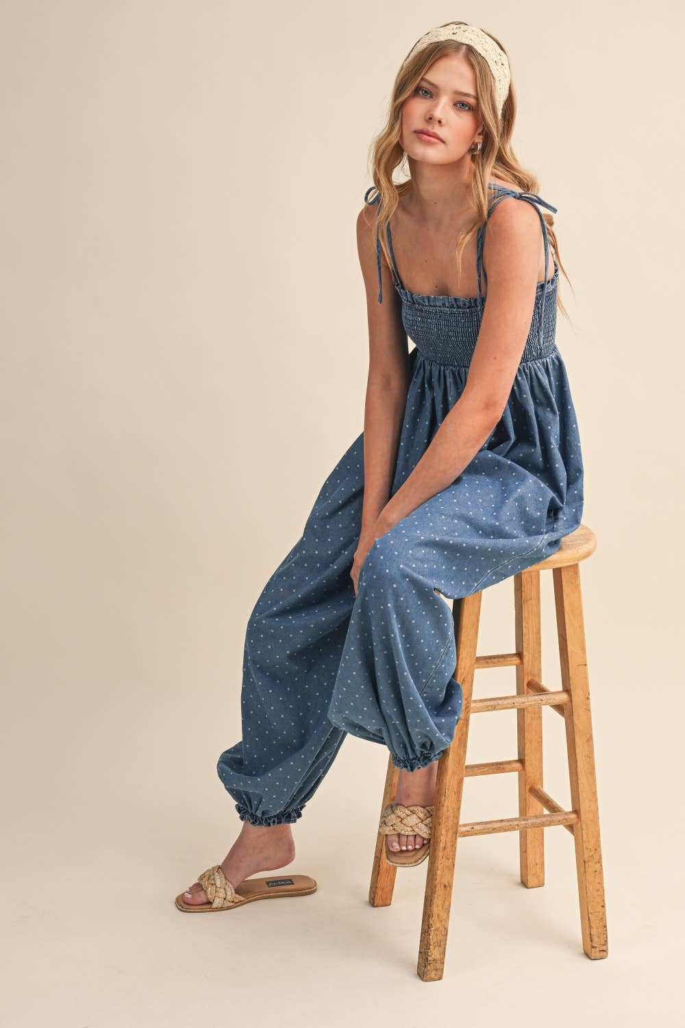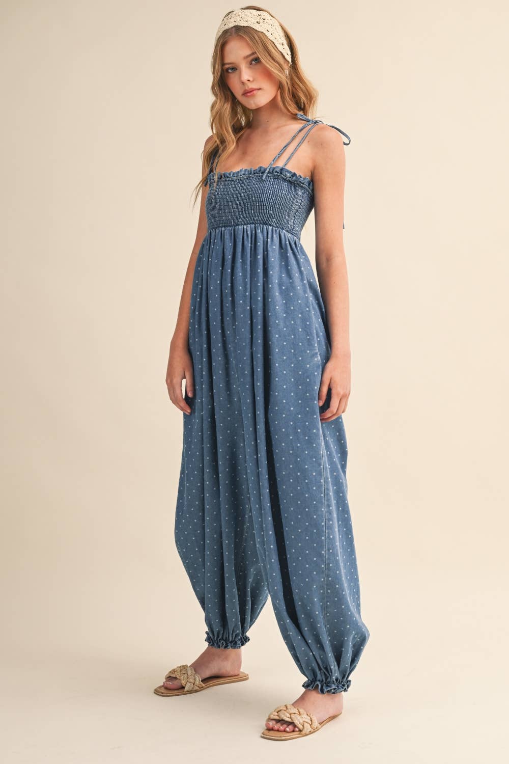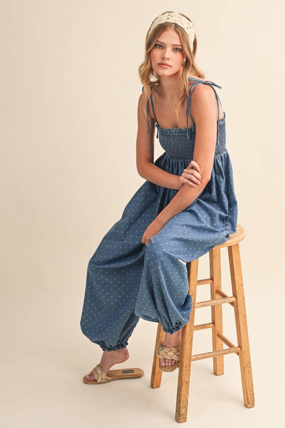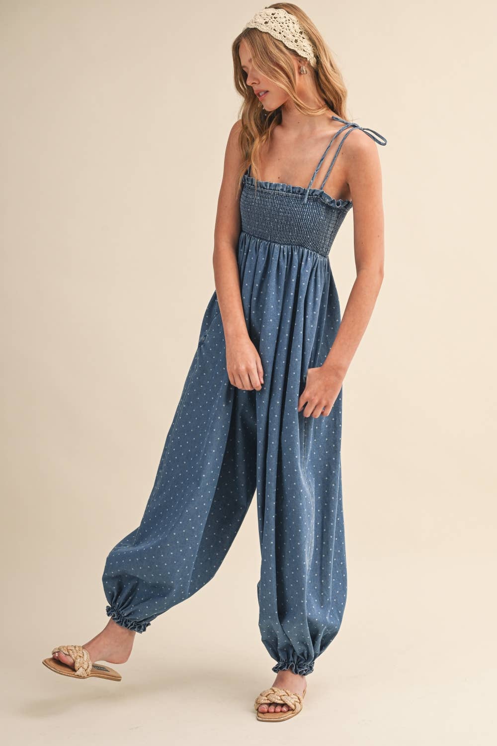 POLKA DOT PRINTED SHAPELESS SILHOUETTE JUMPSUIT: DENIM