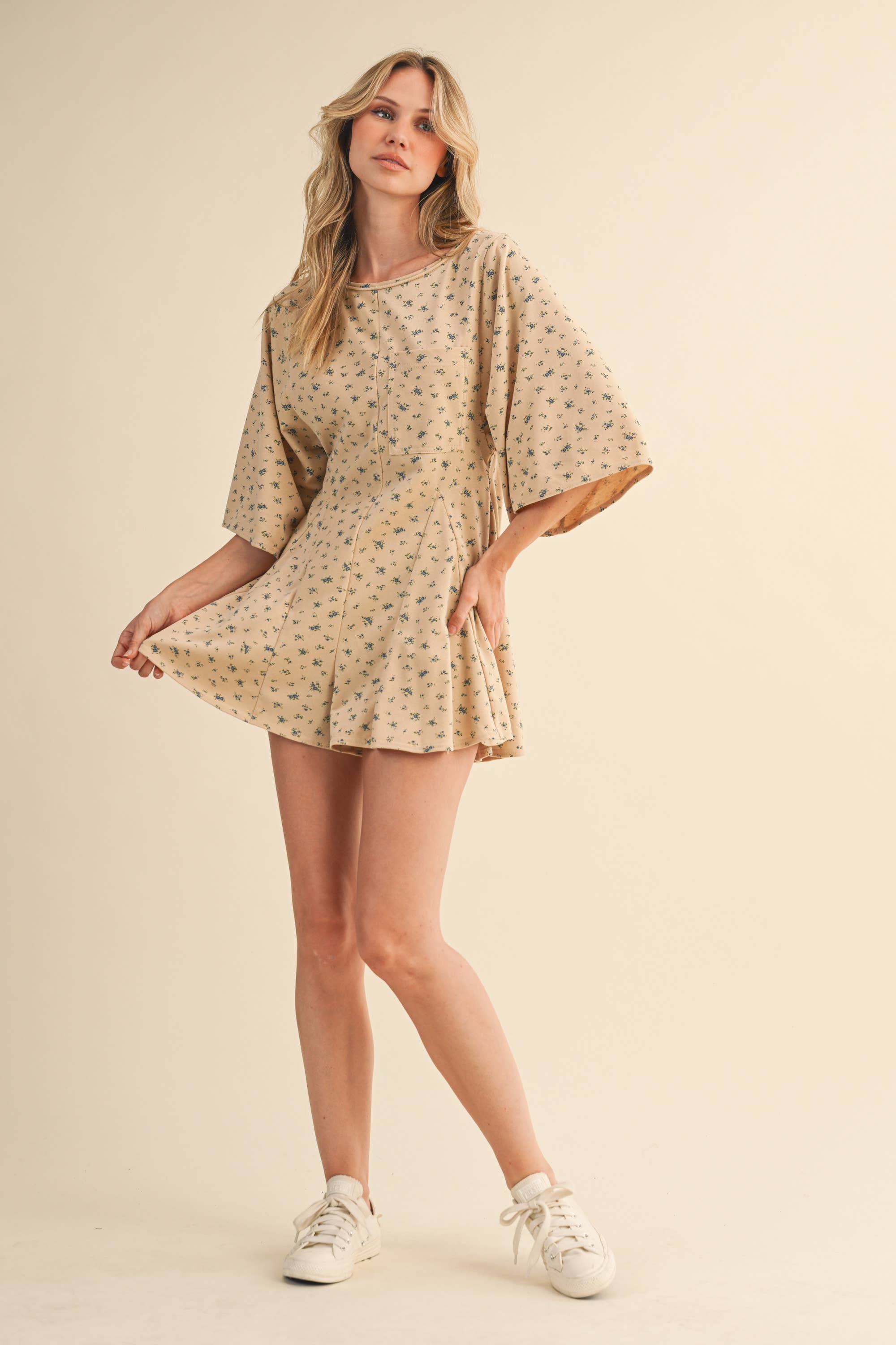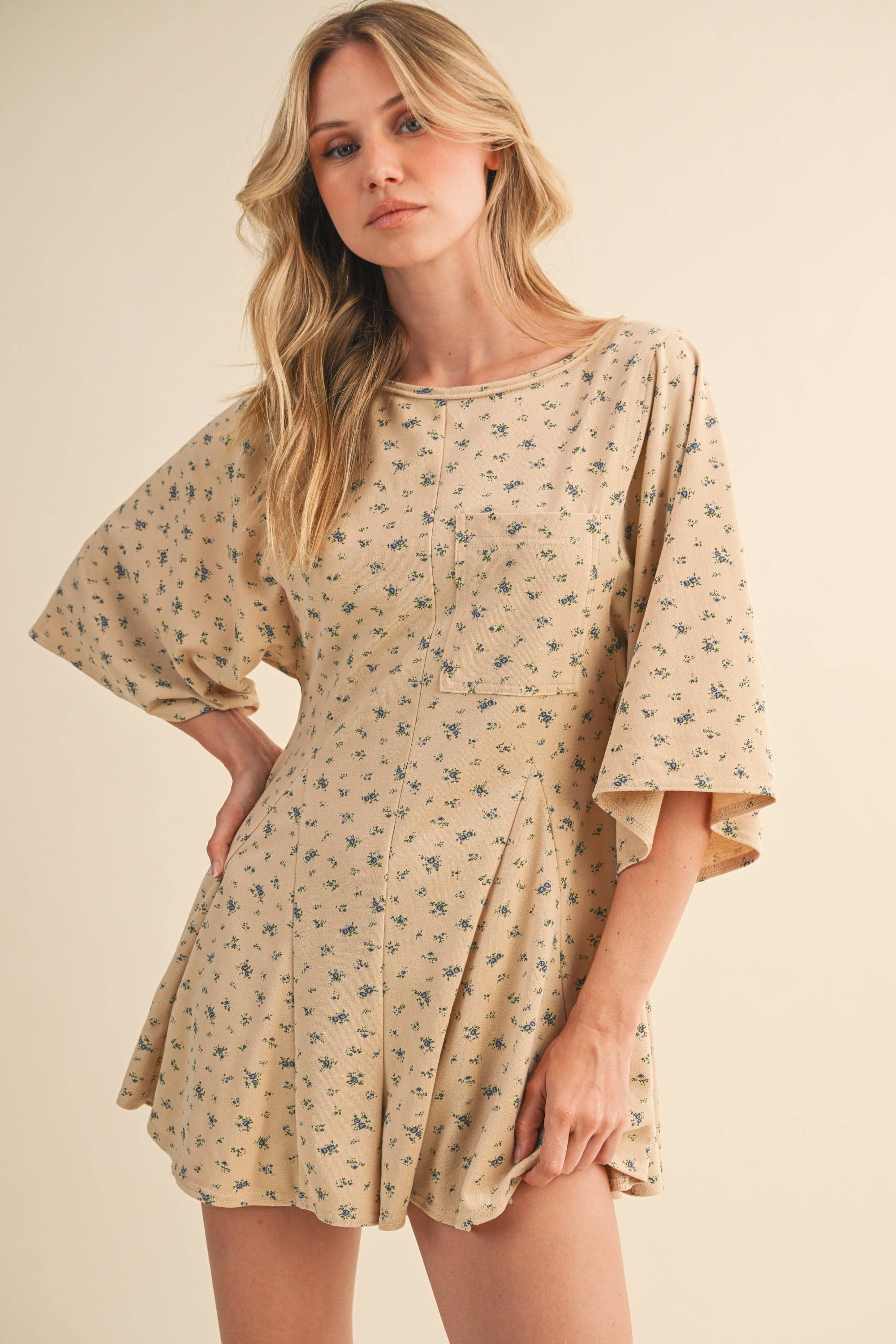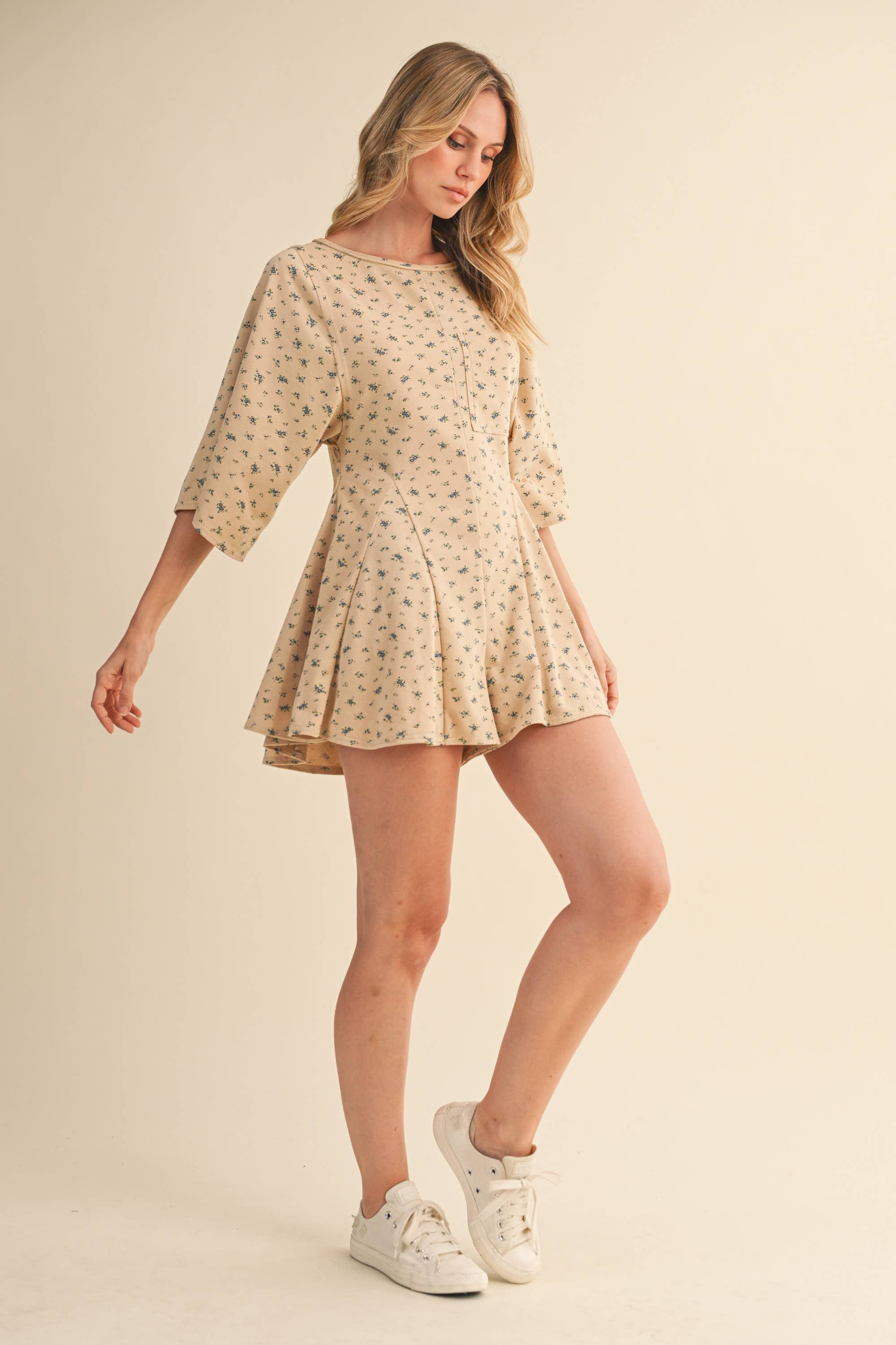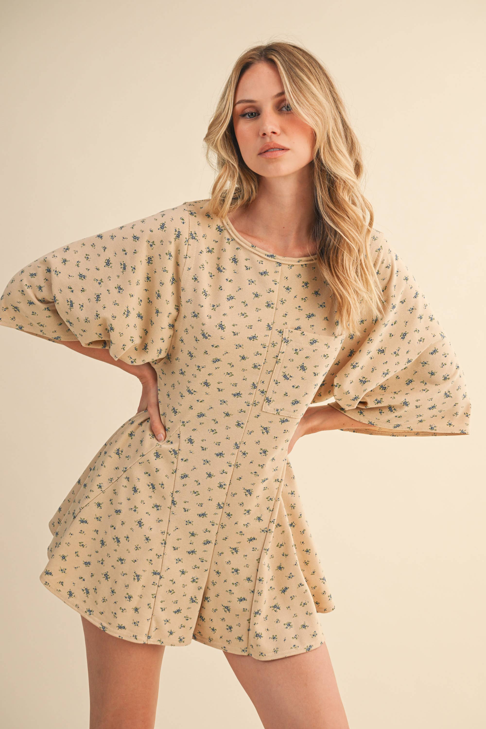 FLORAL FRONT POCKET GODET FLOWY ROMPER