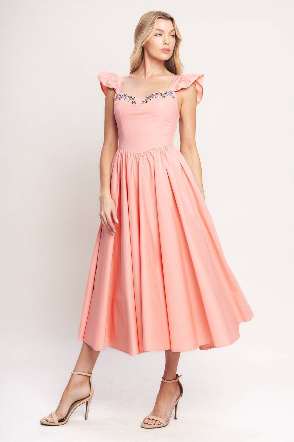 Sweet, feminine, and quietly stunning—this embroidered midi dress is the kind of piece that turns everyday moments into something a little more special. Designed in a soft dusty pink hue, it features a flattering sweetheart neckline with delicate floral embroidery that feels like it was handpicked just for you.