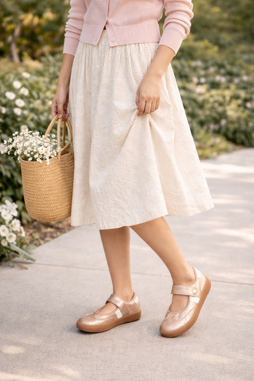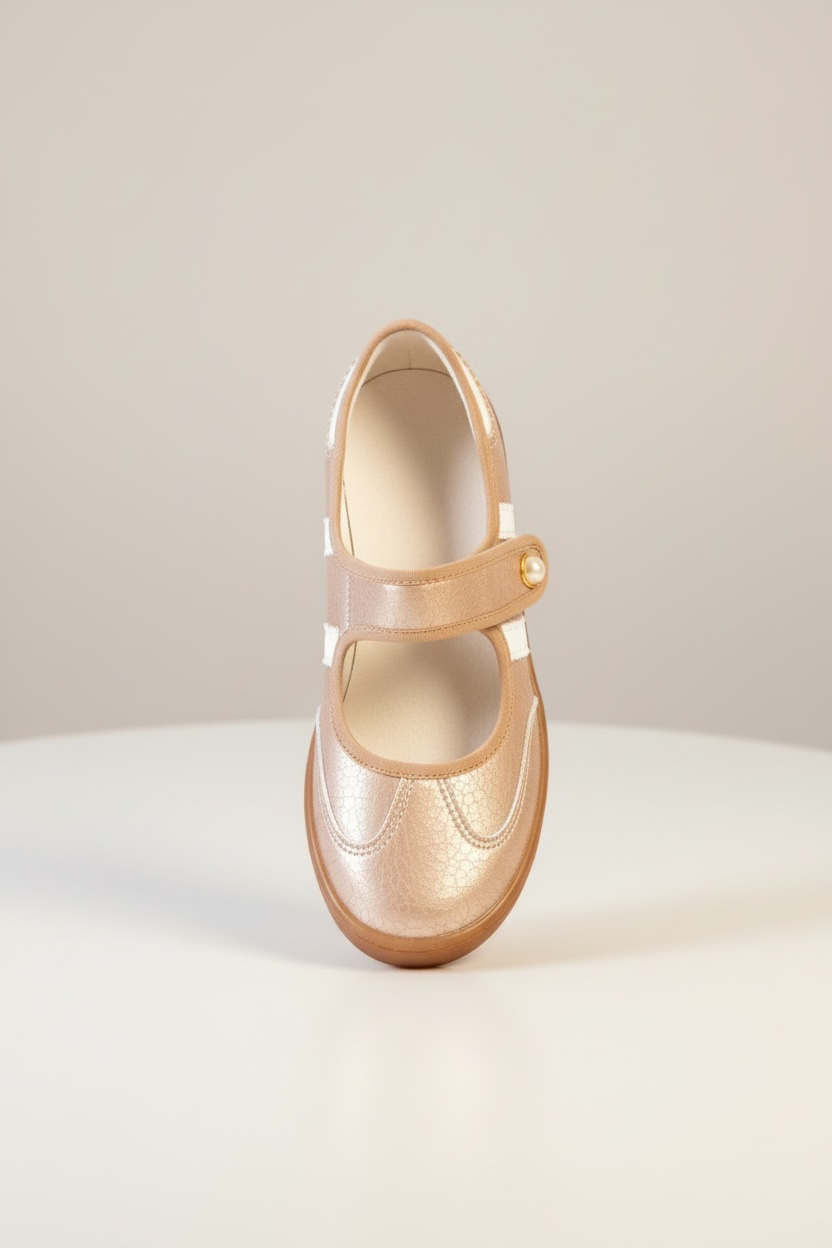 Meet the sneaker that does it all — the Jessie 7 Classic Mary Jane Sneaker by Maker’s Shoes. Designed with timeless Mary Jane styling and a modern streetwear edge, this rose gold metallic sneaker blends fashion, comfort, and everyday versatility. The secure Velcro strap allows for easy on-and-off wear while providing a snug, true-to-size fit that feels supportive without being restrictive.