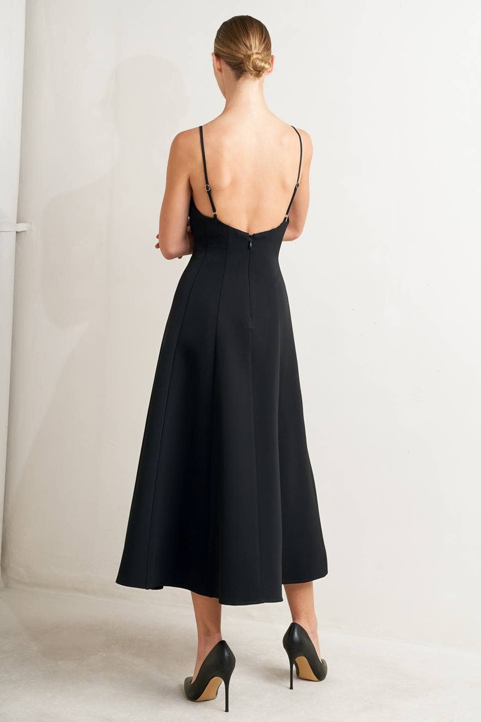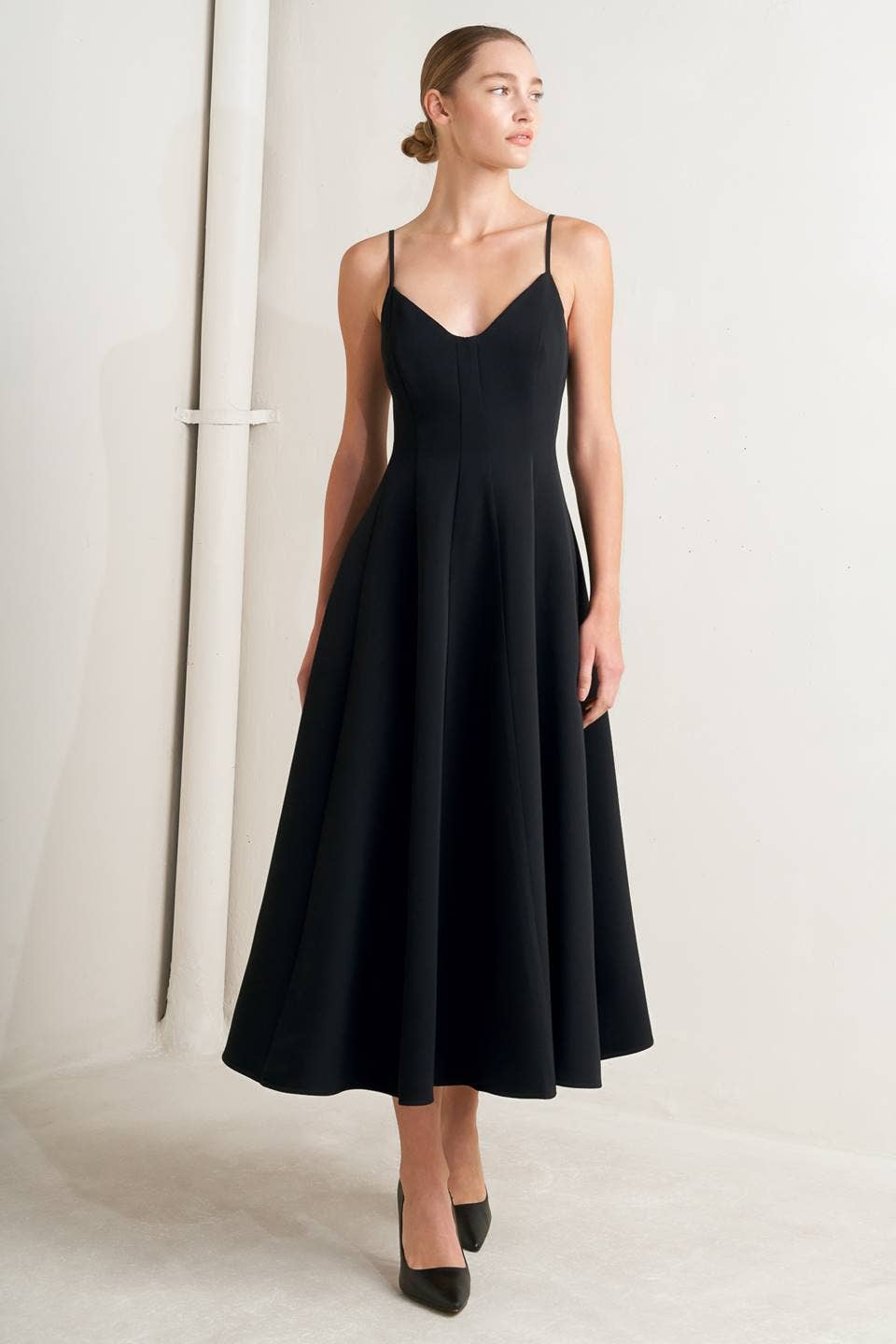 Clean lines, a flattering silhouette, and just the right amount of drama… this is the kind of dress that does all the talking for you. The Effortless Elegance Midi Dress features a sleek cami-style bodice that flows into a full circle skirt, creating that perfectly balanced, feminine shape that moves beautifully with every step.