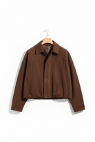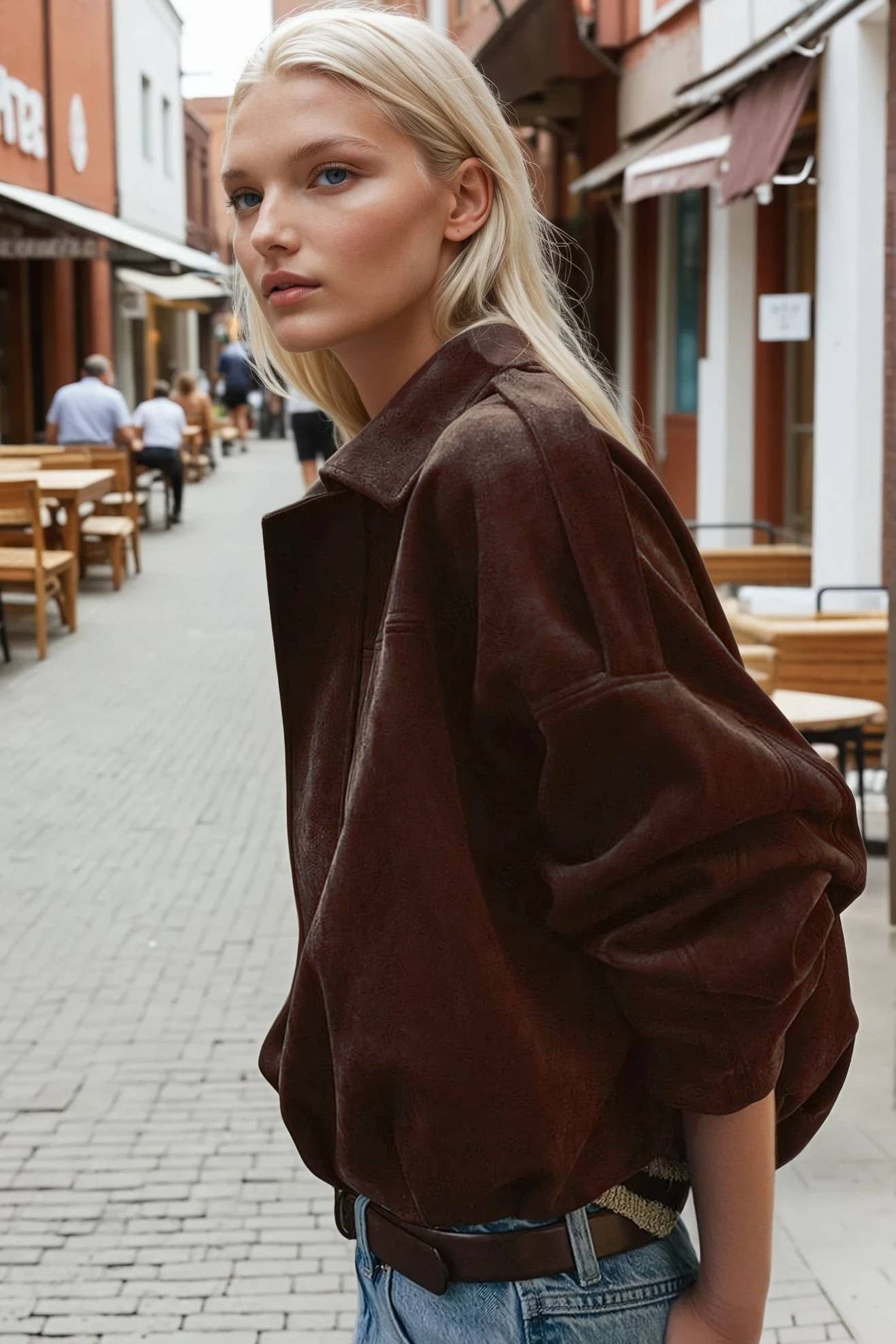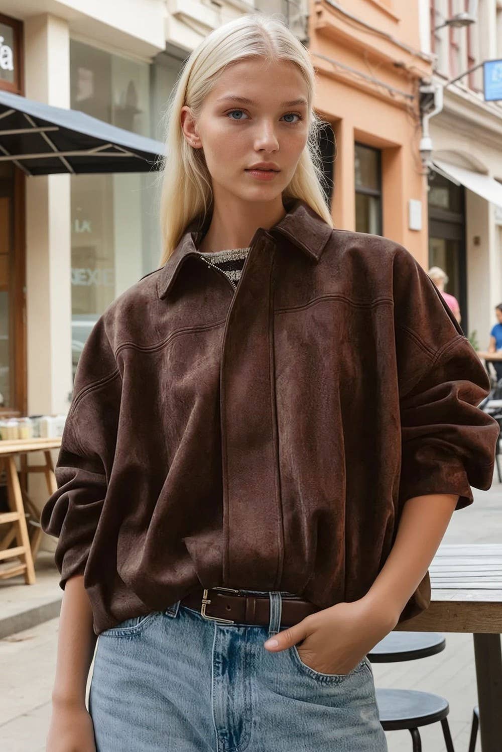The batwing sleeves create an effortlessly relaxed silhouette while adding a modern, fashion-forward edge. A classic zip-up front keeps the look clean and versatile, making this bomber jacket easy to dress up or down. Whether styled over dresses, knits, or denim, this brown suede bomber jacket transitions seamlessly from casual daytime looks to elevated evening outfits.