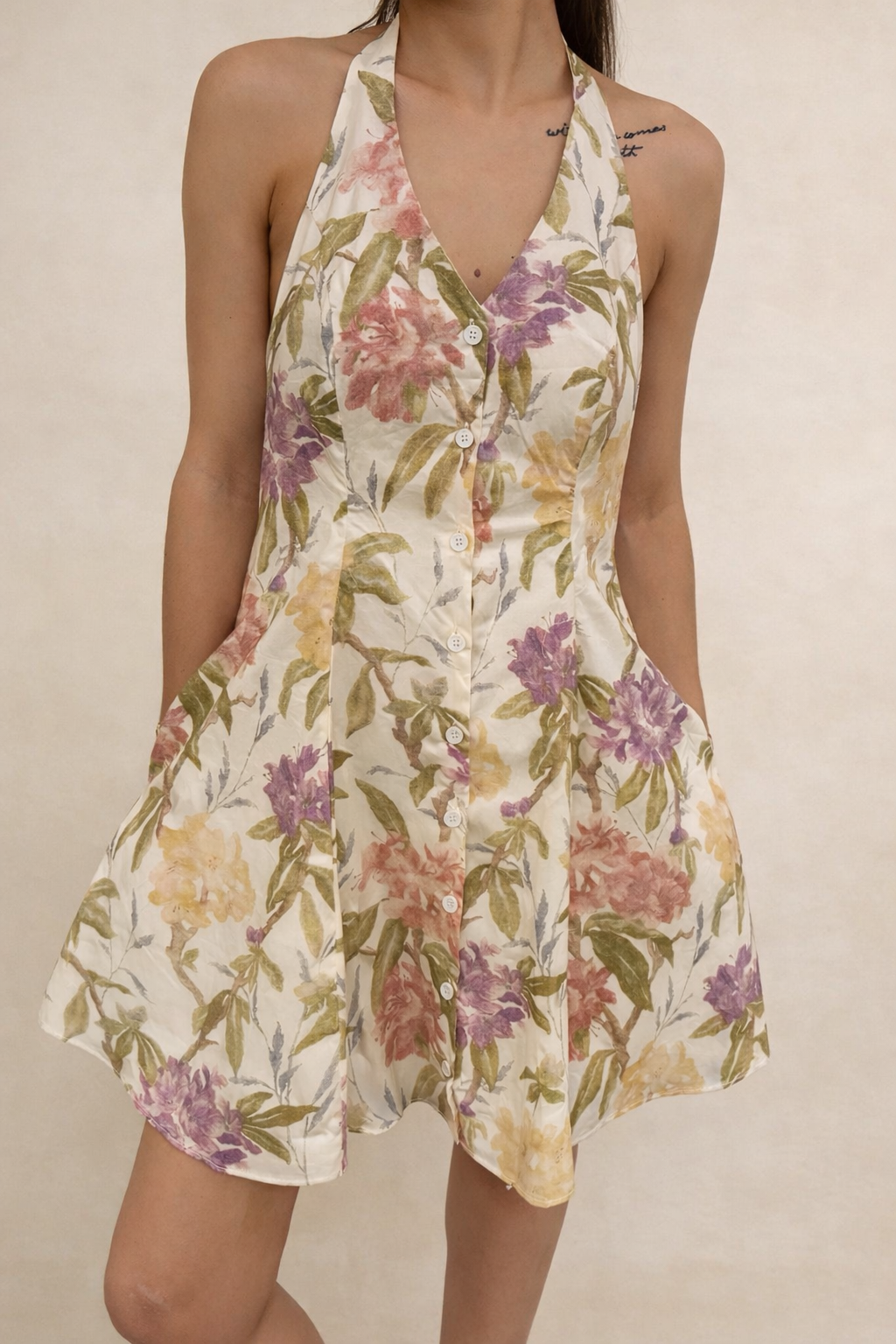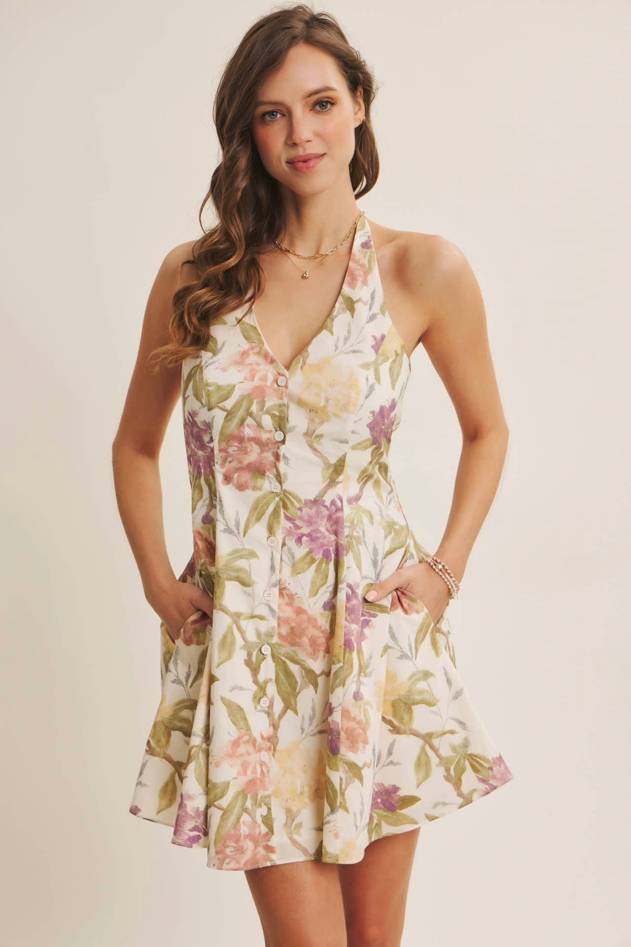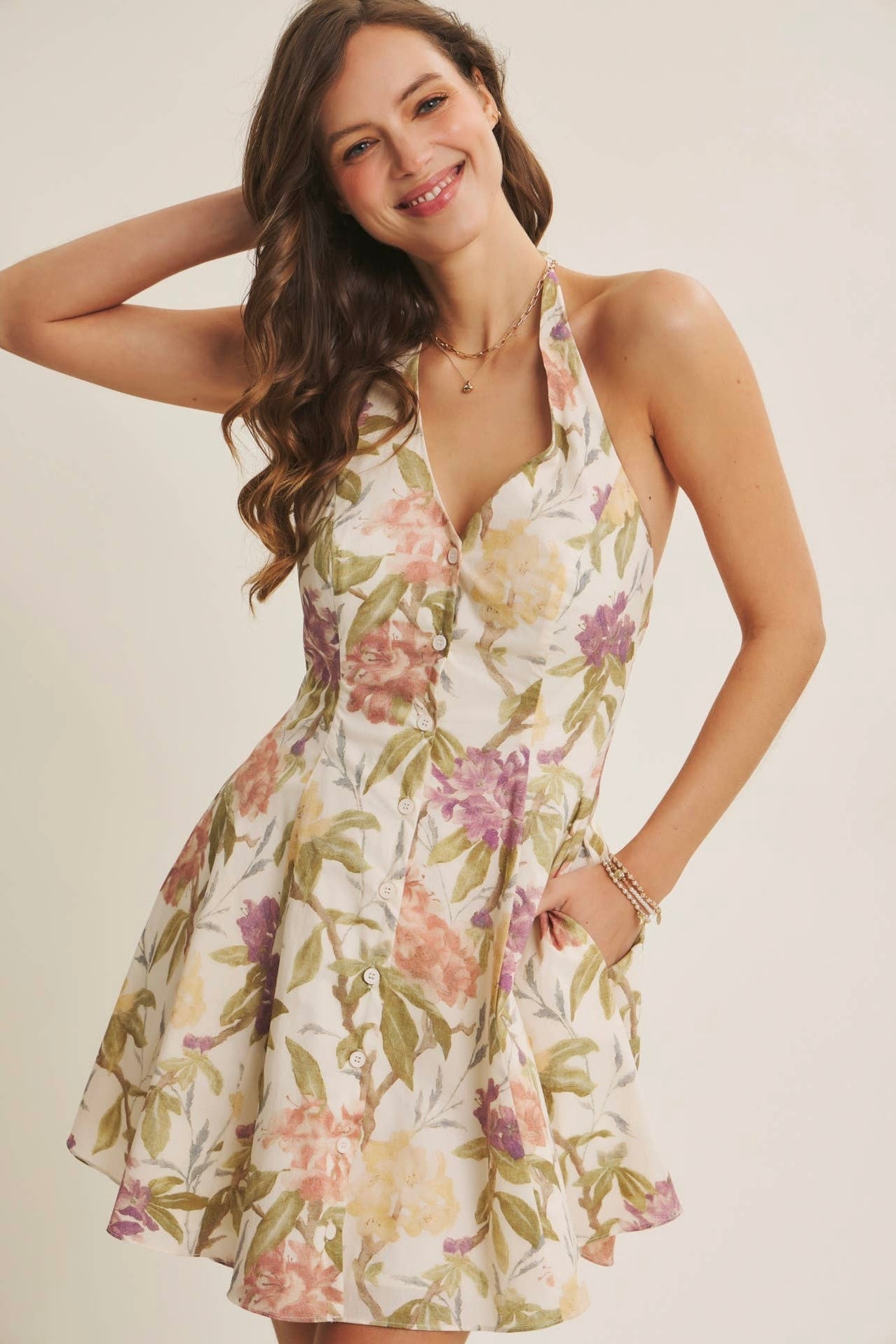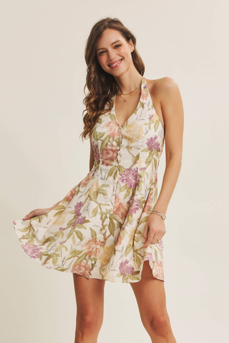 Soft florals and an easy, feminine silhouette come together in The Meadowlight Floral Halter Mini Dress by in February. Designed for warm days and carefree moments, this breezy mini features a flattering halter neckline and a classic button-down front that adds a touch of structure while keeping the look light and relaxed. The gently flared hem creates beautiful movement with every step, giving the dress an effortless flow that feels just as good as it looks.