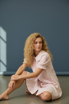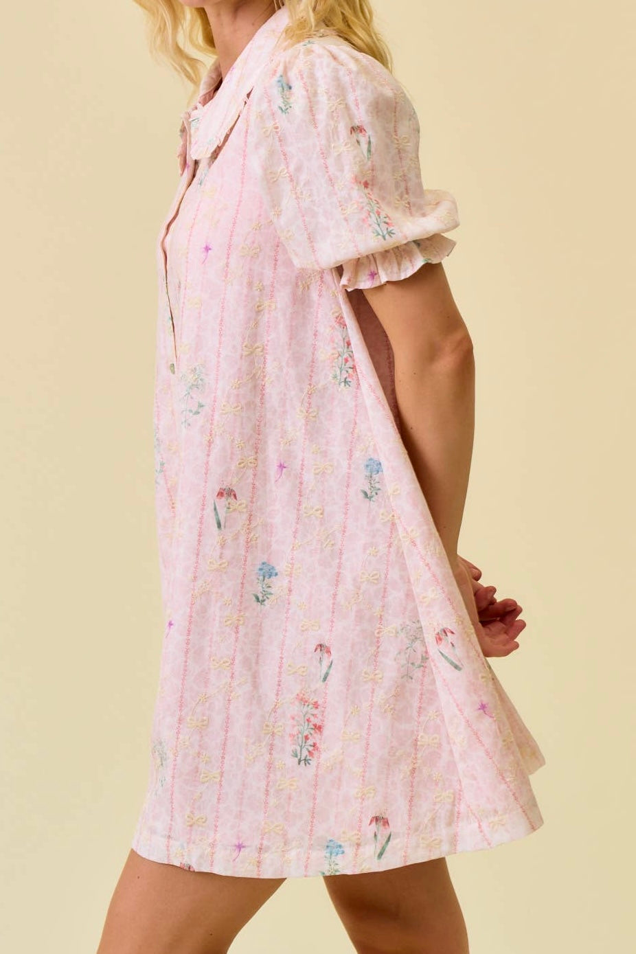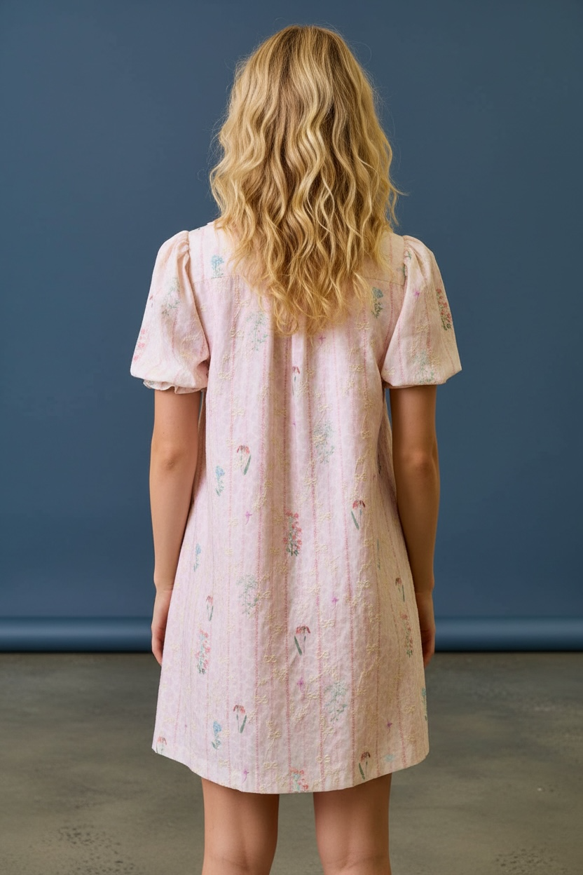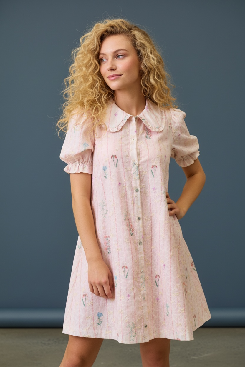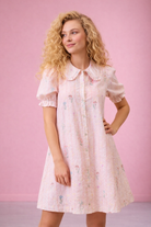 Delicate embroidery and soft pastel details add a touch of vintage charm, while the Peter Pan collar and functional button-front create a timeless look that never goes out of style. The puffed short sleeves with gentle gathers and elastic cuffs bring a soft, feminine finish that perfectly complements the airy shape of the dress.