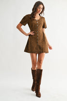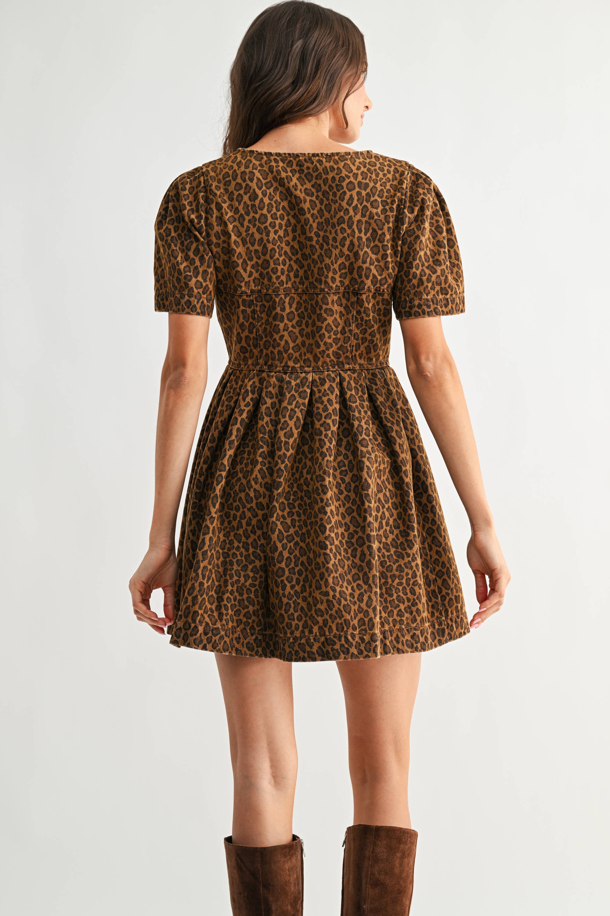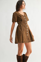 Make a bold yet beautifully feminine statement in the Untamed Grace Leopard Button-Front Mini Dress by Camellia. Designed in rich taupe and brown leopard tones, this eye-catching mini features a flattering fit-and-flare silhouette that moves with you while highlighting your waist in all the right places. The scoop neckline and soft short puff sleeves add a romantic touch, while the button-front closure brings in a hint of vintage-inspired charm.